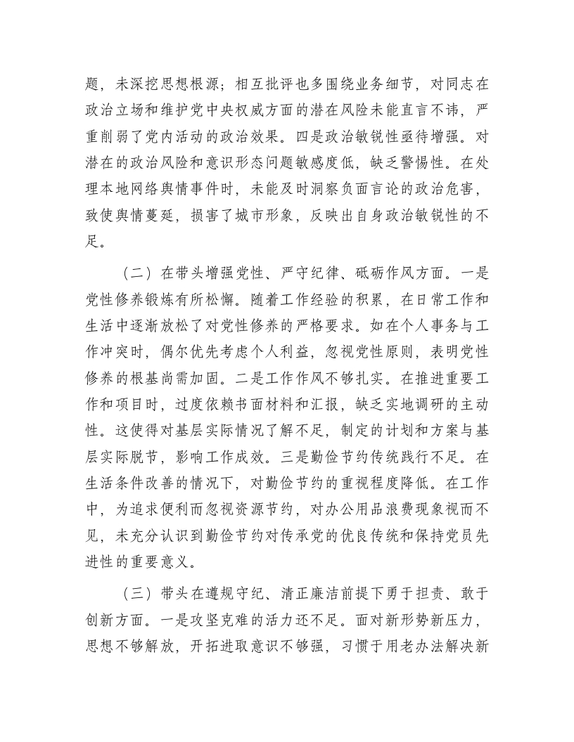 市直单位主要领导2024年度专题民主生活会对照检查材料(四个带头)按照局党委2024年度专题民主生活会实施方案的要求,我紧扣“四个带头”,紧密联系自身思想与工作实际,深入开展对照检查,深度剖析问题根源,并确定努力方向与整改措施。现将具体情况汇报如下。一、存在的主要问题(一)在带头严守政治纪律和政治规矩,维护党的团结统一方面。一是理论学习不够系统。尽管积极参加各类政治学习,但对坚守政治立场及维护党中央权威的知识学习零散无序,未形成完整的知识体系。这导致在实际工作中,对相关要求理解不深,执行时容易出现偏差,影响工作的政治导向。二是理论实践结合不紧密。在学习习近平新时代中国特色社会主义思想及党的方针政策时,虽能按时参与学习,但在学深悟透、学以致用方面存在明显差距。例如在单位的数字化转型项目中,未能有效运用党的创新理论指导实践,致使项目推进缓慢,未能达成预期效果。并且,在面对外界对党中央政策的恶意曲解和不当言论时,缺乏主动维护党中央权威的积极性,常采取回避态度,未及时予以有力驳斥。二是党内政治生活质量亟待提升。参与党内活动时,常陷入形式主义,重参与轻质量。如在民主生活会上,自我剖析浮于表面,仅提及常见问