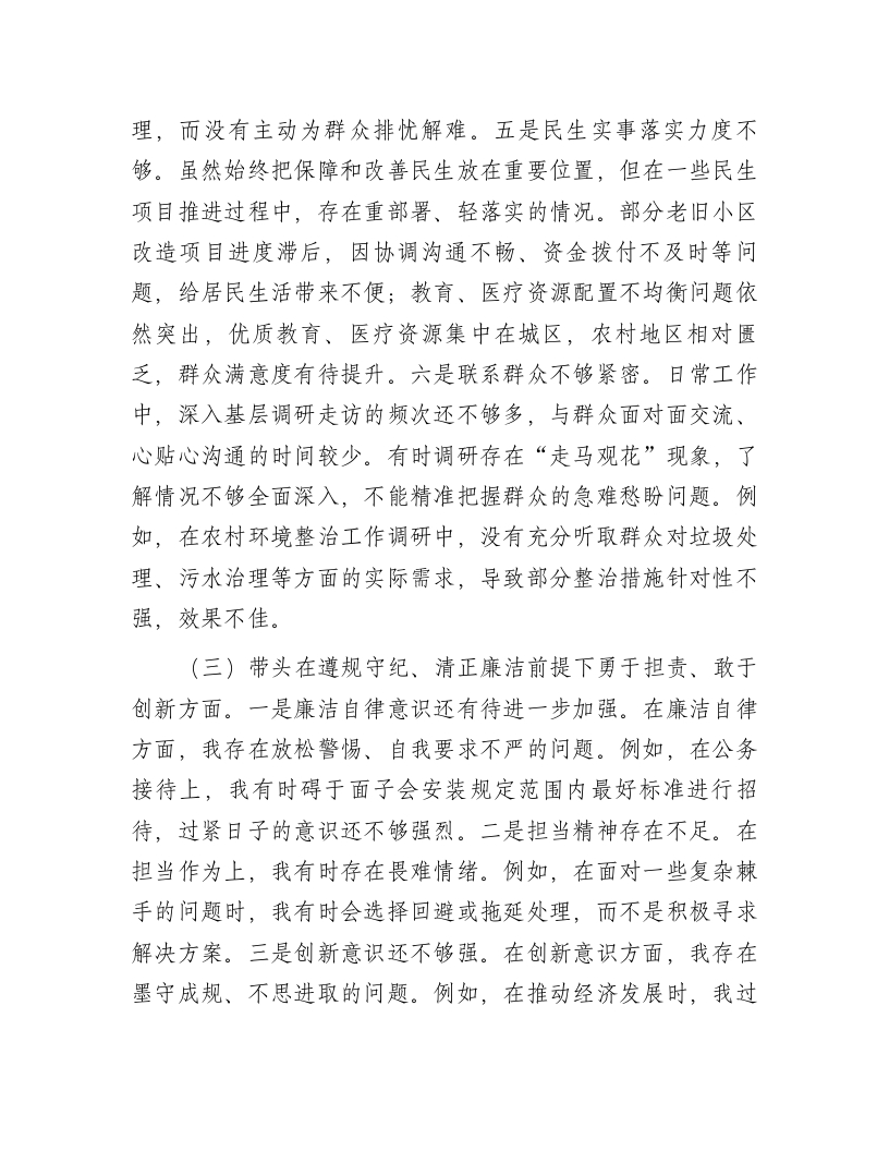 市直单位领导干部2024年度专题民主生活会对照检查材料(四个带头)根据市委关于召开2024年度民主生活会的相关要求和局党组工作部署,我紧扣本次民主生活会主题,结合自身实际情况,认真对照“四个带头”,全面深入查摆了自身存在的突出问题,认真分析了问题产生的原因,针对问题和原因,逐项明确了下一步整改措施。按照会议安排,现将个人对照检查情况汇报如下。一、存在的主要问题(一)在带头严守政治纪律和政治规矩,维护党的团结统一方面。一是政治理论学习不够深入。在理论学习上,我存在重形式轻内容的问题。虽然能够按时参加集体学习,但个人自学时间不足,对党的最新理论成果理解不够深刻。例如,在学习党的三中全会精神时,我只是粗略地浏览了辅导读本内容,没有深入研读和领会其中的精神实质。二是理想信念有所动摇。面对复杂多变的国内外形势,我在理想信念上有时会出现动摇。例如,在看到一些党员干部违纪违法的新闻时,我会产生“为什么他们会这样”的困惑,进而对自己的信仰产生一定的怀疑。三是政治敏锐性和鉴别力不强。在政治敏锐性和鉴别力方面,我有时存在麻痹大意的问题。例如,在社交媒体上,我偶尔会看到一些涉及政治敏感话题的言论,但我并没有及时