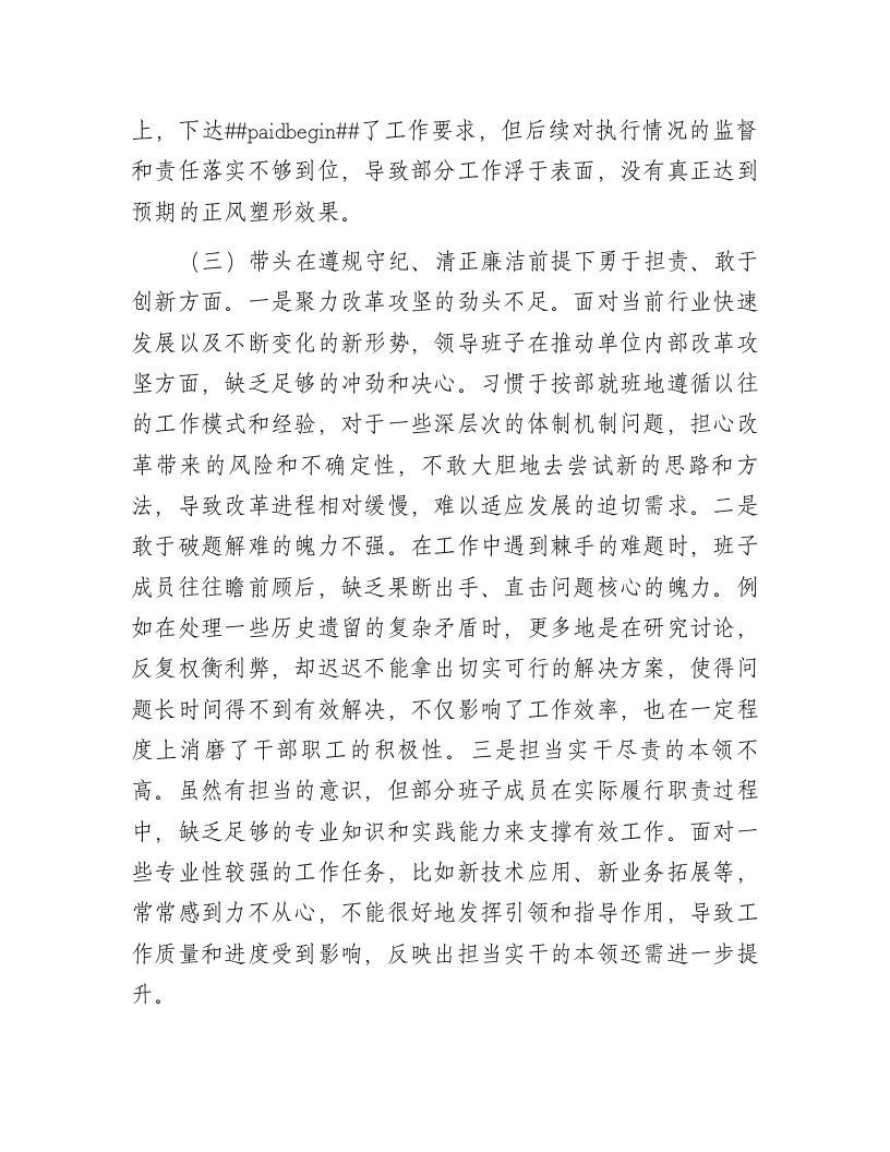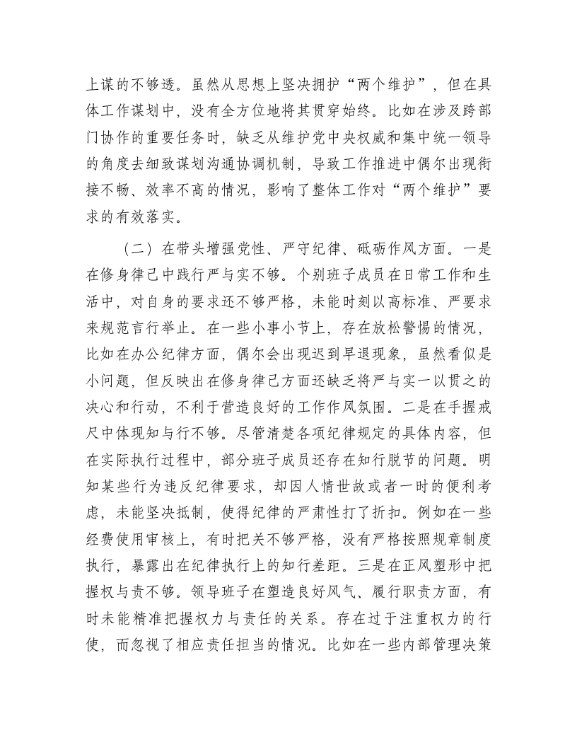 市直机关领导班子2024年度专题民主生活会对照检查材料(四个带头)按照市委《关于召开2024年度民主生活会的通知》有关要求,单位领导班子紧紧围绕本次民主生活会主题,结合实际情况,认真对照“四个带头”,全面深入查摆了工作中存在的突出问题,认真分析了问题产生的原因,逐项明确了下一步整改措施。按照会议安排,现将对照检查情况汇报如下。一、存在的主要问题(一)在带头严守政治纪律和政治规矩,维护党的团结统一方面。一是在捍卫“两个确立”上站的不够高。在实际工作中,部分班子成员虽然深知“两个确立”的重大意义,但在将其融入日常决策、工作部署等环节时,站位还不够高远。例如,在面对一些复杂的业务工作时,更多地着眼于具体事务的解决,未能充分从“两个确立”所蕴含的政治高度去统筹谋划,导致工作的政治引领性有时不够突出。二是在心怀“国之大者”上悟的不够深。对于关乎国家发展大局、人民根本利益的重大事项,班子成员在领悟其内涵与要求方面还有待加强。往往只是表面化地知晓一些重要政策和方向,却没有深入去挖掘其背后深层次的意义以及与本单位工作的紧密联系,使得在制定工作计划、推进重点项目时,不能很好地契合“国之大者”的要求,存在一定的脱节现象。三是在做到“两个维护”