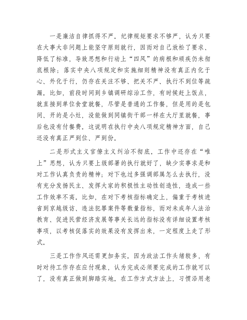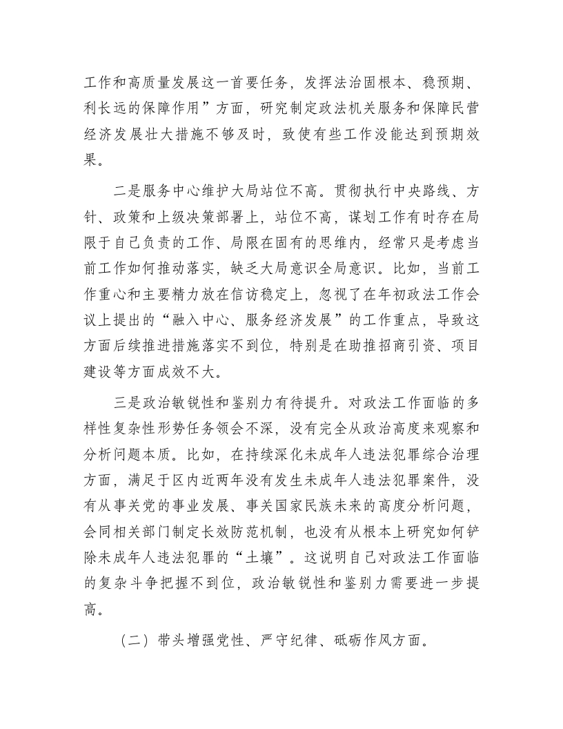 某区委常委、政法委书记2024年度民主生活会对照检查材料根据关于召开2024年度专题民主生活会方案安排,紧扣此次民主生活会主题,我认真学习领会习近平新时代中国特色社会主义思想和二十届三中全会精神,深入学习了习近平总书记关于党的建设的重要思想、关于党的自我革命的重要思想以及关于全面加强党的纪律建设的重要论述、关于全面深化改革的一系列新思想新观点新论断,认真学习《中国共产党纪律处分条例》等规定篇目。通过学习,进一步加深了认识理解,提高了政治觉悟。会前,与其他领导班子成员、分管负责人进行了谈心谈话,扎实开展自检自查,虚心听取了各位同志的意见建议;联系自身实际深入查找存在的差距和不足,剖析产生问题原因,制定改进措施,明确今后努力方向。现将对照检查情况报告如下:一、存在的突出问题(一)带头严守政治纪律和政治规矩,维护党的团结统一方面。一是落实上级决策部署不够及时主动。在贯彻落实上级决策部署上,由于自身能力水平的原因,从学习领会到消化吸收再到自觉执行的过程比较慢,导致有些认识和执行不够及时到位。比如,落实上级提出的“政法机关聚焦经济建设这一中心