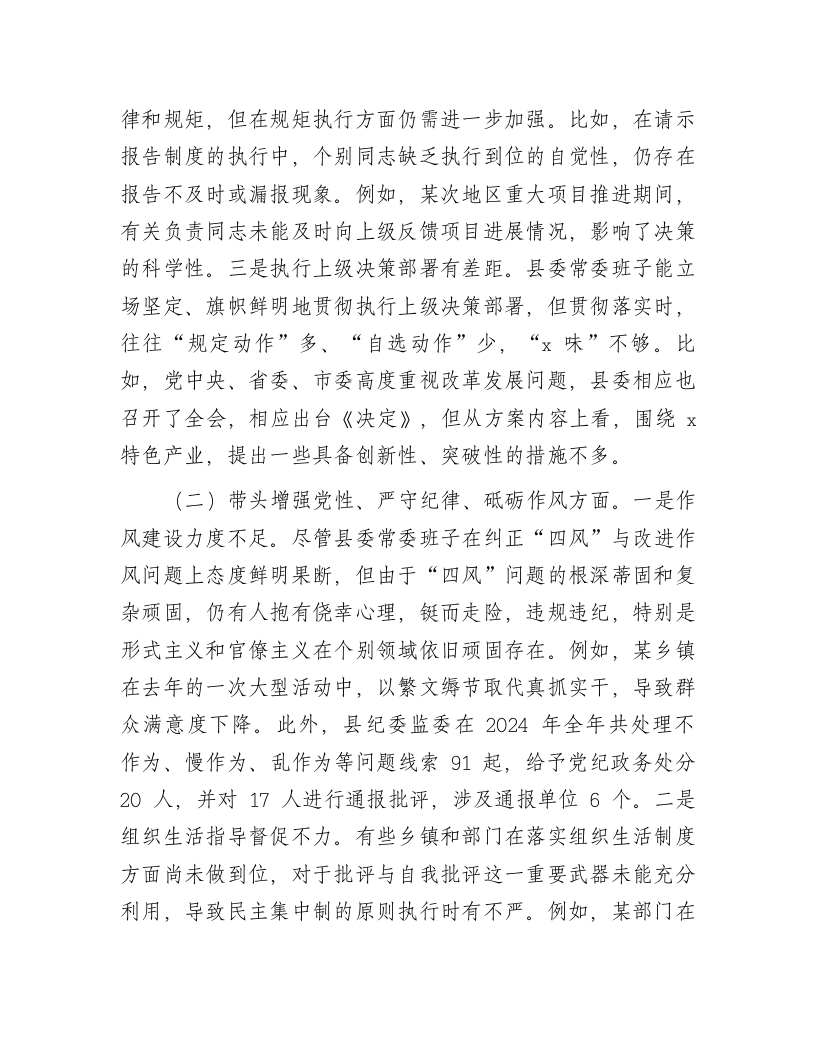 某县委常委会2024年度民主生活会对照检查材料按照《关于开好2024年度党员领导干部民主生活会的通知》部署要求,x县委常委班子围绕民主生活会主题,在会前通过集体学习、网络自学相结合的方式,深入学习习近平总书记重要讲话重要指示精神特别是习近平总书记回福建考察重要讲话重要指示批示精神,系统研读党章、《中国共产党纪律处分条例》等党内法规,深刻领会进一步全面深化改革的重大意义和战略部署,紧密联系工作实际,广泛征求意见、开展谈心谈话,对照5个方面,深入查找班子存在的问题,深刻剖析症结根源,进一步明确了下步努力方向和整改措施。现将班子对照检查情况汇报如下:一、存在问题及具体表现(一)带头严守政治纪律和政治规矩,维护党的团结统一方面。一是对“学思想”的重要性认识还不够。开展党纪学习教育以来,县委常委班子能够按照上级部署,精心组织、周密安排,推动学纪、学思想贯穿党纪学习教育教育始终。但是常停留于文件精神传达或法规条文的表面层次,未能深入挖掘其内涵和本质,导致学习内容零散,系统性和连贯性不足,特别是没有结合总书记关于党纪学习重要讲话重要指示来学习。二是没有严格遵守汇报纪律。县委常委班子尽管能够严明政治纪