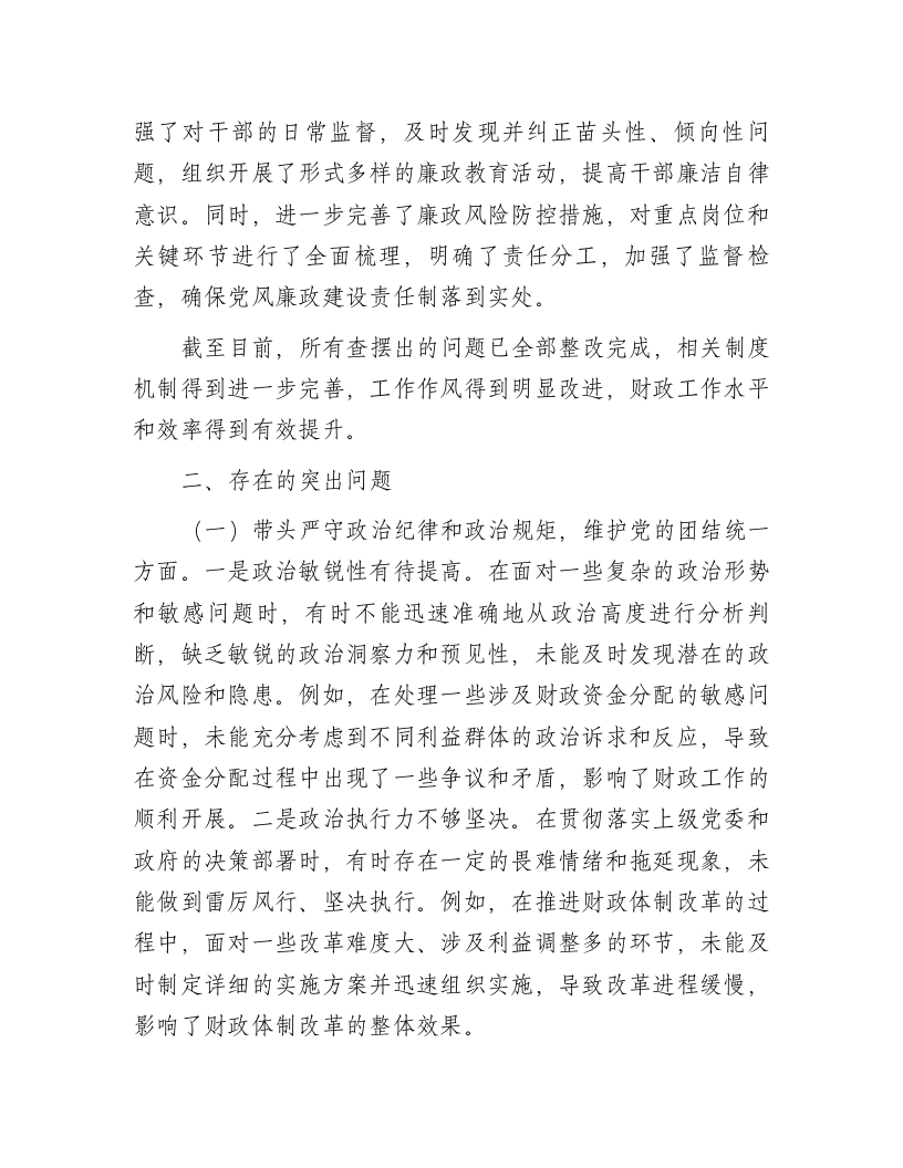 纪检组长2024年专题民主生活会个人对照材料(四个带头)按照局党委2024年度专题民主生活会实施方案,我围绕“四个带头”的重要要求,结合自身思想和工作实际,认真开展对照检查,深刻剖析问题根源,明确努力方向和整改措施。现将对照检查情况汇报如下:一、上年度民主生活会及巡察整改专题民主生活会查摆问题整改情况在上年度民主生活会上,我深入剖析自身存在的问题,主要集中在政治理论学习深度不足、监督执纪力度不够等方面。针对这些问题,我制定了详细整改措施,通过加强学习、加大监督检查力度等手段,取得了明显成效。政治理论学习方面,我坚持每天抽出固定时间学习党的二十大精神、习近平总书记关于财政工作的重要论述等,参加各类培训班、研讨会,理论水平和政策理解能力显著提升,能够更准确把握政策导向。监督执纪方面,我加大了对财政资金使用情况的监督检查力度,采取定期检查与不定期抽查相结合的方式,对发现的问题及时处理并严肃问责相关责任人,有效遏制了违规违纪行为的发生。在巡察整改专题民主生活会上,查摆出的问题包括对干部教育管理不到位、党风廉政建设责任制落实不够到位等。我加