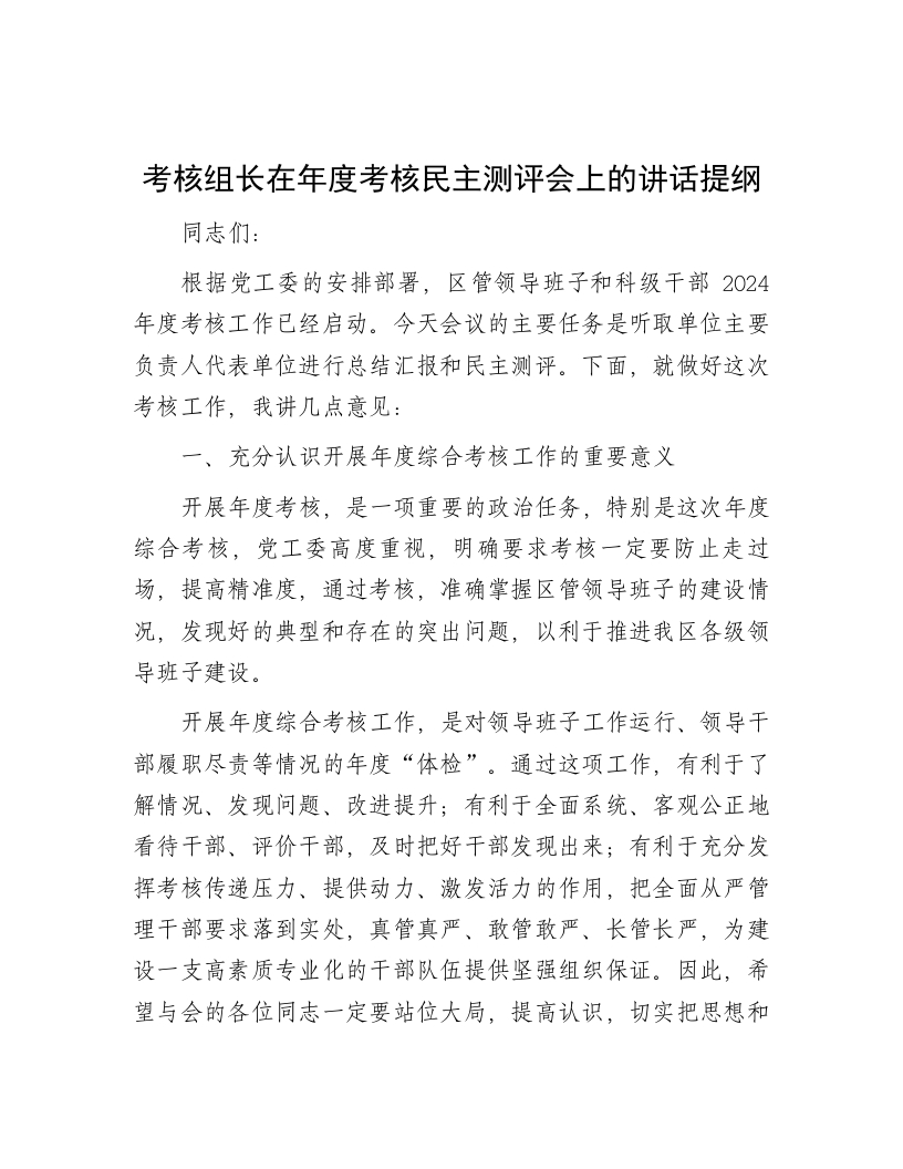 考核组长在年度考核民主测评会上的讲话提纲同志们:根据党工委的安排部署,区管领导班子和科级干部2024年度考核工作已经启动。今天会议的主要任务是听取单位主要负责人代表单位进行总结汇报和民主测评。下面,就做好这次考核工作,我讲几点意见:一、充分认识开展年度综合考核工作的重要意义开展年度考核,是一项重要的政治任务,特别是这次年度综合考核,党工委高度重视,明确要求考核一定要防止走过场,提高精准度,通过考核,准确掌握区管领导班子的建设情况,发现好的典型和存在的突出问题,以利于推进我区各级领导班子建设。开展年度综合考核工作,是对领导班子工作运行、领导干部履职尽责等情况的年度“体检”。通过这项工作,有利于了解情况、发现问题、改进提升;有利于全面系统、客观公正地看待干部、评价干部,及时把好干部发现出来;有利于充分发挥考核传递压力、提供动力、激发活力的作用,把全面从严管理干部要求落到实处,真管真严、敢管敢严、长管长严,为建设一支高素质专业化的干部队伍提供坚强组织保证。因此,希望与会的各位同志一定要站位大局,提高认识,切实把思想和