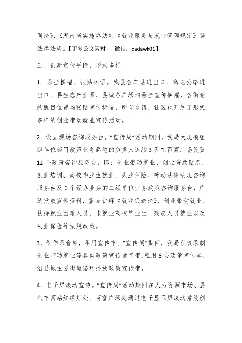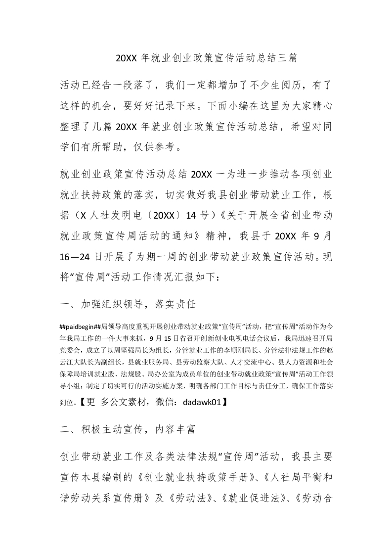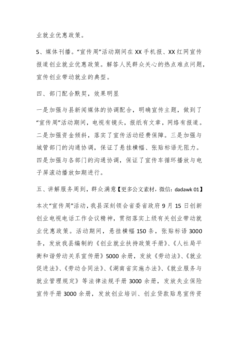 20XX年就业创业政策宣传活动总结三篇活动已经告一段落了,我们一定都增加了不少生阅历,有了这样的机会,要好好记录下来。下面小编在这里为大家精心整理了几篇20XX年就业创业政策宣传活动总结,希望对同学们有所帮助,仅供参考。就业创业政策宣传活动总结20XX一为进一步推动各项创业就业扶持政策的落实,切实做好我县创业带动就业工作,根据(X人社发明电〔20XX)14号)《关于开展全省创业带动就业政策宣传周活动的通知》精神,我县于20XX年9月16一24日开展了为期一周的创业带动就业政策宣传活动。现将“宣传周”活动工作情况汇报如下:一、加强组织领导,落实责任擗paidbegin#局领导高度重视开展创业带动就业政策“宣传周”活动,把“宣传周”活动作为今年我局工作的一件大事来抓,9月15日省召开创新创业电视电话会议后,我局迅速召开局党委会,成立了以周坚强局长为组长,分管就业工作的李顺刚局长、分管法律法规工作的赵云江大队长为副组长,县就业服务局、县劳动监察大队、人才交流中心、县人力资源和社会保障局培训就业股、法规股、局办公室为成员单位的创业带动就业政策“宣传周”活动工作领导小组:制定了切实可行的活动实施方案,明确各部门工作目标与责任分工,确保工作落实到位。【更多公文素材,微信:dadawk01】二、积极主动宣传,内容丰富创业带动就业工作及各类法律法规“宣传周”活动,我县主要宣传本县编制的《创业就业扶持政策手册》、《人社局平衡和谐劳动关系宣传册》及《劳动法》、《就业促进法》、《劳动合