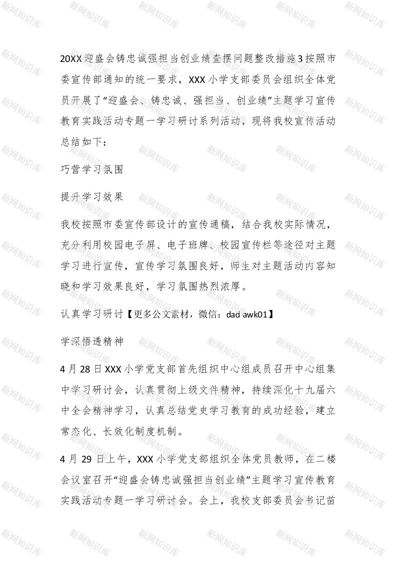 20XX迎盛会铸忠诚强担当创业绩查摆问题整改措施秉持勇于拼搏的精神,攻坚克难,使命呼唤担当,奋进正当其时,面向新征程,那么下边就是小编收集的一些20XX迎盛会铸忠诚强担当创业绩查摆问题整改措施相关内容,一起来看看吧!20XX迎盛会铸忠诚强担当创业绩查摆问题整改措施15月19日,X区香山道小学党支部召开“迎盛会、铸忠诚、强担当、创业绩”主题学习宣传教育实践活动工作专题研讨会。研讨会上石书记强调全体教师要在立行立改上持续用力。要对个人提出的问题再深入查摆,对相互指出的问题要再仔细对照,对马上可以解决的,要立行立改。查找问题要与教学工作相结合,把问题整改贯穿于工作始终,立足业务实际,常思干什么,常问怎么干,边干边改,干中求改,改中求变,以问题的整改、作风的转变促进教育教学能力的大提升。#paidbegin#全体党员教师研讨会后表示,这次学习研讨会既是一次专题教育的示范课,又是一次发扬批评与自我批评优良传统的实践课.要加强自身理论武装,进一步坚定理想信念,做到心中有坚守、行动见实效,做到严守党的政治纪律和政治规矩,坚定捍卫“两个确立”,坚决做到“两个维护”,牢牢把握正确方向。做到见微知著、谋划在先,增强工作的预见性、规律性、系统性,做到干在前,想在前。【更多公文素材,微信:dadawk01】20XX迎盛会铸忠诚强担当创业绩查摆问题整改措施24月26日下午,我校党支部开展了“迎盛会、铸忠诚、强担当、创业绩”主题学习宣传教育实践活动工作专题一学习研讨会。党支