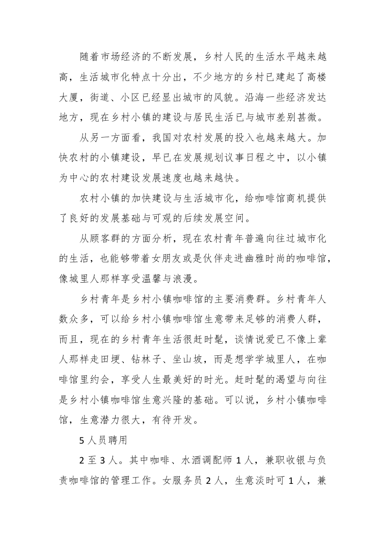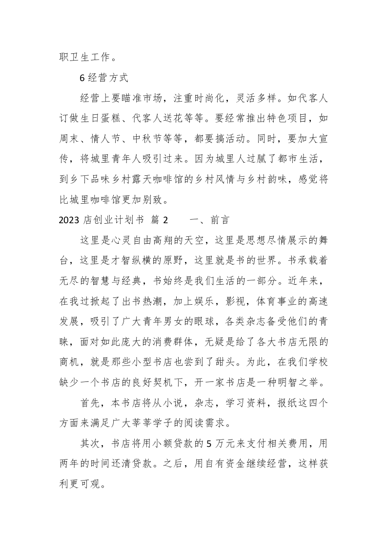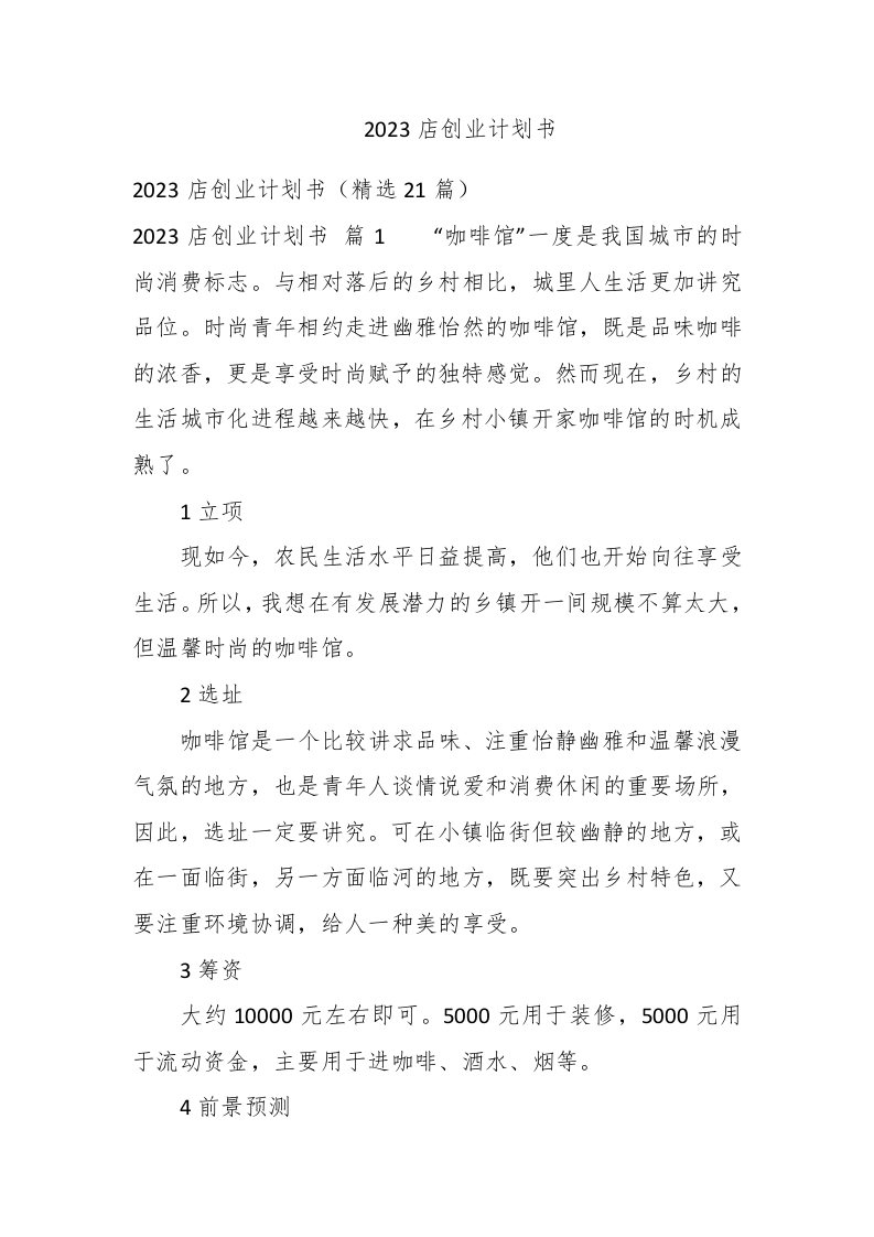 2023店创业计划书2023店创业计划书(精选21篇)2023店创业计划书篇1“咖啡馆”一度是我国城市的时尚消费标志。与相对落后的乡村相比,城里人生活更加讲究品位。时尚青年相约走进幽雅怡然的咖啡馆,既是品味咖啡的浓香,更是享受时尚赋予的独特感觉。然而现在,乡村的生活城市化进程越来越快,在乡村小镇开家咖啡馆的时机成熟了。1立项现如今,农民生活水平日益提高,他们也开始向往享受生活。所以,我想在有发展潜力的乡镇开一间规模不算太大,但温馨时尚的咖啡馆。2选址咖啡馆是一个比较讲求品味、注重怡静幽雅和温馨浪漫气氛的地方,也是青年人谈情说爱和消费休闲的重要场所,因此,选址一定要讲究。可在小镇临街但较幽静的地方,或在一面临街,另一方面临河的地方,既要突出乡村特色,又要注重环境协调,给人一种美的享受。3筹资大约10000元左右即可。5000元用于装修,5000元用于流动资金,主要用于进咖啡、酒水、烟等。4前景预测