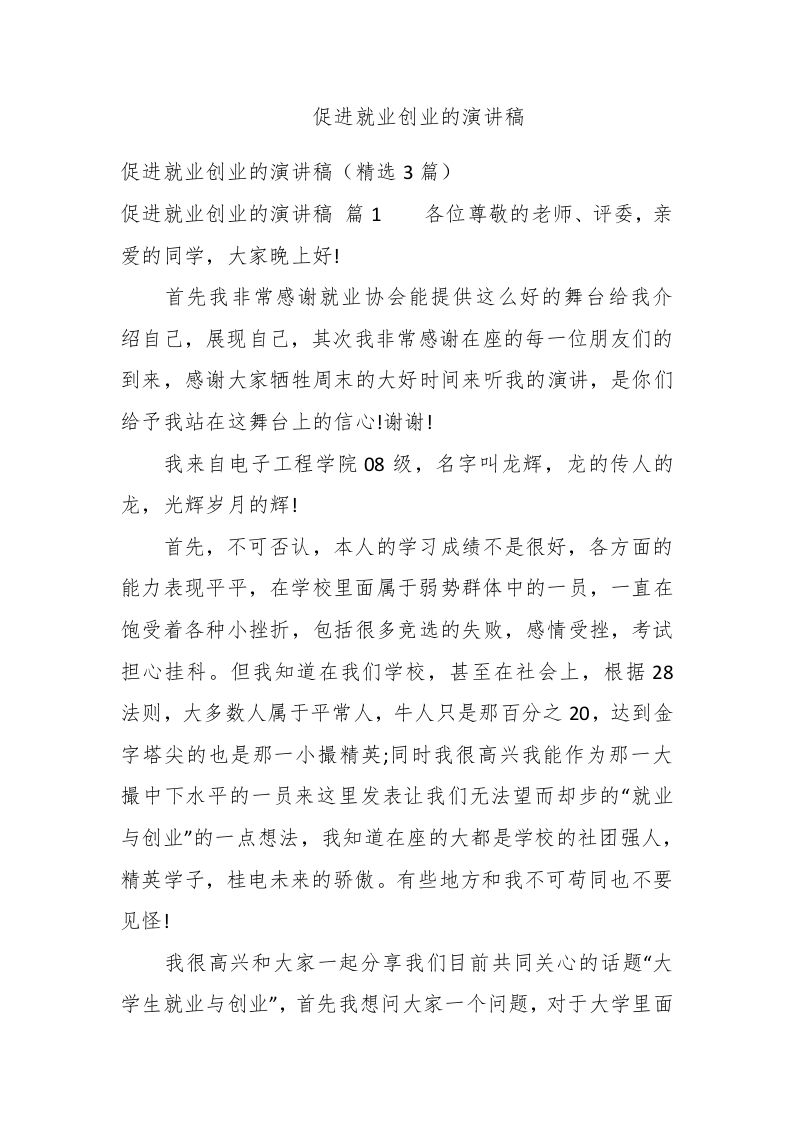 促进就业创业的演讲稿促进就业创业的演讲稿(精选3篇)促进就业创业的演讲稿篇1各位尊敬的老师、评委,亲爱的同学,大家晚上好!首先我非常感谢就业协会能提供这么好的舞台给我介绍自己,展现自己,其次我非常感谢在座的每一位朋友们的到来,感谢大家牺牲周末的大好时间来听我的演讲,是你们给予我站在这舞台上的信心!谢谢!我来自电子工程学院08级,名字叫龙辉,龙的传人的龙,光辉岁月的辉!首先,不可否认,本人的学习成绩不是很好,各方面的能力表现平平,在学校里面属于弱势群体中的一员,一直在饱受着各种小挫折,包括很多竞选的失败,感情受挫,考试担心挂科。但我知道在我们学校,甚至在社会上,根据28法则,大多数人属于平常人,牛人只是那百分之20,达到金字塔尖的也是那一小撮精英;同时我很高兴我能作为那一大撮中下水平的一员来这里发表让我们无法望而却步的“就业与创业”的一点想法,我知道在座的大都是学校的社团强人,精英学子,桂电未来的骄傲。有些地方和我不可苟同也不要见怪!我很高兴和大家一起分享我们目前共同关心的话题“大学生就业与创业”,首先我想问大家一个问题,对于大学里面
