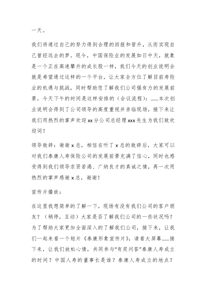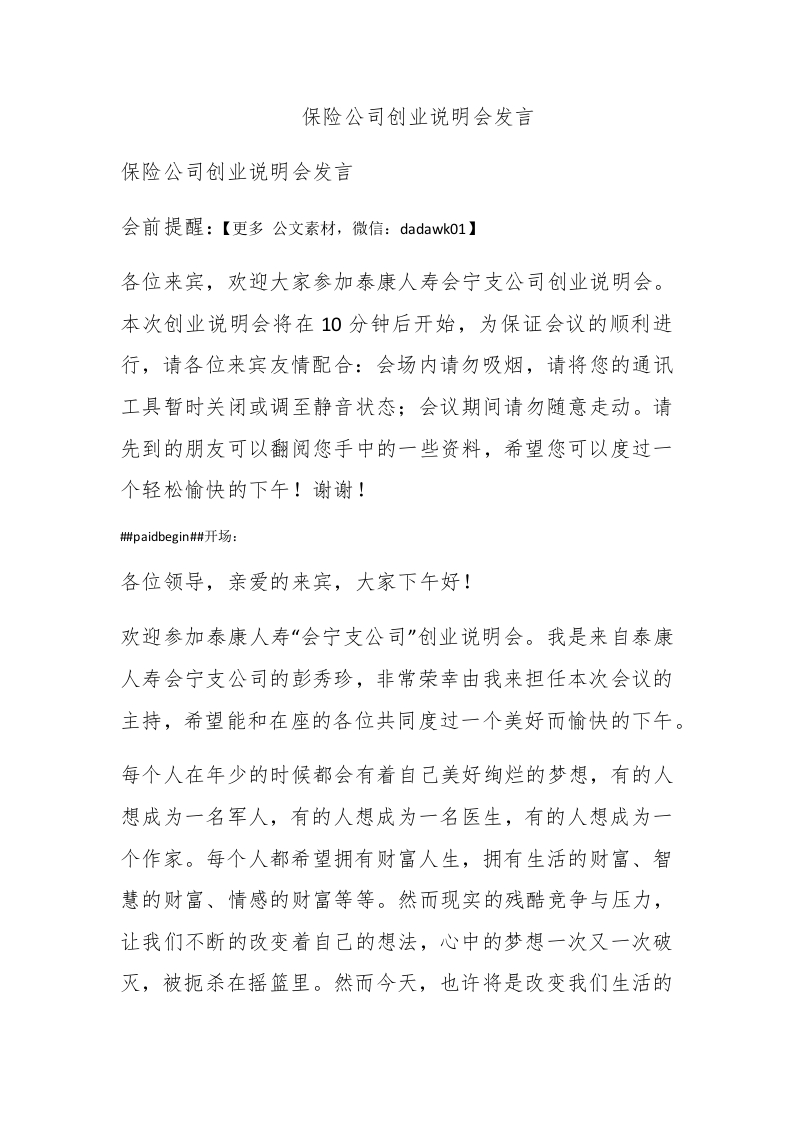 保险公司创业说明会发言保险公司创业说明会发言会前提醒:【更多公文素材,微信:dadawk01】各位来宾,欢迎大家参加泰康人寿会宁支公司创业说明会。本次创业说明会将在10分钟后开始,为保证会议的顺利进行,请各位来宾友情配合:会场内请勿吸烟,请将您的通讯工具暂时关闭或调至静音状态;会议期间请勿随意走动。请先到的朋友可以翻阅您手中的一些资料,希望您可以度过一个轻松愉快的下午!谢谢!郴paidbegin#开场:各位领导,亲爱的来宾,大家下午好!欢迎参加泰康人寿“会宁支公司”创业说明会。我是来自泰康人寿会宁支公司的彭秀珍,非常荣幸由我来担任本次会议的主持,希望能和在座的各位共同度过一个美好而愉快的下午。每个人在年少的时候都会有着自己美好绚烂的梦想,有的人想成为一名军人,有的人想成为一名医生,有的人想成为一个作家。每个人都希望拥有财富人生,拥有生活的财富、智慧的财富、情感的财富等等。然而现实的残酷竞争与压力,让我们不断的改变着自己的想法,心中的梦想一次又一次破灭,被扼杀在摇篮里。然而今天,也许将是改变我们生活的