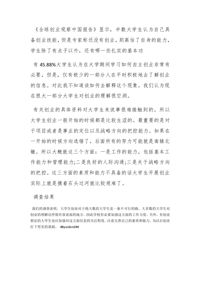 关于大学生创业意识和创业能力调查报告如今大学生创业问题受到我国各界的关注。而且现在大学生的就业情况并不容乐观,大学生创业对即将面临工作的大学生是一条值得考虑的出路,但是现在社会上对大学生创业的褒贬不一,很多人认为大学生刚出校门就开始创业是盲目的,而且缺乏创业的意识和能力。因此我们开展了一次大学生创业意识和创业能力调查活动。由于交际的缘故填写问卷的人员中以理工科学校为主,其次09届和10届的大学生是主要的被调查群体。现状与存在的问题:由此可见,就业的形式不容乐观,因此,创业这一出路就出现在越来越多的毕业生的眼中。在调查中有57.22%的人表示,在毕业后有创业的打算。【更多公文素材,微信:dadawk01】郴paidbegin#主题:创业其实是以新的生产力导入的方式开展一段事业。创业和以前的谋生不太一样,所以对大学生能力要求比较高。第一,要有一定的工作技能,也就是说你要能够协调一些人际关系,能够有一些基本的管理手段、管理方法;第二,要有良好的人际沟通能力,比如在对内有员工团结问题,对外涉及到和工商、税务以及各个社会组织打交道的能力。