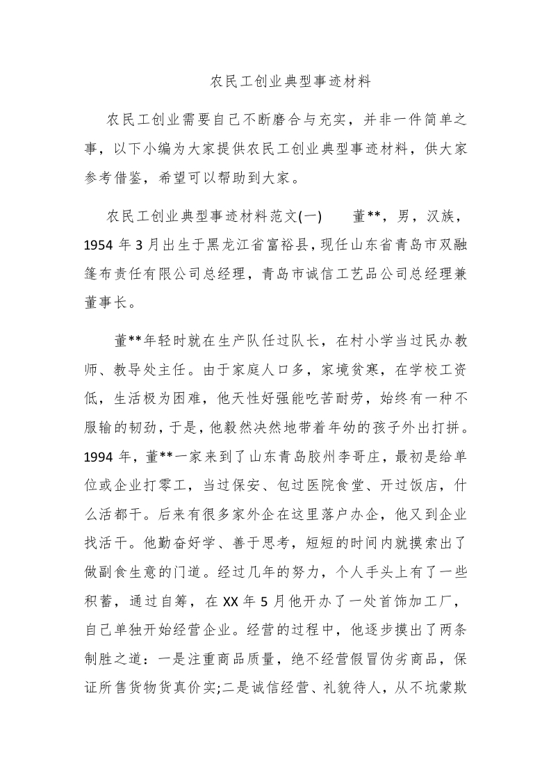 农民工创业典型事迹材料农民工创业需要自己不断磨合与充实,并非一件简单之事,以下小编为大家提供农民工创业典型事迹材料,供大家参考借鉴,希望可以帮助到大家。农民工创业典型事迹材料范文(一)董*,男,汉族,1954年3月出生于黑龙江省富裕县,现任山东省青岛市双融篷布责任有限公司总经理,青岛市诚信工艺品公司总经理兼董事长。董**年轻时就在生产队任过队长,在村小学当过民办教师、教导处主任。由于家庭人口多,家境贫寒,在学校工资低,生活极为困难,他天性好强能吃苦耐劳,始终有一种不服输的韧劲,于是,他毅然决然地带着年幼的孩子外出打拼。1994年,董*一家来到了山东青岛胶州李哥庄,最初是给单位或企业打零工,当过保安、包过医院食堂、开过饭店,什么活都干。后来有很多家外企在这里落户办企,他又到企业找活干。他勤奋好学、善于思考,短短的时间内就摸索出了做副食生意的门道。经过几年的努力,个人手头上有了一些积蓄,通过自筹,在X年5月他开办了一处首饰加工厂,自己单独开始经营企业。经营的过程中,他逐步摸出了两条制胜之道:一是注重商品质量,绝不经营假冒伪劣商品,保证所售货物货真价实;二是诚信经营、礼貌待人,从不坑蒙欺