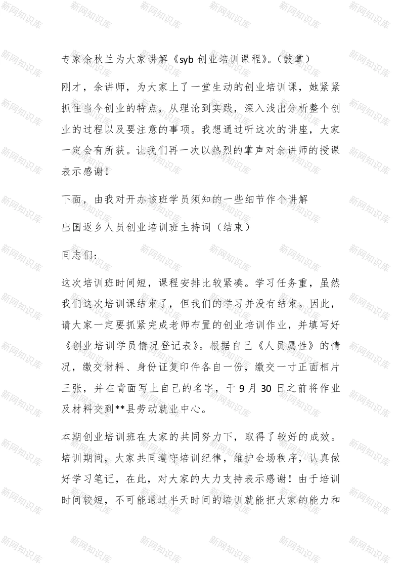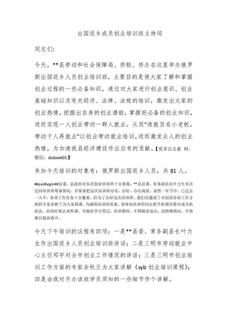 出国返乡成员创业培训班主持词同志们:今天,**县劳动和社会保障局、侨联、侨办在这里举办俄罗斯出国返乡人员创业培训班,主要目的是使大家了解和掌握创业过程的一些必备知识,通过对大家进行创业意识、创业基础知识以及有关经济、法律、法规的培训,激发出大家的创业热情,挖掘出自身的创业潜能,掌握好必备的创业知识,进而实现一人创业带动一群人就业。从而“造就百名小老板,带动千人再就业”以创业带动就业培训,进而激发众人的创业热情,为加速我县经济建设作出应有的贡献。【更多公文素材,微信:dadawk01】参加今天培训的对象有:俄罗斯出国返乡人员,共81人。郴paidbegin#县委、县政府对本次创业培训班十分重视,*县县委、常务副县长叶力生多次过问培训班筹备情况,并要求把这次培训班办实、办好、办出成效。虽然一年当中,己过去一大半,各项工作任务十分繁重,但为了办好这次培训班,我们还邀请了市创业培训工作方面的专家余秋兰为大家授课。为确保培训的质量,请参加培训的同志把手机调至静音或关机状态。培训时要认真听课,并做好学习笔记,培训期间,不得随意进出:没特殊情况,不得擅自提前离开。今天下午培训的议程有四项:一是*县委、常务副县长叶力生作出国返乡人员创业培训班讲话;二是三明市劳动就业中心主任邓宇对全市创业工作情况的讲话;三是三明市创业培训工作方面的专家余秋兰为大家讲解《syb创业培训课程》:四是由我对开办该班学员须知的一些细节作个讲解。