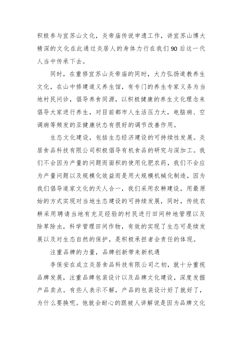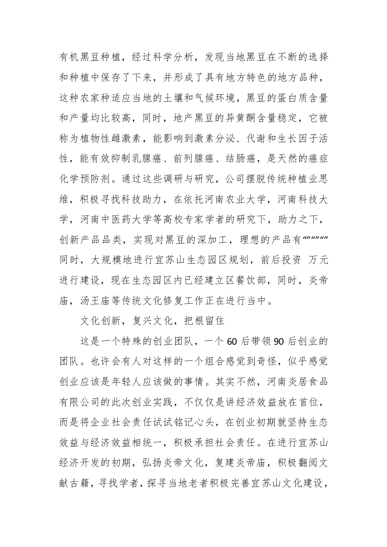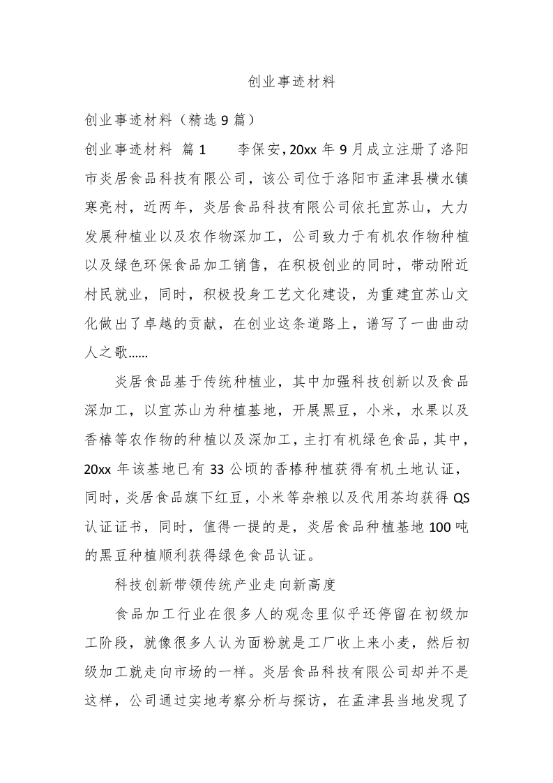 创业事迹材料创业事迹材料(精选9篇)创业事迹材料篇1李保安,20xx年9月成立注册了洛阳市炎居食品科技有限公司,该公司位于洛阳市孟津县横水镇寒亮村,近两年,炎居食品科技有限公司依托宜苏山,大力发展种植业以及农作物深加工,公司致力于有机农作物种植以及绿色环保食品加工销售,在积极创业的同时,带动附近村民就业,同时,积极投身工艺文化建设,为重建宜苏山文化做出了卓越的贡献,在创业这条道路上,谱写了一曲曲动人之歌炎居食品基于传统种植业,其中加强科技创新以及食品深加工,以宜苏山为种植基地,开展黑豆,小米,水果以及香椿等农作物的种植以及深加工,主打有机绿色食品,其中,20xx年该基地已有33公顷的香椿种植获得有机土地认证,同时,炎居食品旗下红豆,小米等杂粮以及代用茶均获得QS认证证书,同时,值得一提的是,炎居食品种植基地100吨的黑豆种植顺利获得绿色食品认证。科技创新带领传统产业走向新高度食品加工行业在很多人的观念里似乎还停留在初级加工阶段,就像很多人认为面粉就是工厂收上来小麦,然后初级加工就走向市场的一样。炎居食品科技有限公司却并不是这样,公司通过实地考察分析与探访,在孟津县当地发现了