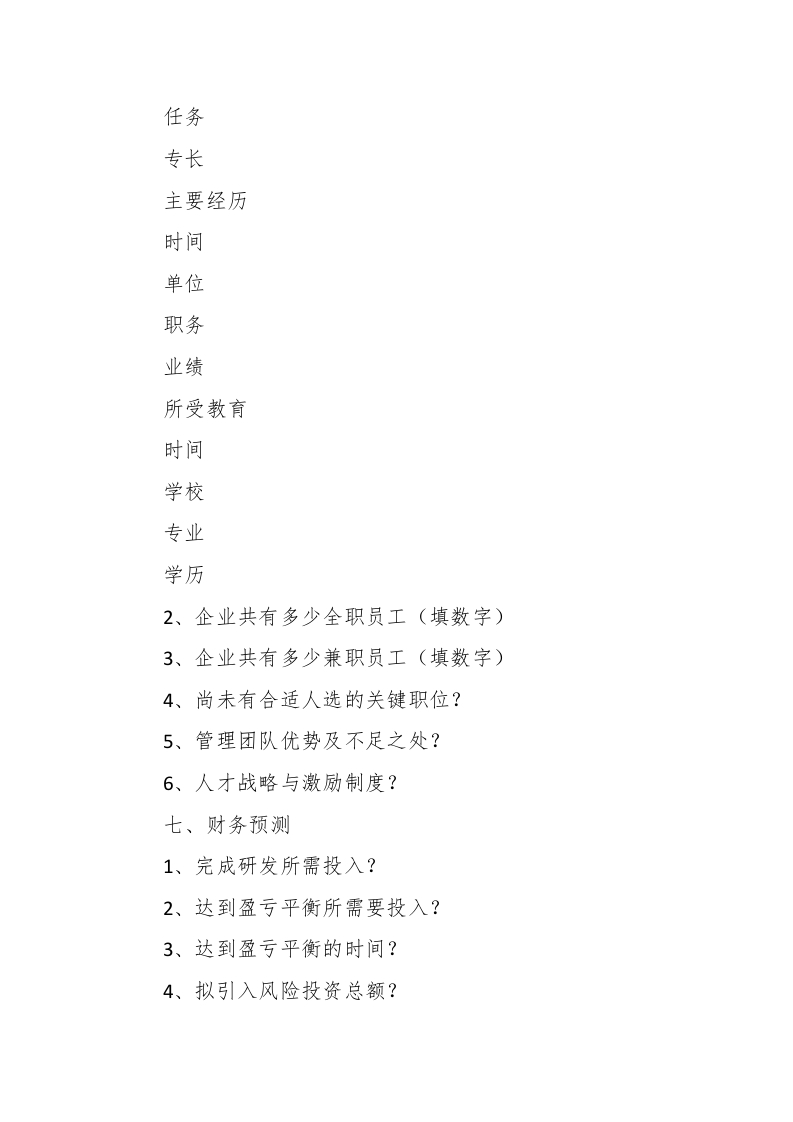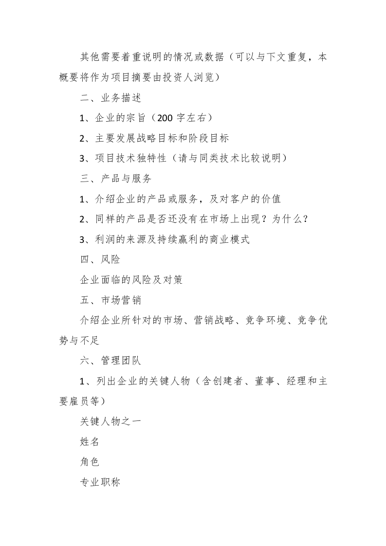 创业计划书模板xmtt885个月前发布关注私信15.73KB5页05112 第1页 / 共5页 第2页 / 共5页 第3页 / 共5页 试读已结束,还剩2页,您可下载完整版后进行离线阅读 创业计划书模板此内容为付费资源,请付费后查看¥2¥3会员服务免费立即购买您当前未登录!建议登陆后购买,可保存购买订单付费资源© 版权声明文章版权归作者所有,未经允许请勿转载。THE END创业融资# 融资# 大学生创业 文本预览 创业计划书模板创业计划书模板一、项目企业概要1、投资安排资金需求数额(万元)相应权益2、企业基本情况公司名称法定代表人电话传真e-mail地址邮编企业性质口国有口有限责任公司口股份有限公司口合伙企业()其他企业注册日期年月日您在寻找第几轮资金口种子资本口第一轮口第二轮口第三轮企业的主营产业 查看更多 收起部分 喜欢就支持一下吧点赞12 分享QQ空间微博QQ好友海报分享复制链接收藏
