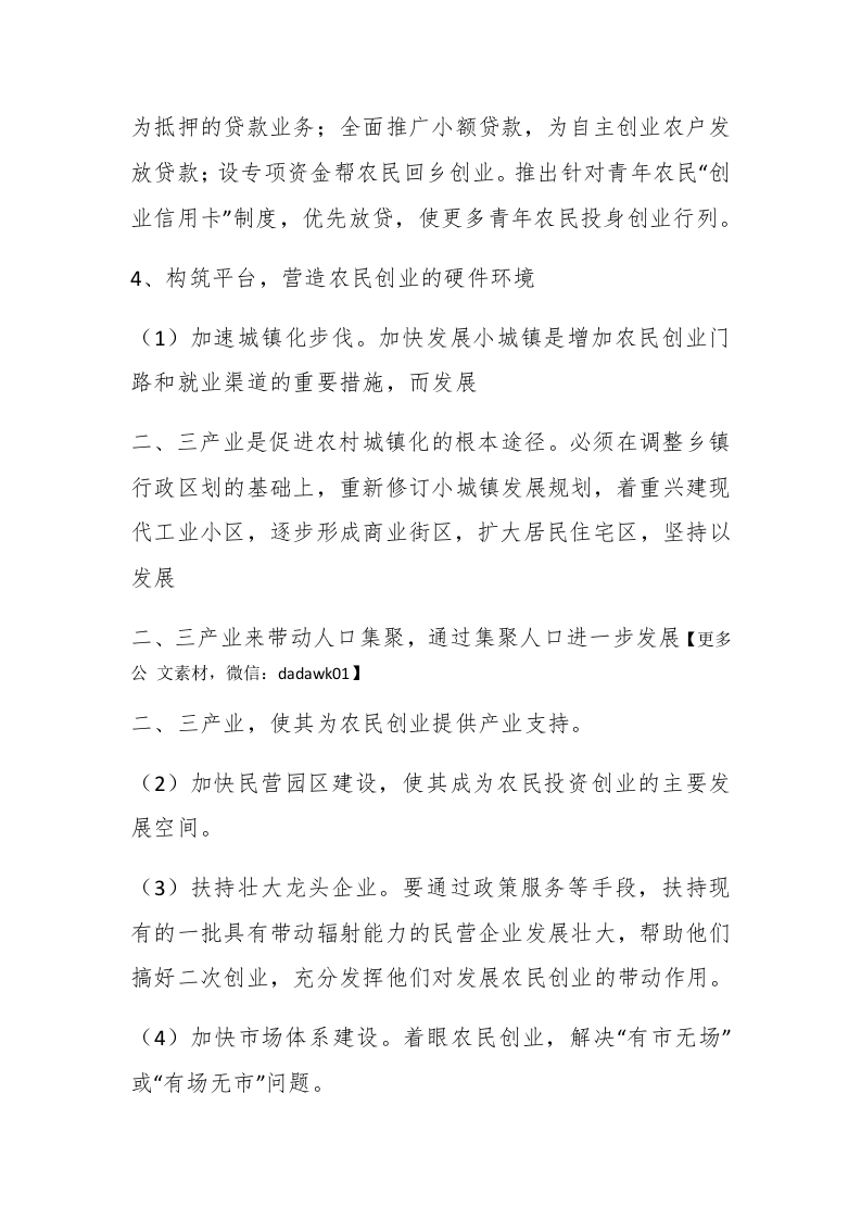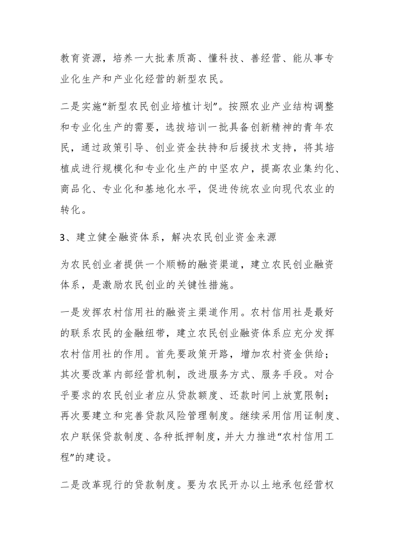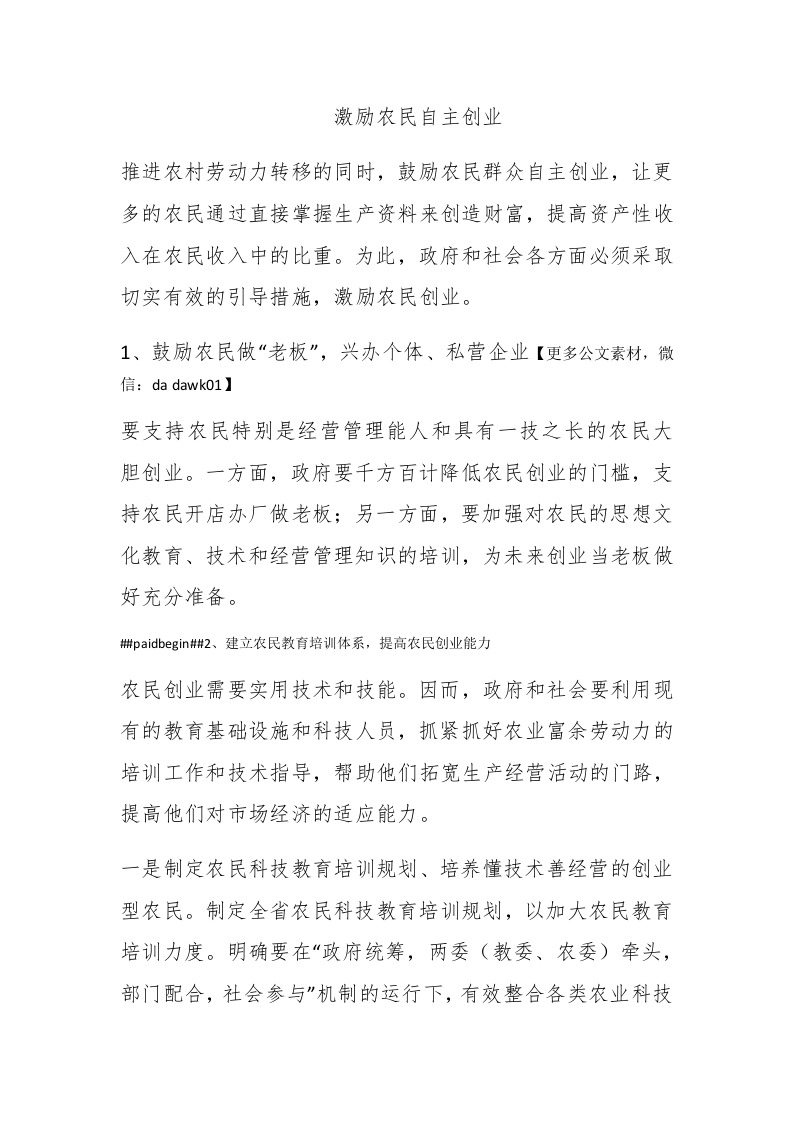 激励农民自主创业推进农村劳动力转移的同时,鼓励农民群众自主创业,让更多的农民通过直接掌握生产资料来创造财富,提高资产性收入在农民收入中的比重。为此,政府和社会各方面必须采取切实有效的引导措施,激励农民创业。1、鼓励农民做“老板”,兴办个体、私营企业【更多公文素材,微信:da dawk01】要支持农民特别是经营管理能人和具有一技之长的农民大胆创业。一方面,政府要千方百计降低农民创业的门槛,支持农民开店办厂做老板:另一方面,要加强对农民的思想文化教育、技术和经营管理知识的培训,为未来创业当老板做好充分准备。#paidbegin#2、建立农民教育培训体系,提高农民创业能力农民创业需要实用技术和技能。因而,政府和社会要利用现有的教育基础设施和科技人员,抓紧抓好农业富余劳动力的培训工作和技术指导,帮助他们拓宽生产经营活动的门路,提高他们对市场经济的适应能力。一是制定农民科技教育培训规划、培养懂技术善经营的创业型农民。制定全省农民科技教育培训规划,以加大农民教育培训力度。明确要在“政府统筹,两委(教委、农委)牵头,部门配合,社会参与”机制的运行下,有效整合各类农业科技