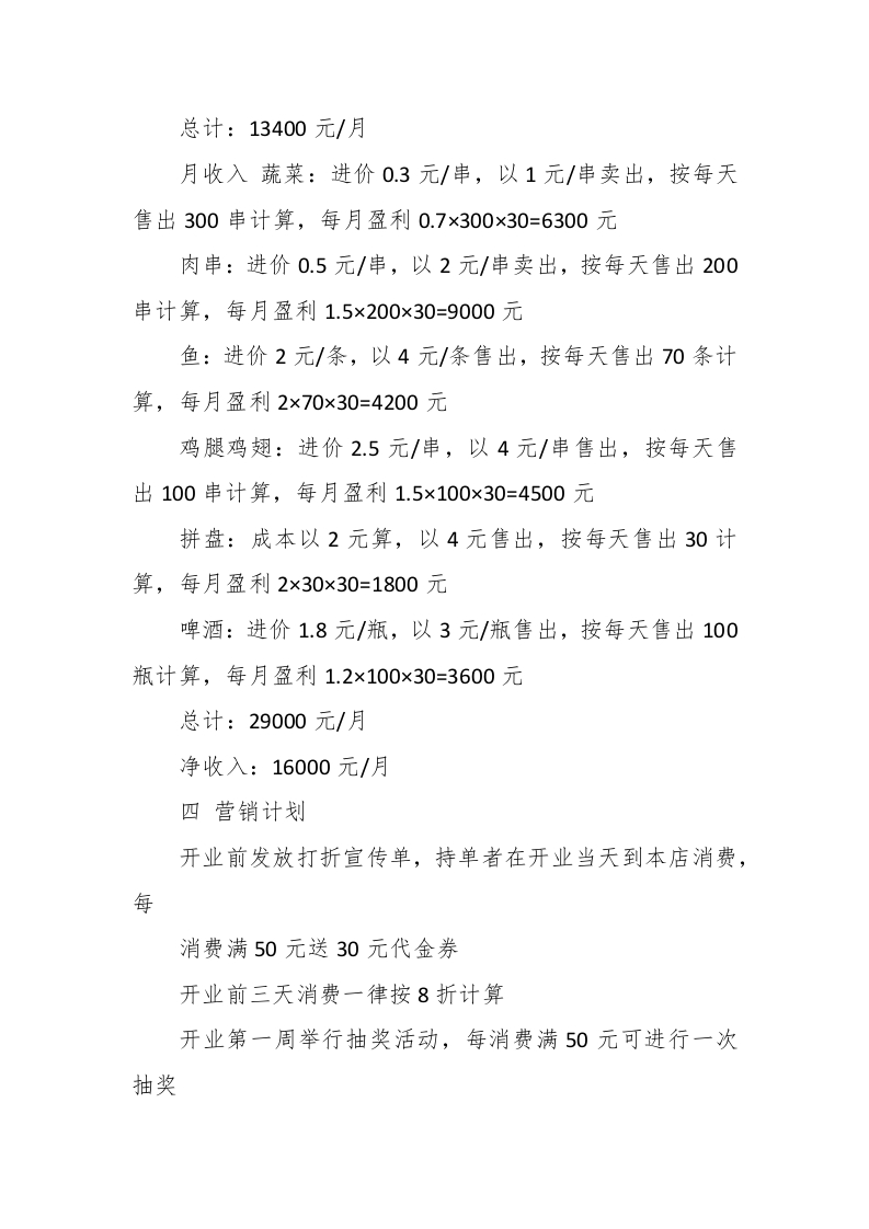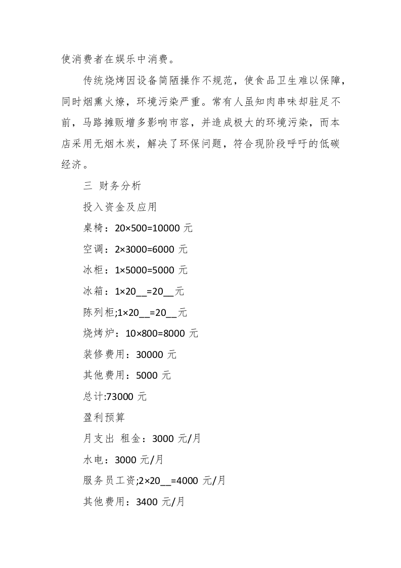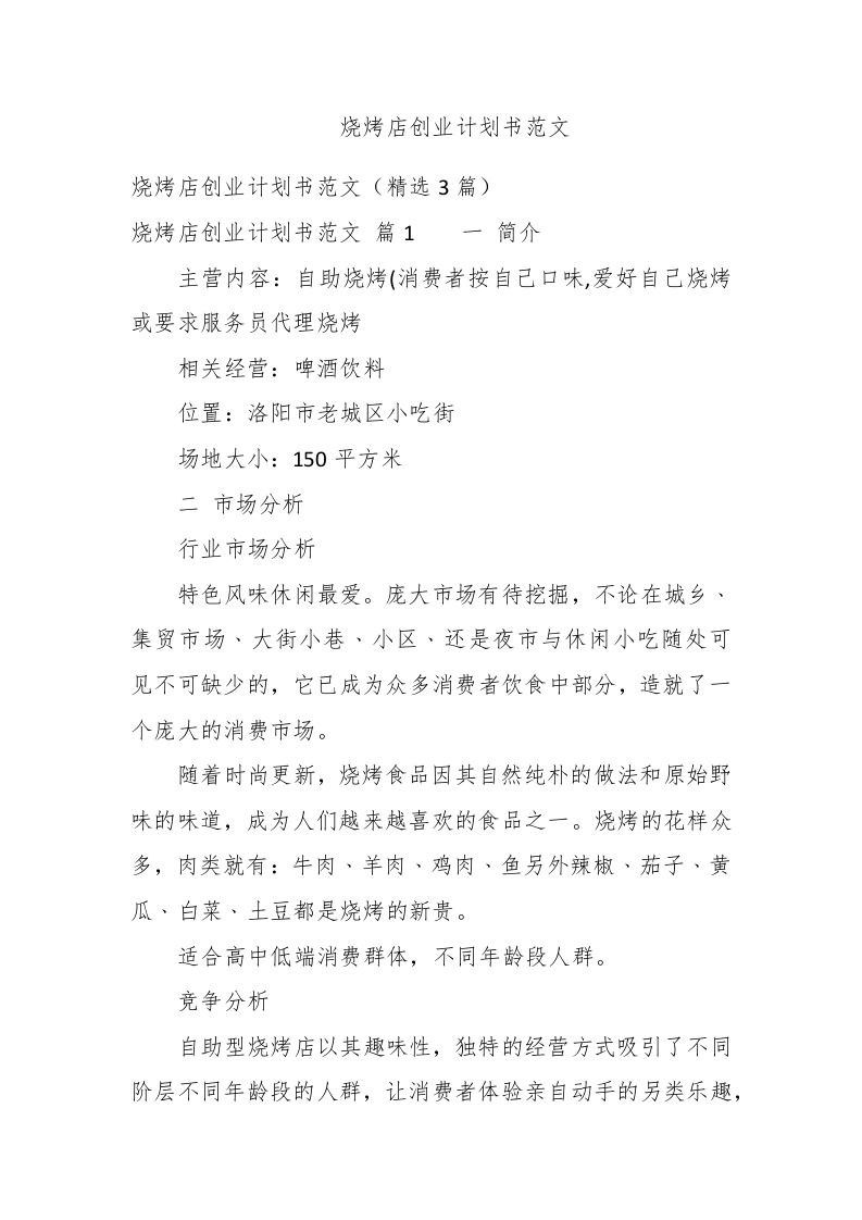 烧烤店创业计划书范文烧烤店创业计划书范文(精选3篇)烧烤店创业计划书范文篇1一简介主营内容:自助烧烤(消费者按自己口味,爱好自己烧烤或要求服务员代理烧烤相关经营:啤酒饮料位置:洛阳市老城区小吃街场地大小:150平方米二市场分析行业市场分析特色风味休闲最爱。庞大市场有待挖掘,不论在城乡、集贸市场、大街小巷、小区、还是夜市与休闲小吃随处可见不可缺少的,它已成为众多消费者饮食中部分,造就了一个庞大的消费市场。随着时尚更新,烧烤食品因其自然纯朴的做法和原始野味的味道,成为人们越来越喜欢的食品之一。烧烤的花样众多,肉类就有:牛肉、羊肉、鸡肉、鱼另外辣椒、茄子、黄瓜、白菜、土豆都是烧烤的新贵。适合高中低端消费群体,不同年龄段人群。竞争分析自助型烧烤店以其趣味性,独特的经营方式吸引了不同阶层不同年龄段的人群,让消费者体验亲自动手的另类乐趣,