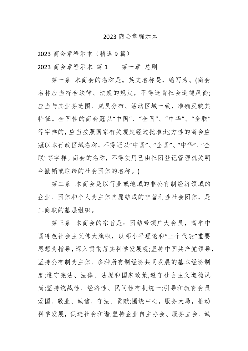 2023商会章程示本2023商会章程示本(精选9篇)2023商会章程示本篇1第一章总则第一条本商会的名称是。英文名称是,缩写为。(商会名称应当符合法律、法规的规定,不得违背社会道德风尚;应当与其业务范围、成员分布、活动区域一致,准确反映其特征。全国性的商会冠以“中国”、“全国”、“中华”、“全联”等字样的,应当按照国家有关规定经过批准;地方性的商会应冠以本行政区域名称,不得冠以“中国”、“全国”、“中华”、“全联”等字样。商会的名称,不得使用已由社团登记管理机关明令撤销或取缔的社会团体的名称。)第二条本商会是以行业或地域的非公有制经济领域的企业、团体和个人为主体自愿结成的非营利性社会团体,是工商联的基层组织。第三条本商会的宗旨是:团结带领广大会员,高举中国特色社会主义伟大旗帜,以邓小平理论和“三个代表”重要思想为指导,深入贯彻落实科学发展观;坚持中国共产党领导,坚持公有制为主体、多种所有制经济共同发展的基本经济制度;遵守宪法、法律、法规和国家政策,遵守社会主义道德风尚;坚持统战性、经济性、民间性有机统一;引导和教育会员爱国、敬业、诚信、守法、贡献;围绕中心,服务大局,推动科学发展,促进社会和谐:坚持企业自主办会、服务立会、诚