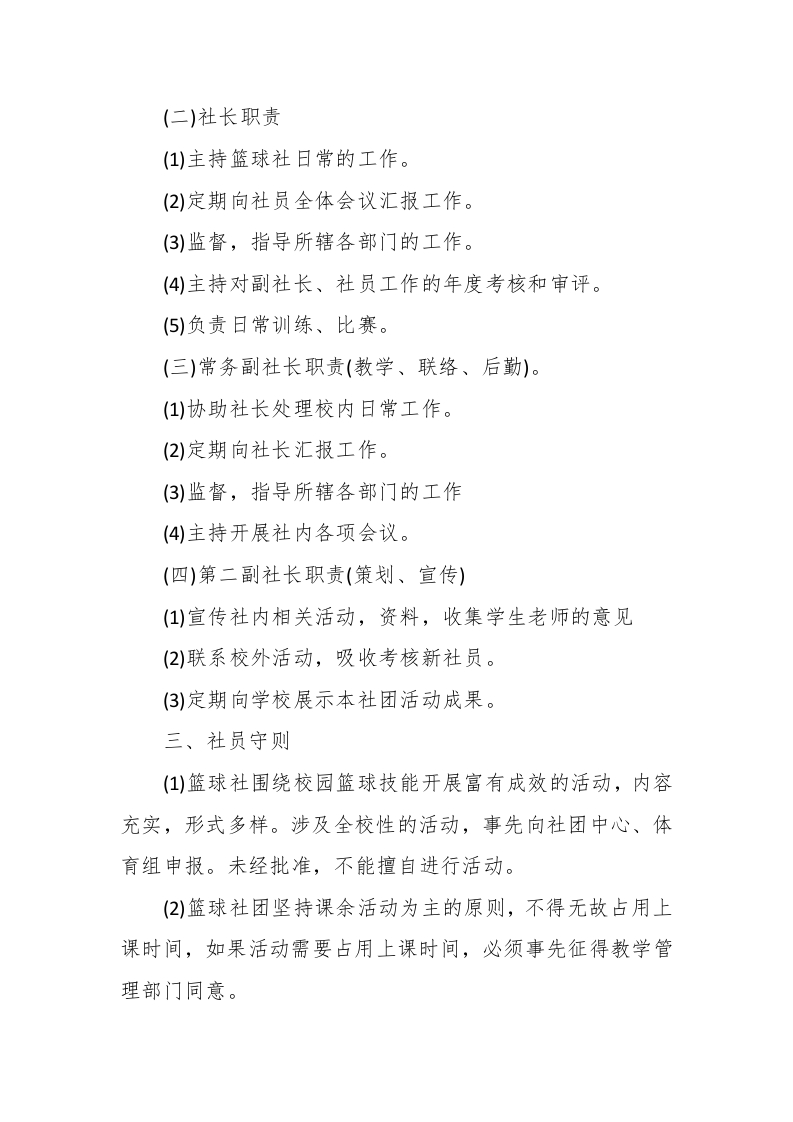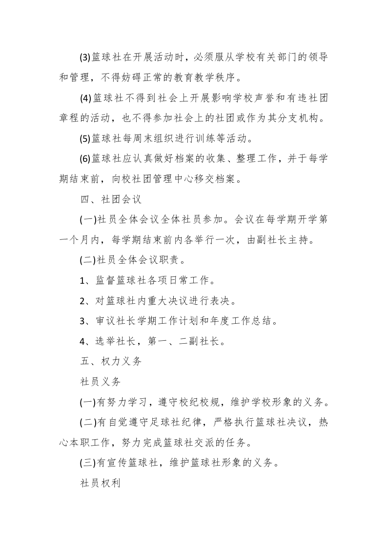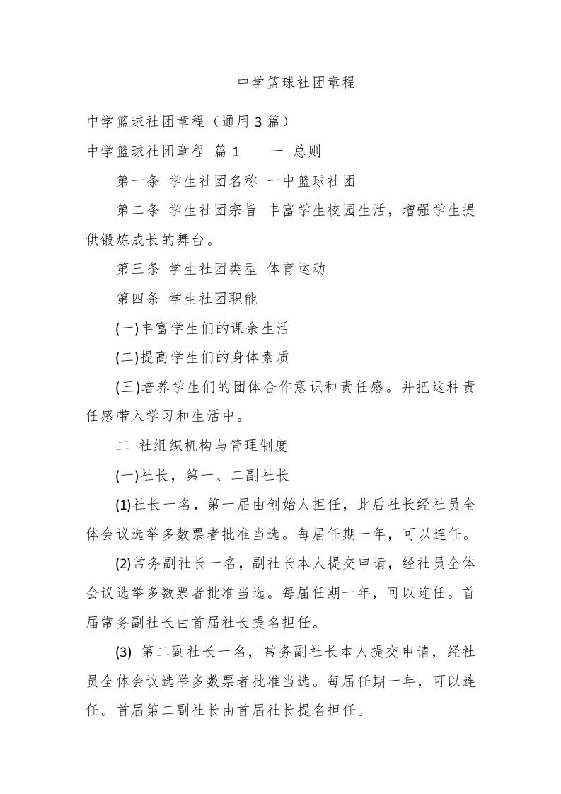 中学篮球社团章程中学篮球社团章程(通用3篇)中学篮球社团章程篇1一总则第一条学生社团名称一中篮球社团第二条学生社团宗旨丰富学生校园生活,增强学生提供锻炼成长的舞台。第三条学生社团类型体育运动第四条学生社团职能(一)丰富学生们的课余生活(二)提高学生们的身体素质(三)培养学生们的团体合作意识和责任感。并把这种责任感带入学习和生活中。二社组织机构与管理制度(一)社长,第一、二副社长(1)社长一名,第一届由创始人担任,此后社长经社员全体会议选举多数票者批准当选。每届任期一年,可以连任。(2)常务副社长一名,副社长本人提交申请,经社员全体会议选举多数票者批准当选。每届任期一年,可以连任。首届常务副社长由首届社长提名担任。(3)第二副社长一名,常务副社长本人提交申请,经社员全体会议选举多数票者批准当选。每届任期一年,可以连任。首届第二副社长由首届社长提名担任。