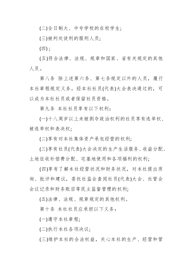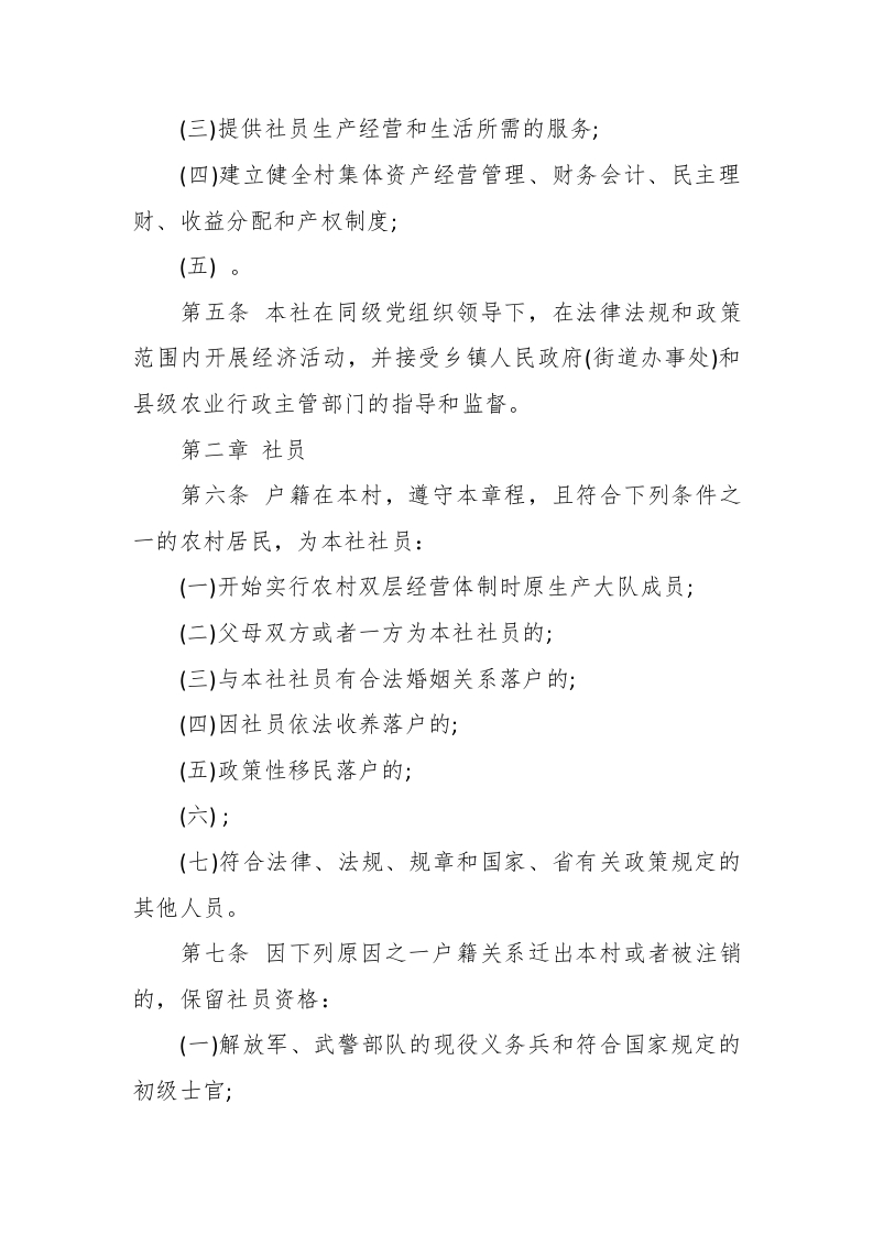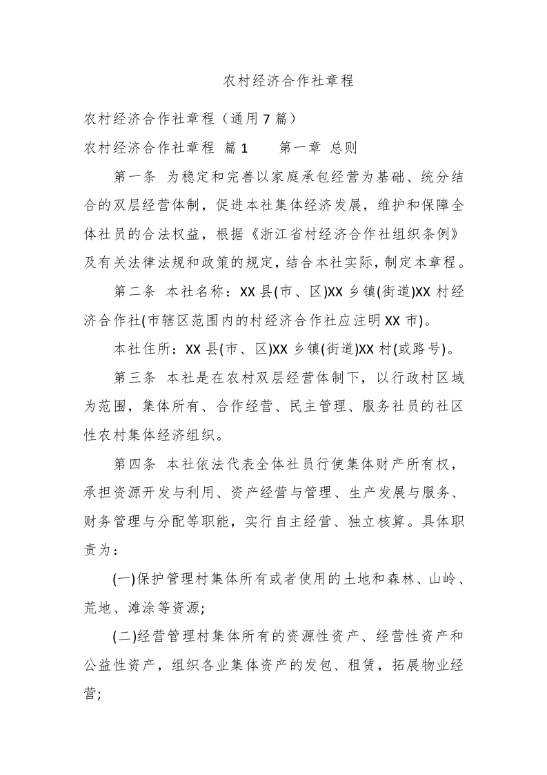 农村经济合作社章程农村经济合作社章程(通用7篇)农村经济合作社章程篇1第一章总则第一条为稳定和完善以家庭承包经营为基础、统分结合的双层经营体制,促进本社集体经济发展,维护和保障全体社员的合法权益,根据《浙江省村经济合作社组织条例》及有关法律法规和政策的规定,结合本社实际,制定本章程。第二条本社名称:XX县(市、区)XX乡镇(街道)XX村经济合作社(市辖区范围内的村经济合作社应注明X市)。本社住所:县(市、区)XX乡镇(街道)XX村(或路号)。第三条本社是在农村双层经营体制下,以行政村区域为范围,集体所有、合作经营、民主管理、服务社员的社区性农村集体经济组织。第四条本社依法代表全体社员行使集体财产所有权,承担资源开发与利用、资产经营与管理、生产发展与服务、财务管理与分配等职能,实行自主经营、独立核算。具体职责为:(一)保护管理村集体所有或者使用的土地和森林、山岭、荒地、滩涂等资源;(二)经营管理村集体所有的资源性资产、经营性资产和公益性资产,组织各业集体资产的发包、租赁,拓展物业经营;