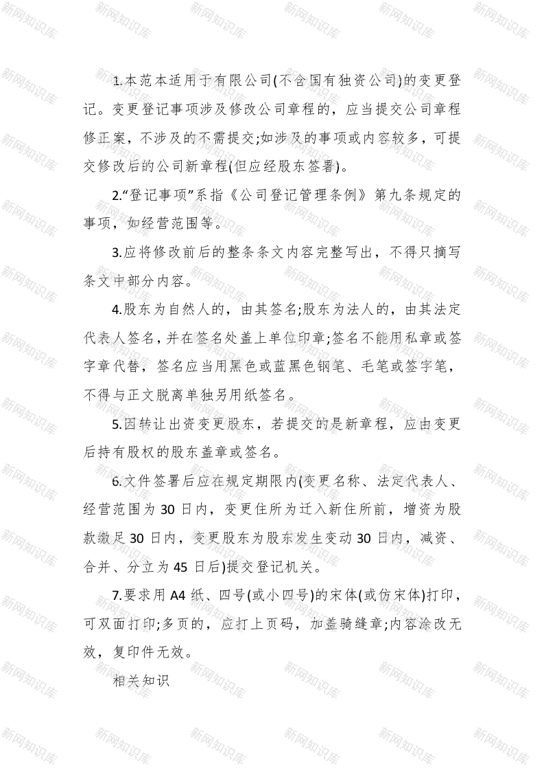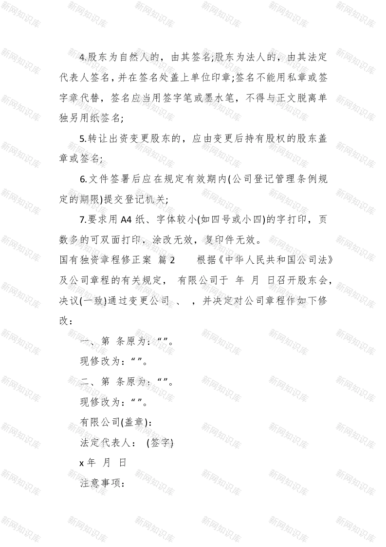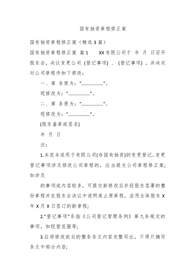 国有独资章程修正案国有独资章程修正案(精选3篇)国有独资章程修正案篇1X有限公司于年月日召开股东会,决议变更公司(登记事项)、(登记事项),并决定对公司章程作如下修改:一、第条原为:"现修改为:"."。二、第条原为:""。现修改为:""。(股东盖章或签名)年月日注:1.本范本适用于有限公司(非国有独资)的变更登记。变更登记事项涉及修改公司章程的,应当提交公司章程修正案;如涉及的事项或内容较多,可提交新修改后并经股东签署的整份章程并在股东会决议中说明废止原章程,启用全体股东X年X月X日签订的新章程;2."登记事项"系指《公司登记管理条例》第九条规定的事项,如经营范围等;3.应将修改前后的整条条文内容完整写出,不得只摘写条文中部分内容;