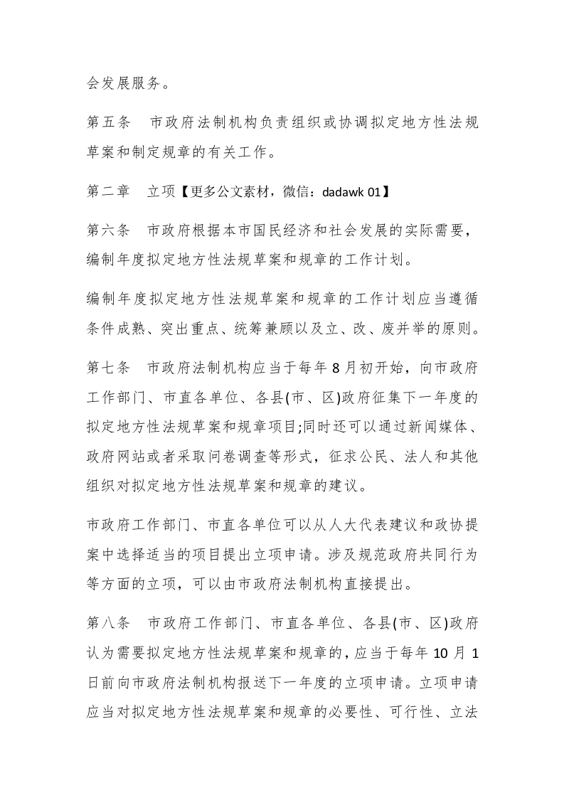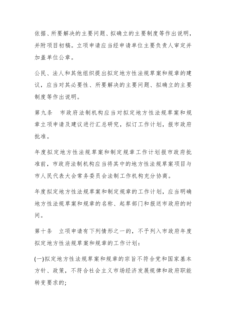 景德镇市人民政府拟定地方性法规草案和制定规章程序规定第一章总则第一条为了规范市政府拟定地方性法规草案和制定规章的程序,保证地方性法规草案和规章的质量,根据《中华人民共和国立法法》、国务院《规章制定程序条例》和《江西省人民政府拟订地方性法规草案和制定规章程序规定》,制定本规定。第二条市政府拟定地方性法规草案以及规章的立项、起草、审查、决定、公布、备案、解释、评估、清理、修改和废止适用本规定。提出地方性法规修正案、废止案草案参照本规定执行。郴paidbegin#第三条本规定所称地方性法规草案,是指市政府在《中华人民共和国立法法》规定的权限内拟订并作为议案提请市人民代表大会或其常务委员会审议的规范性文件草案。本规定所称规章,是指市政府在《中华人民共和国立法法》规定的权限内制定并以市政府令形式发布的规范性文件。第四条市政府根据《中华人民共和国立法法》规定的权限就城乡建设与管理、环境保护、历史文化保护等方面的事项拟定地方性法规草案和制定规章。拟定地方性法规草案和制定规章应当符合上位法的规定,从本市的具体情况和实际需要出发,坚持为本市经济建设和社