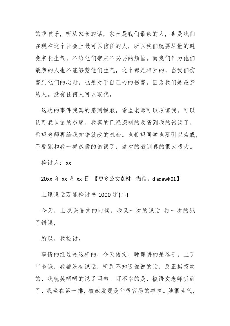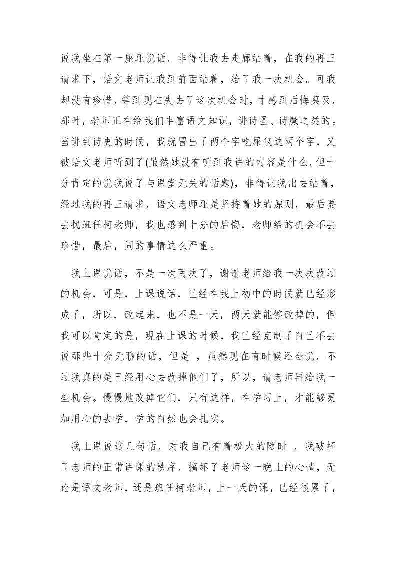 1000字上课说话万能检讨书上课说话万能检讨书1000字怎么写?下面是小编整理的关于上课说话万能检讨书1000字范文,欢迎阅读参考!上课说话万能检讨书1000字(一)老师:#paidbegin#这是一次十分深刻的检查,我对于我上课说话犯的错误感到很惭愧,我真的不应该不重视老师说的话,我不应该违背老师的话,我们作为学生就应该完全的听从老师的话,而我这次没有很好的重视到老师讲的话。我感到很抱歉,我希望老师可以原谅我的错误,我这次的悔过真的很深刻。不过,人总是会犯错误的,当然我知道也不能以此作为上课说话的借口,我们还是要尽量的避免这样的错误发生,希望老师可以相信我的悔过之心。人有失手,马有失蹄。我的不良行为不是向老师的纪律进行挑战。绝对是失误,老师说的话很正确,就是想要犯错误也不应该再您的面前犯错误,我感到真的是很惭愧,怎么可以这么的.犯了这样的错误,对于家长对我的期望也是一种很大的打击,家长辛苦的赚钱,让我们孩子可以生活的好一点,让我们可以全身心的投入到学习当中,可是,我却违背了家长的心意,我犯了这样的错误,简直是对于家长心血的否定,我对此也感到很惭愧,家长的劳累是我们所不知道的,每天为了生存而忙碌,为了家庭而承受着巨大的压力,这一切的一切都是我们所不能够了解的,我们唯一可以做的就是做他们