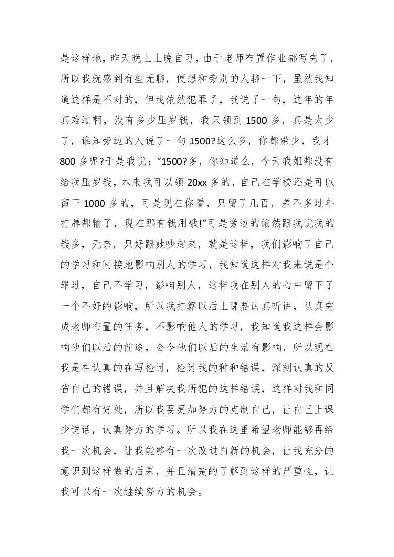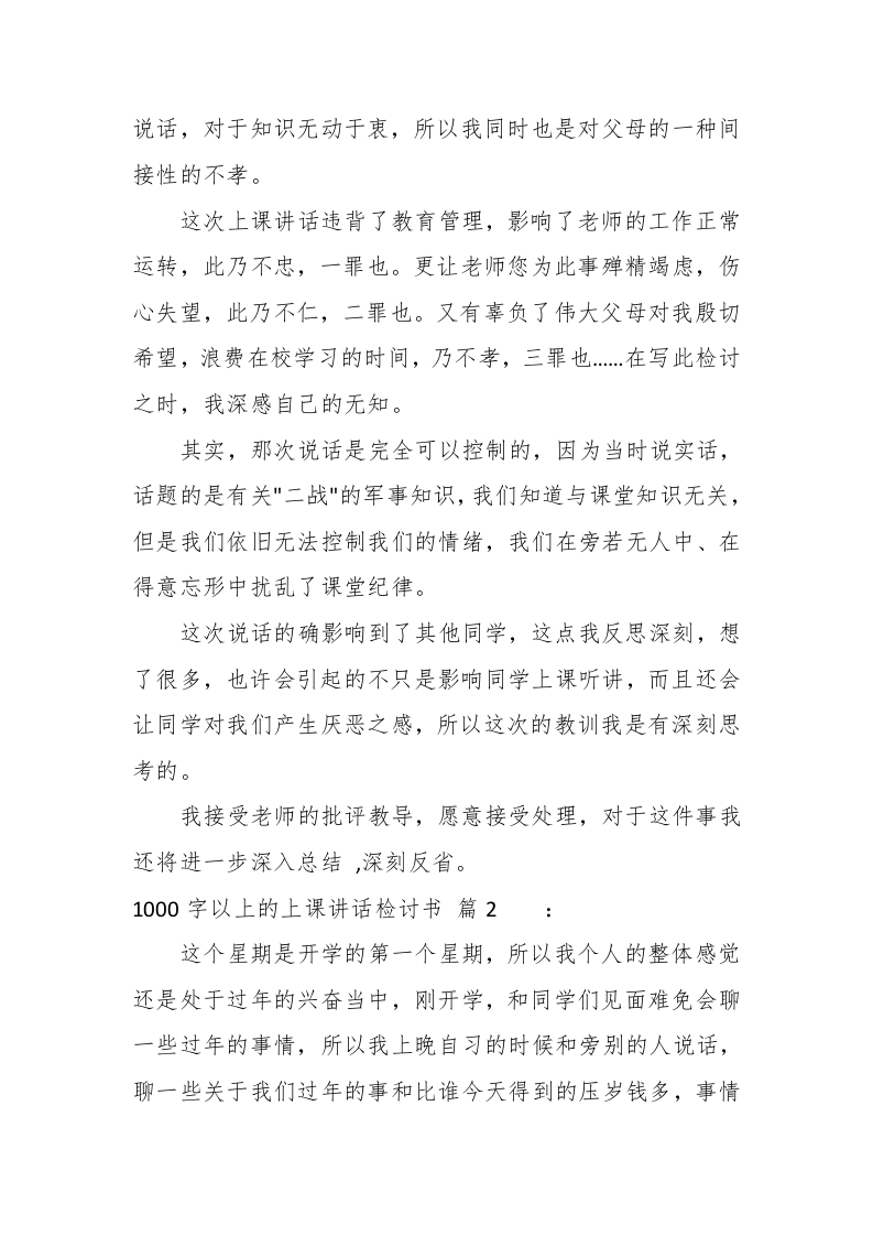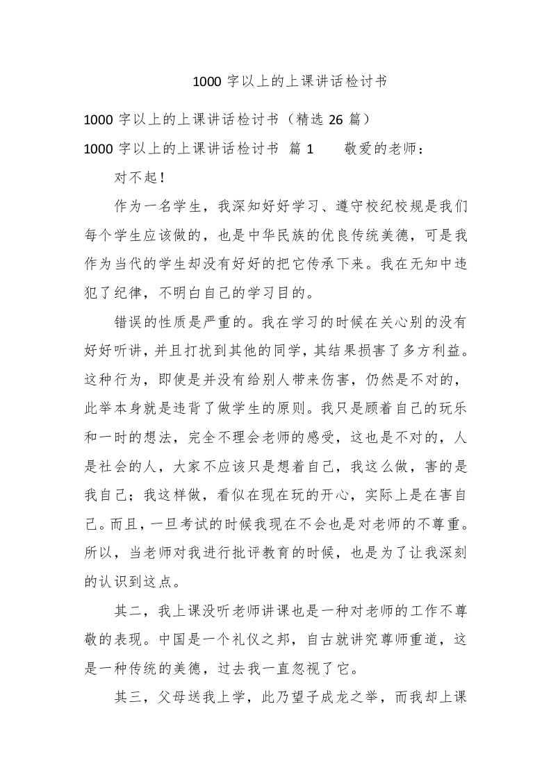 1000字以上的上课讲话检讨书1000字以上的上课讲话检讨书(精选26篇)1000字以上的上课讲话检讨书篇1敬爱的老师:对不起!作为一名学生,我深知好好学习、遵守校纪校规是我们每个学生应该做的,也是中华民族的优良传统美德,可是我作为当代的学生却没有好好的把它传承下来。我在无知中违犯了纪律,不明白自己的学习目的。错误的性质是严重的。我在学习的时候在关心别的没有好好听讲,并且打扰到其他的同学,其结果损害了多方利益。这种行为,即使是并没有给别人带来伤害,仍然是不对的,此举本身就是违背了做学生的原则。我只是顾着自己的玩乐和一时的想法,完全不理会老师的感受,这也是不对的,人是社会的人,大家不应该只是想着自己,我这么做,害的是我自己;我这样做,看似在现在玩的开心,实际上是在害自己。而且,一旦考试的时候我现在不会也是对老师的不尊重。所以,当老师对我进行批评教育的时候,也是为了让我深刻的认识到这点。其二,我上课没听老师讲课也是一种对老师的工作不尊敬的表现。中国是一个礼仪之邦,自古就讲究尊师重道,这是一种传统的美德,过去我一直忽视了它。其三,父母送我上学,此乃望子成龙之举,而我却上课