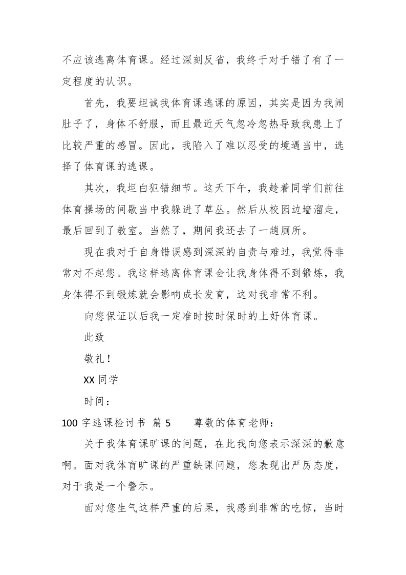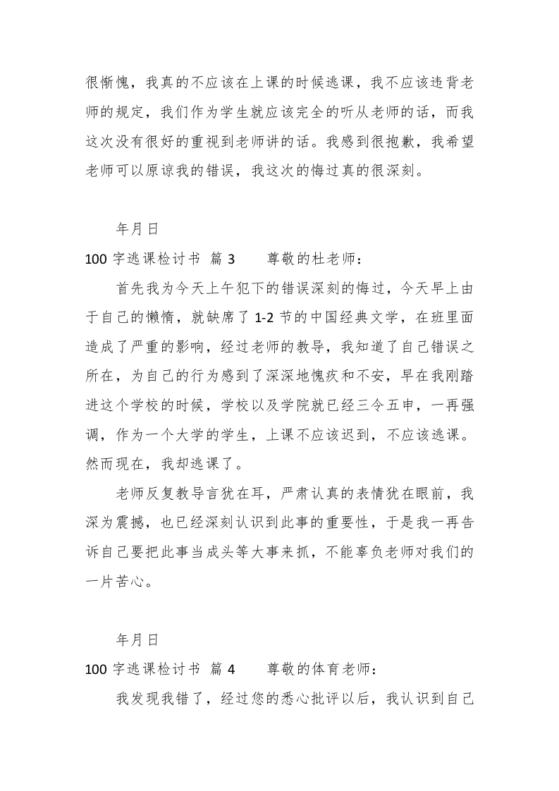 100字逃课检讨书100字逃课检讨书(精选25篇)100字逃课检讨书篇1尊敬的老师:X月X日,我由于自己一时报着侥幸心理,于X老师的课,我提前走了,违反了班规和校规,造成了及其不好的影响,且影响了周围同学。我知道,老师对于我的犯班规和校规非常的生气。我也知道,对于学生,不触犯校规,不违反纪律,做好自己的事是一项最基本的责任,也是最基本的义务。但是我却连最基本的都没有做到。如今,犯了大错,我深深懊悔不已。我会以这次违纪事件作为一面镜子时时检点自己,批评和教育自己,自觉接受监督。我要知羞而警醒,知羞而奋进,亡羊补牢、化羞耻为动力,努力学习。我也要通过这次事件,提高我的思想认识,强化责任措施。年月日100字逃课检讨书篇2尊敬的:今天,我怀着愧疚和懊悔给您写下这份检讨书,以向您表示我对上课逃课这种不良行为的深刻认识以及再也不在上课的时候逃课的决心。这是一次十分深刻的检查,我对于我这次犯的错误感到