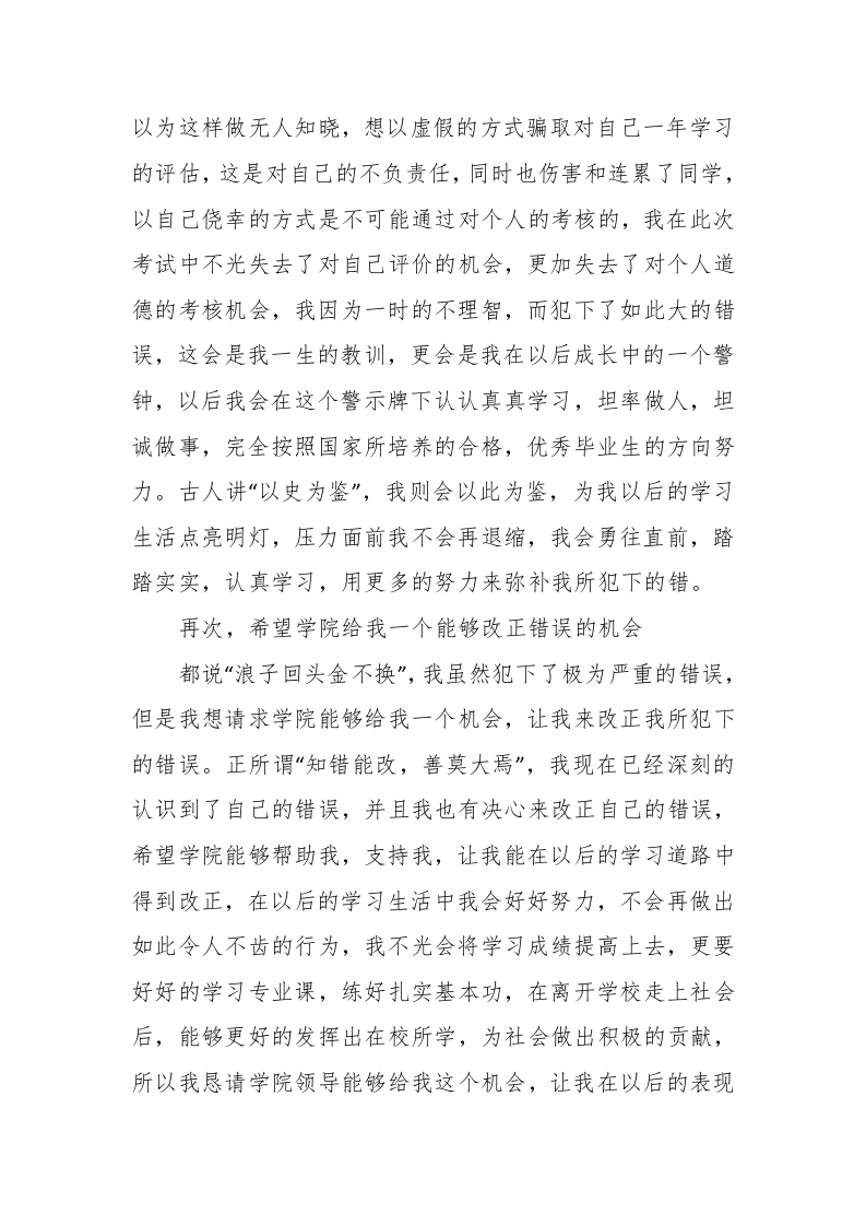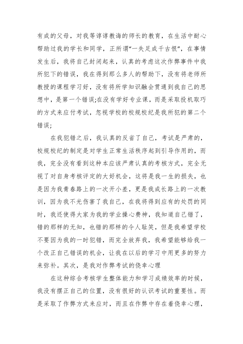 2000字大学生考试作弊检讨书范文2000字大学生考试作弊检讨书范文(精选5篇)2000字大学生考试作弊检讨书范文篇1尊敬的老师你好:我在考试中自带答案造成作弊行为,今天我怀着愧疚和懊悔写下这份检讨书,我知道这种行为是不对的,但我还是做了,我觉得有必要写这份检讨,以向老师表示我对这次作弊行为的深刻认识。对不起,老师!我犯下的是一个严重的原则性问题。针对此次我的考试作弊,完全是因为一时的侥幸心理和对自己没有自信导致,并不是因为学习中的困难和专业知识的匮乏导致,对于这件事,我深刻的剖析了自己的错误,我深知问题的严重性,影响的广泛性和对学校的负面影响深度,现在我将我的认识和体会向大家做一个汇报,希望能在我知道和反省错误的同时,给予我帮助和支持,让我能在以后的学习和工作生活中,摒弃恶习,扎实学好专业课,做一个对社会有用的人。首先,是我对专业课考试的认识不够在此次考试中,我没有认识到考试的重要性和对学生年度知识考核的严肃性,针对考试评估,我没有端正自己的态度,采用了投机取巧的方式来应付,完全忽视了学校对学生在德治上的引导和教育,同时也辜负了在远方遥望着我学业