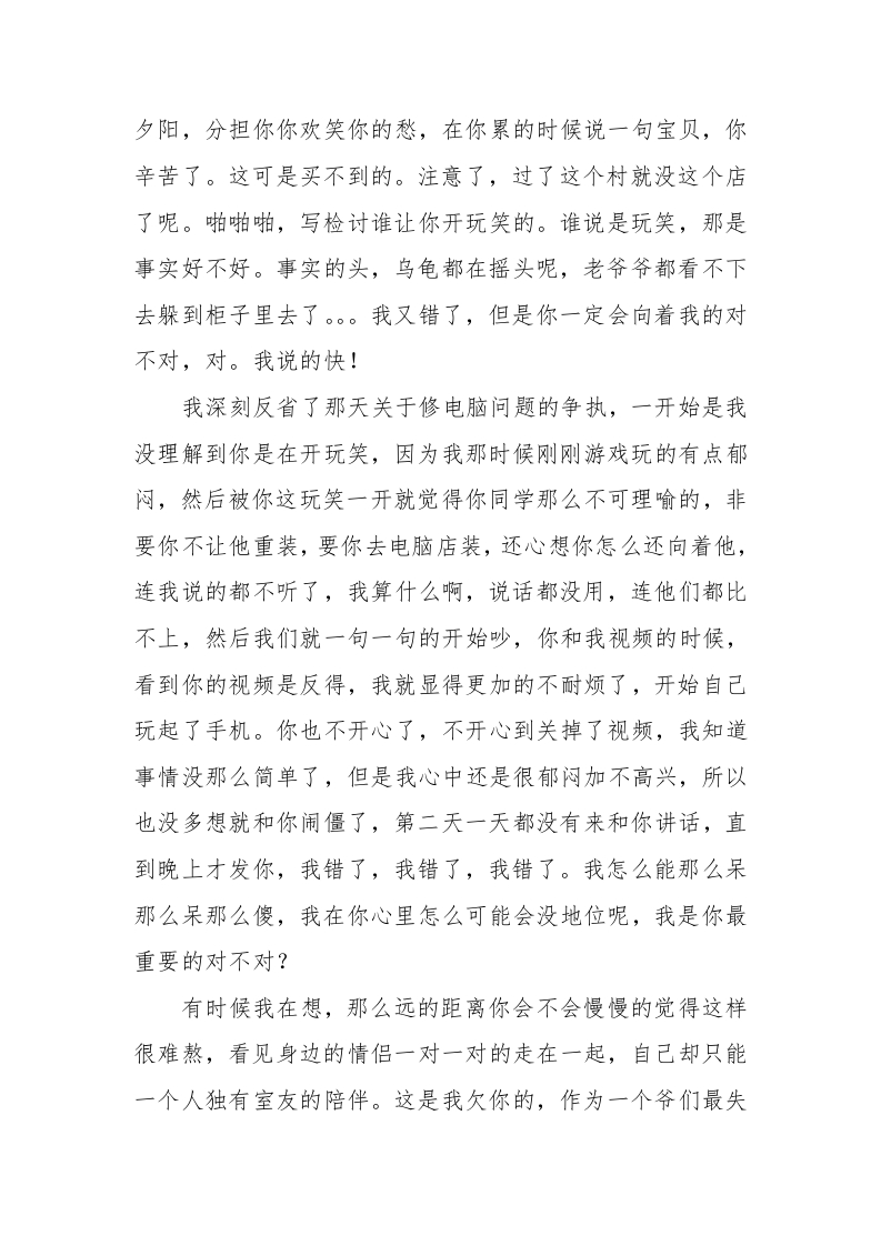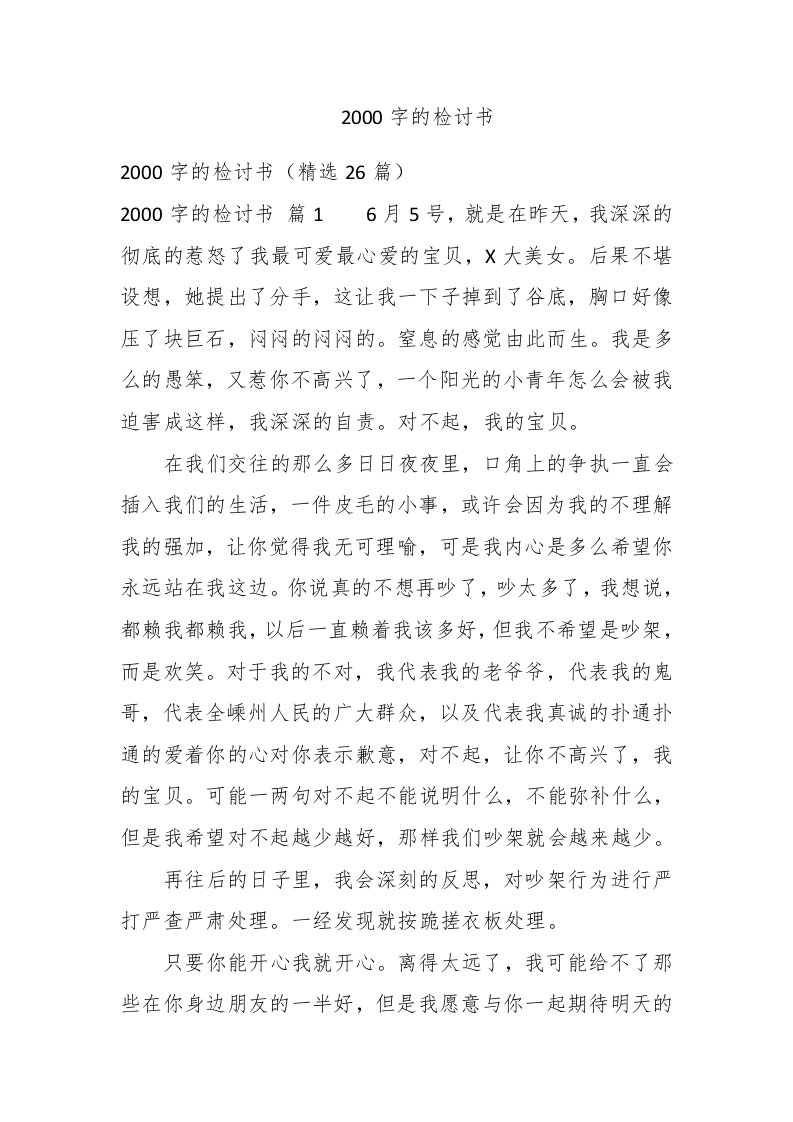 2000字的检讨书2000字的检讨书(精选26篇)2000字的检讨书篇16月5号,就是在昨天,我深深的彻底的惹怒了我最可爱最心爱的宝贝,X大美女。后果不堪设想,她提出了分手,这让我一下子掉到了谷底,胸口好像压了块巨石,闷闷的闷闷的。室息的感觉由此而生。我是多么的愚笨,又惹你不高兴了,一个阳光的小青年怎么会被我迫害成这样,我深深的自责。对不起,我的宝贝。在我们交往的那么多日日夜夜里,口角上的争执一直会插入我们的生活,一件皮毛的小事,或许会因为我的不理解我的强加,让你觉得我无可理喻,可是我内心是多么希望你永远站在我这边。你说真的不想再吵了,吵太多了,我想说,都赖我都赖我,以后一直赖着我该多好,但我不希望是吵架,而是欢笑。对于我的不对,我代表我的老爷爷,代表我的鬼哥,代表全嵊州人民的广大群众,以及代表我真诚的扑通扑通的爱着你的心对你表示歉意,对不起,让你不高兴了,我的宝贝。可能一两句对不起不能说明什么,不能弥补什么,但是我希望对不起越少越好,那样我们吵架就会越来越少。再往后的日子里,我会深刻的反思,对吵架行为进行严打严查严肃处理。一经发现就按跪搓衣板处理。只要你能开心我就开心。离得太远了,我可能给不了那些在你身边朋友的一半好,但是我愿意与你一起期待明天的