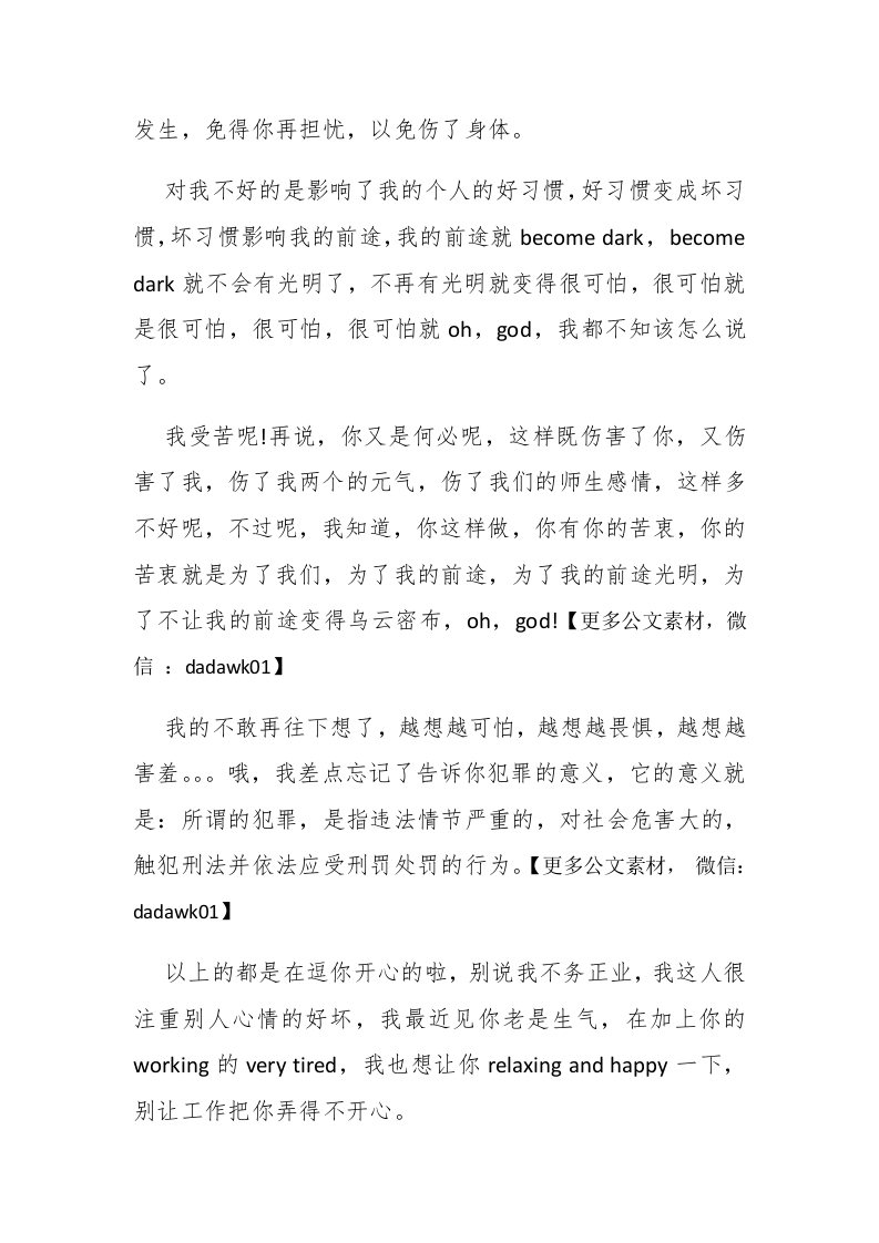2000玩扑克牌检讨书参考检讨书的写作属于应用写作研究的范畴。下面是查字典范文网整理的2000玩扑克牌检讨书参考,供各位查阅,希望内容对您有帮助。更新精彩内容发布尽在这里,敬请关注。检讨书范文一:亲爱的陈老师:郴paidbegin#你好,我今天不该打牌,牌即是扑克,打扑克即是赌博,赌博即是一般违法,一般违法即是对社会危害不大,情节轻微,没有触犯刑法,只是违反恶劣刑法以外的法律,法规的,是一般违法行为。一般违法经过加工改造而成为犯罪。下面有必要的说明犯罪的意义,请耐心听我说,要是不耐心的话,俺就不写了哦,但我不写又怕你打我,骂我,伤害了我幼小的心灵,难道你就看着您亲爱的学生我这样?我今天心血来潮,就和那两个“坏蛋”打了一下扑克牌。然后呢,就被您的火眼金睛看到了,接着呢,您就上来抓我们,就像猫抓老鼠一样,我们三个就是老鼠,最后呢,又让你罚我写这鬼东西。虽然我有点心不甘,情不愿,但是就算有一万个不甘心,一亿个不愿意,这检讨书,这检讨书,我一样得写,不写不行,因为你是偶的老师。能被你捉到,对你也好,对我也好,对你好的是不再使打扑克这种病源再传染到别的同学身上,我也不希望悲剧再次