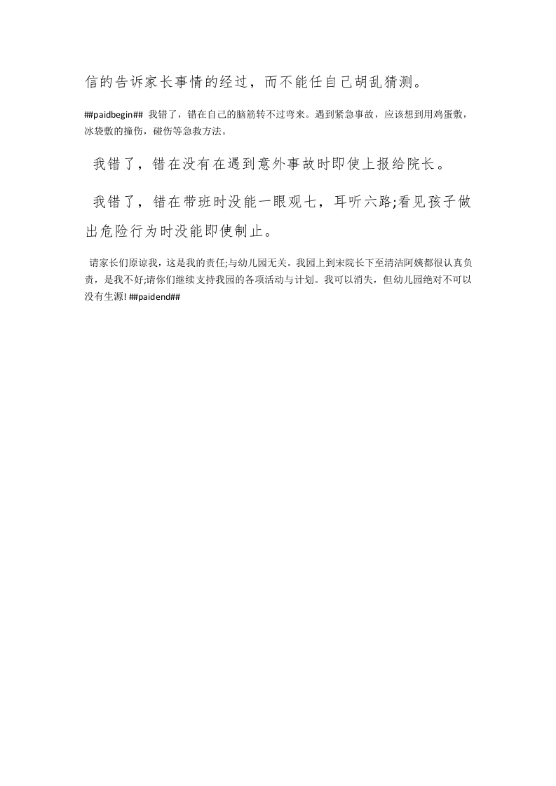 20XX被投诉工作检讨书范文今天早上又给一位家长投诉了!原因是昨天下午时分观察到有个孩子的右眼角给硬物撞到了,很明显的出现了淤青。看到了孩子的这种情况,我和班上的黄老师马上叫了在医务室的医生来。由于是接近放学的时刻(大概是四点二十五分),医生和心急如焚的我们都非常急切的想知道事情的来龙去脉,可孩子想了半天,只说了几个字:在桌上,在家,玩游戏。面对这样突然的情况,我们和医生都傻眼了:怎么办?根据孩子的说法,我们就很主观的想:是否孩子早上在家碰到,直到下午才出现淤青的情况呢?但是早上在接孩子时,观察了他的脸是没有任何异样的。于是自己也慌了神!询问了医生是否需要搽药,她说离眼晴太近了,不能搽。就这样,一直到家长来接我才对爸爸讲了一下事情的经过;告诉家长:孩子说可能是在家里弄到的,需要注意一下。谁知到了晚上,孩子竟对家长说:是某老师教我这样说的。这就变成了是我在说谎了!到了今早孩子的爷爷就气不打一处来,质问我是如何教孩子说谎话的?如果我真的有这样做,那我就不是一名合格的教师,我早就该进监狱里反省一辈子了!我是做错了,错在没有坚持自己的观点,明知道孩子早上是完好的回来,就要坚持问出孩子是在那里碰到的;要真实可