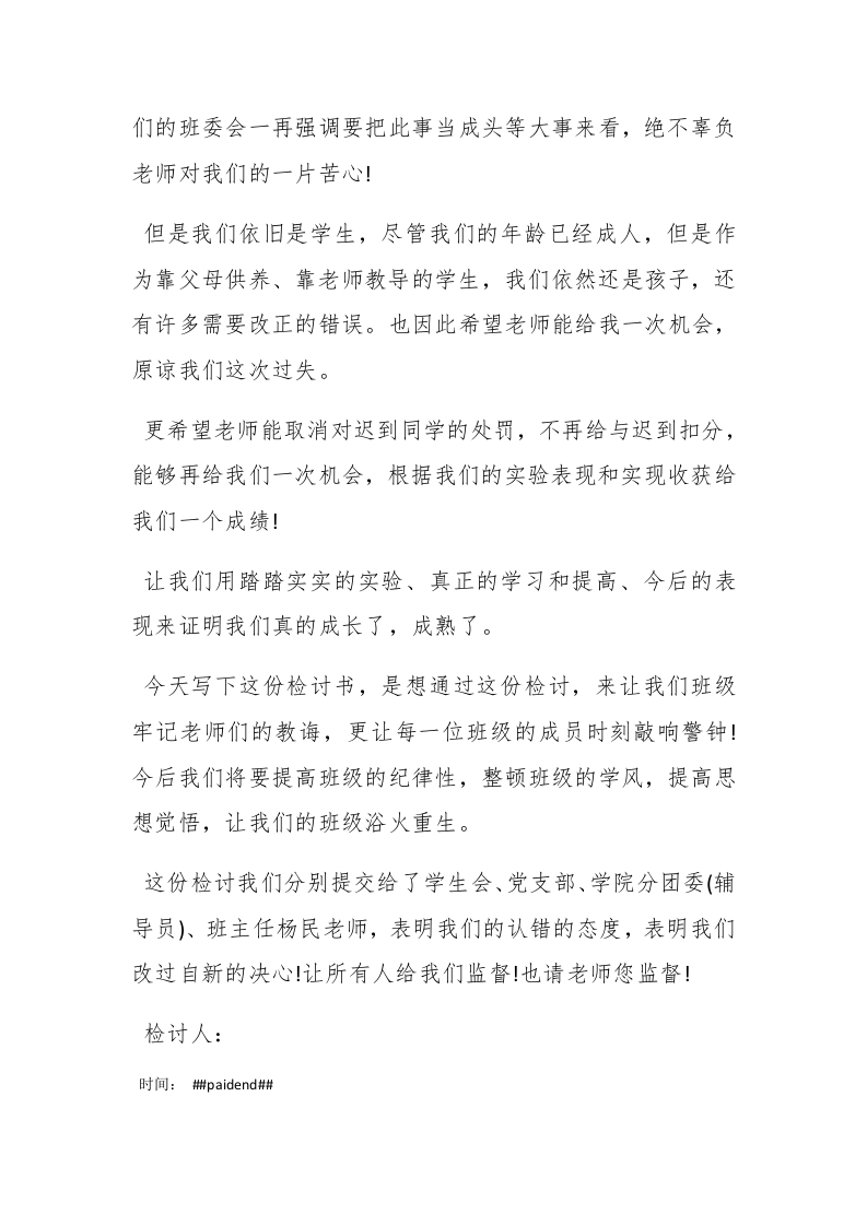 20XX上学迟到检讨书1000字尊敬的某某老师:某某班全体同学,尤其是某月某日上午迟到的同学,在此怀着愧疚和懊悔的心情为当天上午迟到犯下的错误向您表示深刻的悔过。当天早上由于是第一次上微机原理的实验课、班委会没有足够尽责、党支部没有起到先锋作用等客观因素,以及同学们的懒惰、不够认真等主观原因,我们班级共有*名同学在当天迟到了,造成了严重的影响,也让老师很生气。【更多公文素材,微信:dadawk01】郴paidbegin#我们不想找任何的理由来为自己开脱,因为错了,就是错了,找理由来逃避,只会使自己越陷越深。推卸责任容易变成一种习惯,而这种习惯养成了就难以去改变了。我们班级对此作出了深刻的检讨,认识到我们的错误所在,更对整个班级的学风、班风进行了深层次的批判。08年在我们刚踏进这个学校的时候,学校以及学院就已经三令五申,一再强调,作为一个大学生,不允许上课迟到,更不应该在实验课迟到、违纪。然而现在,我们犯下了这样的过错,让我们感到深深的愧疚。我们都对自己的惰性感到了深深地歉疚和不安。老师反复教导的话语犹在耳畔,严肃认真的表情犹在眼前,我们都深为震撼,也已经深刻认识到此事的重要性,于是我