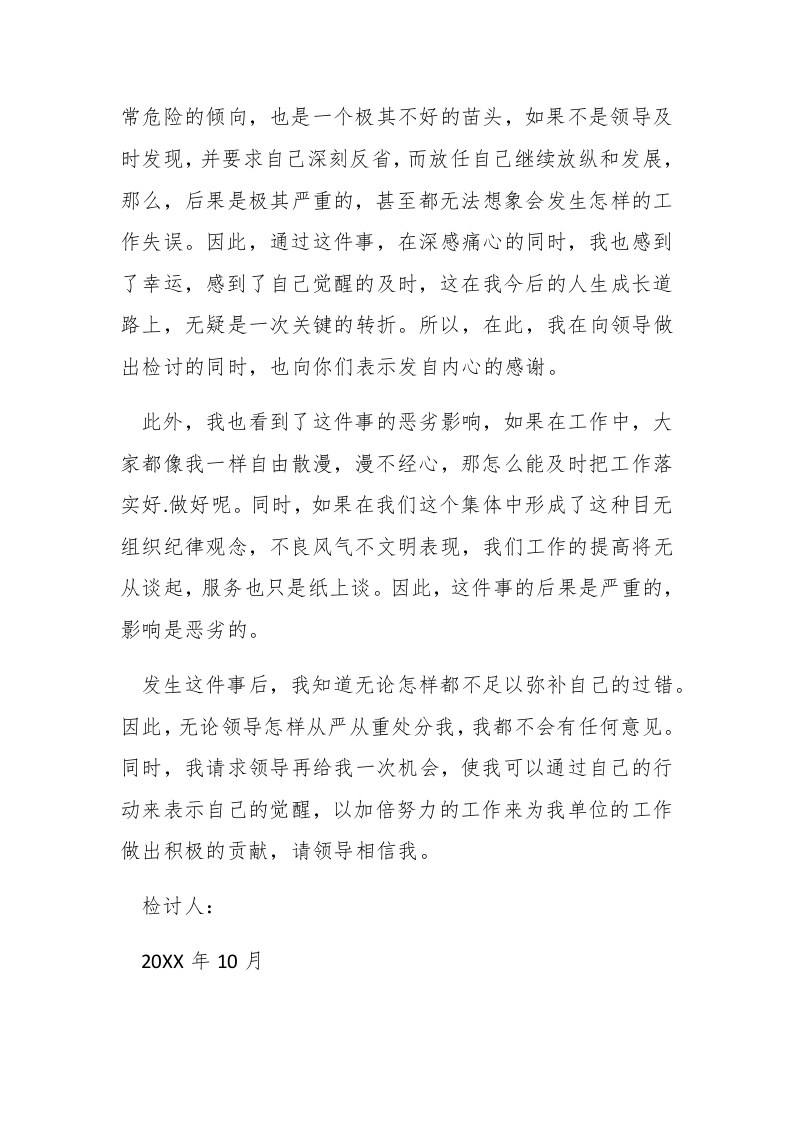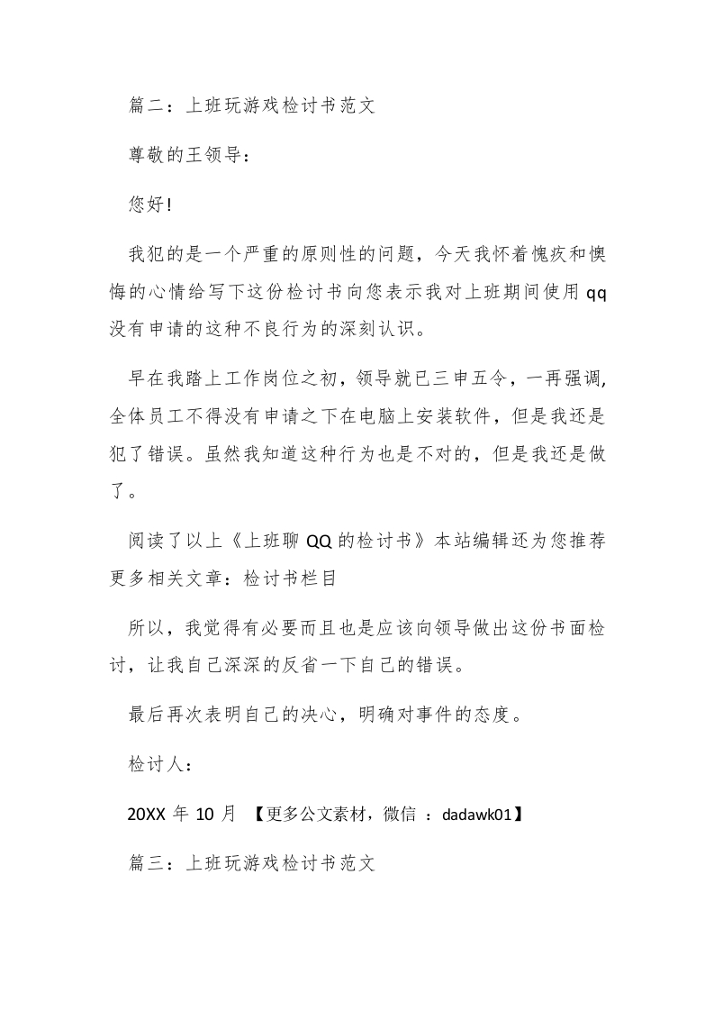 20XX上班玩游戏检讨书篇一:上班时间玩游戏检讨书尊敬的Xxx:x月x日,在工作中,我不仅没有认真投入工作,还在下面偷偷玩电脑,并被领导发现。几天来,我认真反思,深刻自剖,为自己的行为感到了深深地愧疚和不安,在此,我谨向各位领导做出深刻检讨,并将我几天来的思想反思结果向领导汇报如下:郴paidbegin#通过这件事,我感到这虽然是一件偶然发生的事情,但同时也是长期以来对自己放松要求,工作做风涣散的必然结果,也是与我们时代要求-树新风,讲文明,背道而行。经过几天的反思,我对自己这些年的工作成长经历进行了详细回忆和分析。记得刚上班的时候,我对自己的要求还是比较高的,时时处处也都能遵守相关规章制度,从而努力完成各项工作。但近年来,由于工作逐渐走上了轨道,而自己对单位的一切也比较熟悉了,尤其是领导对我的关怀和帮助使我感到温暖的同时,也慢慢开始放松了对自己的要求,反而认为自己己经做得很好了。因此,这次发生的事使我不仅感到是自己的耻辱,更为重要的是我感到对不起领导对我的信任,愧对领导的关心【更多公文素材,微信:dada wk01】同时,在这件事中,我还感到,自己在工作责任心上仍就非常欠缺。众所周知,服务行业一定要有规范的行为准则,工作时间我却吃起瓜子,这充分说明,我从思想上没有把工作的方式方法重视起来,这也说明,我对自己的工作没有足够的责任心,也没有把自己的工作做得更好,也没给自己注入走上新台阶的思想动力。在自己的思想中,仍就存在得过且过,混日子的应付思想。现在,我深深感到,这是一个非