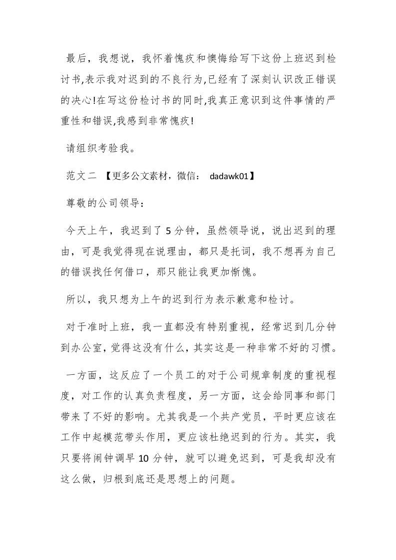20XX上班迟到检讨书500字范文范文一尊敬的领导:【更多公文素材,微信:dadawko1】今天由于我犯得错误,所以只得在这里写这份上班迟到检讨书范文。其实,我也一直认为上班迟到是一个很大的问题。#paidbegin#通过这件事,我感到这虽然是一件偶然发生的事情,但同时也是长期以来对自己放松要求,工作做风涣散的必然结果,这种不良思潮的最直接表现就是自由散漫!在这件事中,我还感到,自己在工作责任心上仍就非常欠缺。在自己的思想中,仍就存在得过且过,混日子的应付思想。现在,我深深感到,这是一个非常危险的倾向如果放任自己继续放纵和发展,那么,后果是极其严重的,甚至都无法想象会发生怎样的工作失误。我对我个人迟到所犯下的这个严重错误感到痛心疾首,感到无比遗憾,感到非常可耻,感到无以复加的后悔与悲痛。虽然,今天迟到的确是个意外,但是我不需解释什么,因为从中我看到了自己的不足之处,那就是好习惯要坚持,好风气要发扬。前段时间我做的工作得到了大家的一致认可,我很欣慰,同时干劲也更足。怎么能让这一次小小的意外影响到我的积极性呢。通过这一次迟到,我会认真反省,深刻思考。我会以此次的检讨书作为一面镜子,时时检点自己,批评和教育自己,自觉接受监督。要知羞而警醒,知羞而奋进,亡羊补牢、化羞耻为动力,努力做到决不迟到,决不违反公司规章制度,决不做让领导失望的事,同时我也要通过这次事件,提高我的思想认识,强化我的时间观念。