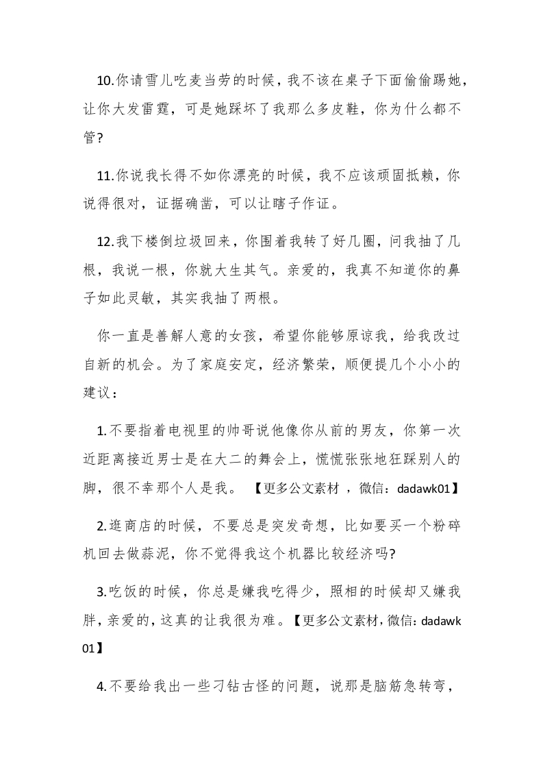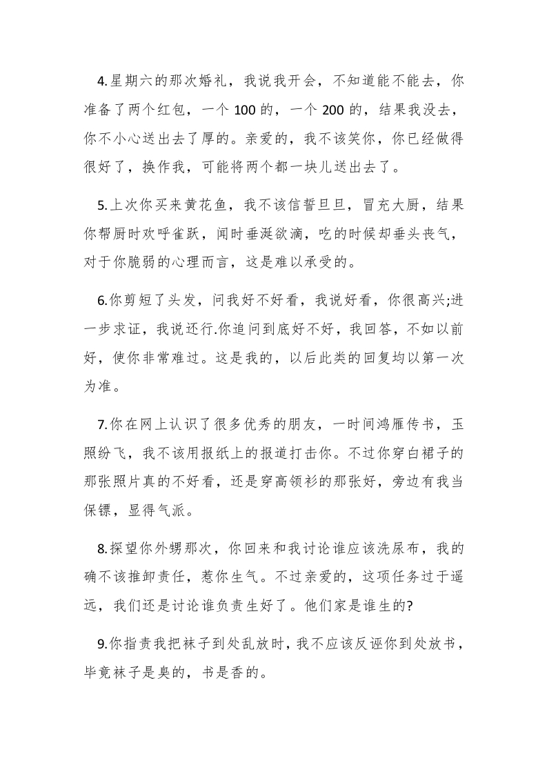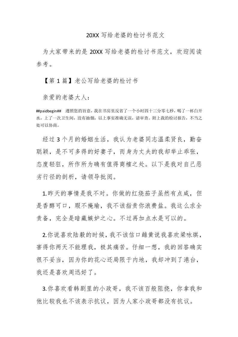20XX写给老婆的检讨书范文为大家带来的是20XX写给老婆的检讨书范文,欢迎阅读参考。【第1篇】老公写给老婆的检讨书亲爱的老婆大人:排paidbegin#遵照您的旨意,我在书房里反省了一个小时四十三分零七秒,喝了一杯白开水,上了一次卫生间,没有抽烟,以上事实准确无误,请审查。附上我的检讨报告,不当之处可以协商。经过3个月的婚姻生活,我认为老婆同志温柔贤良,勤奋聪颖,是不可多得的好妻子,而身为丈夫的我却举止乖张,态度轻狂,所作所为确有值得商榷之处。以下是我对自己恶劣行径的剖析,请领导批阅。1.昨天的事情是我不对。你做的红烧茄子虽然有点咸,但是香醇可口,瑕不掩瑜,我不该指责你浪费盐。我这么求全责备,完全是暗藏嫉妒之心。不过再加点水是可以的。2.你说喜欢陆毅的时候,我不该信口雌黄说我喜欢梁咏琪,害得你两天不能理我,极其痛苦。仔细一想,我的回答确实很不妥当,因为你的花心还局限于内地,我却冲到了港台,我还是喜欢周迅好了。3.你喜欢看韩剧里的小政哥,我不该百般阻挠,你拿我和他比较我也不该表示抗议,因为人家小政哥都没有抗议。
