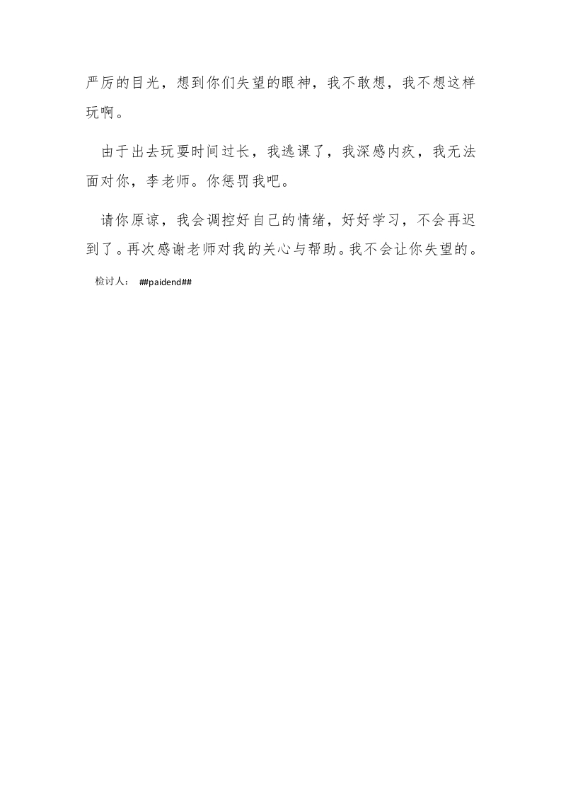 20Xx初中学生逃课检讨书逃课是一种不礼貌的行为,也违反学校的规章制度,受到惩罚就实实在在的写一篇检讨书自审一下吧。为大家带来的是20XX初中学生逃课检讨书20XX初中学生逃课检讨书【一】尊敬的老师:郴paidbegin#昨日,正午阳光明媚,又逢政治课,滋生学生我逃课欲望,于是欲望大于立志,我逃跑到操场与之玩球。因我球技不精,所以很快下拍,蹲在篮球架子旁看球。霎时,只见人影稀疏,逃之。好比八国联军进北京一样,一片狼籍。好奇之际,只见与我一样不只情的人顿时全部向阳,回头一看,不料竞发觉老师正赶往此地,匆忙之间,我也只好不语。老师当时定以为我躲避老师才向背,其实不然。老师问之,我一一俱答,好比初犯被逼供坦白从严,抗拒更严。学生为能宽大处理而表现真诚,但老师却半信半疑。停课一周,给家长打电话这句好比法院的判决书。于是全身一抖,想这下完了。告之家长电话后,侧耳倾听老师打电话之语您来一趟这句好比拉出去,斩!声音之洪亮,身体又为之一颤,想第一次就被歹住,后悔不已。顿时大彻大悟,明白此时非同小可,怪学生自己不争气,明知作日老师语重心长的劝学已积攒大量怒气,而因我又气上加气,摇头以示不该这么若老师生气。此事在老师认为此类学生皆不爱学习者,其实不然。所以我深知此行为违反了校纪校规,为之检讨。特献此检讨书,以表真诚。学生我知道老师您善解人意才写的,虽此文不伦不类,但并非有戏弄之意,请见谅。