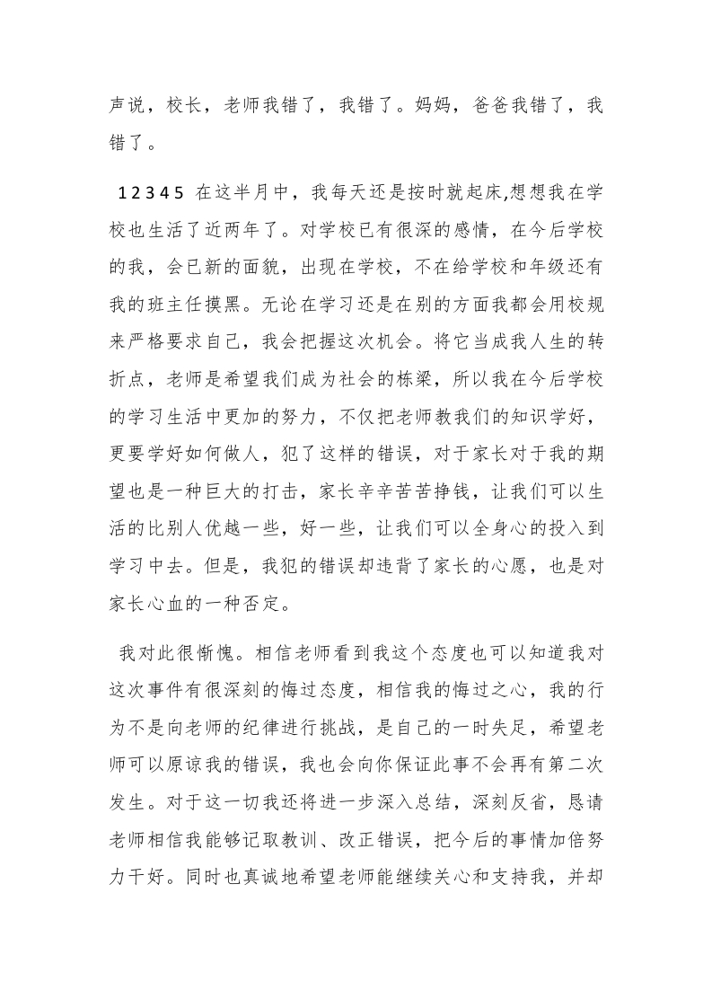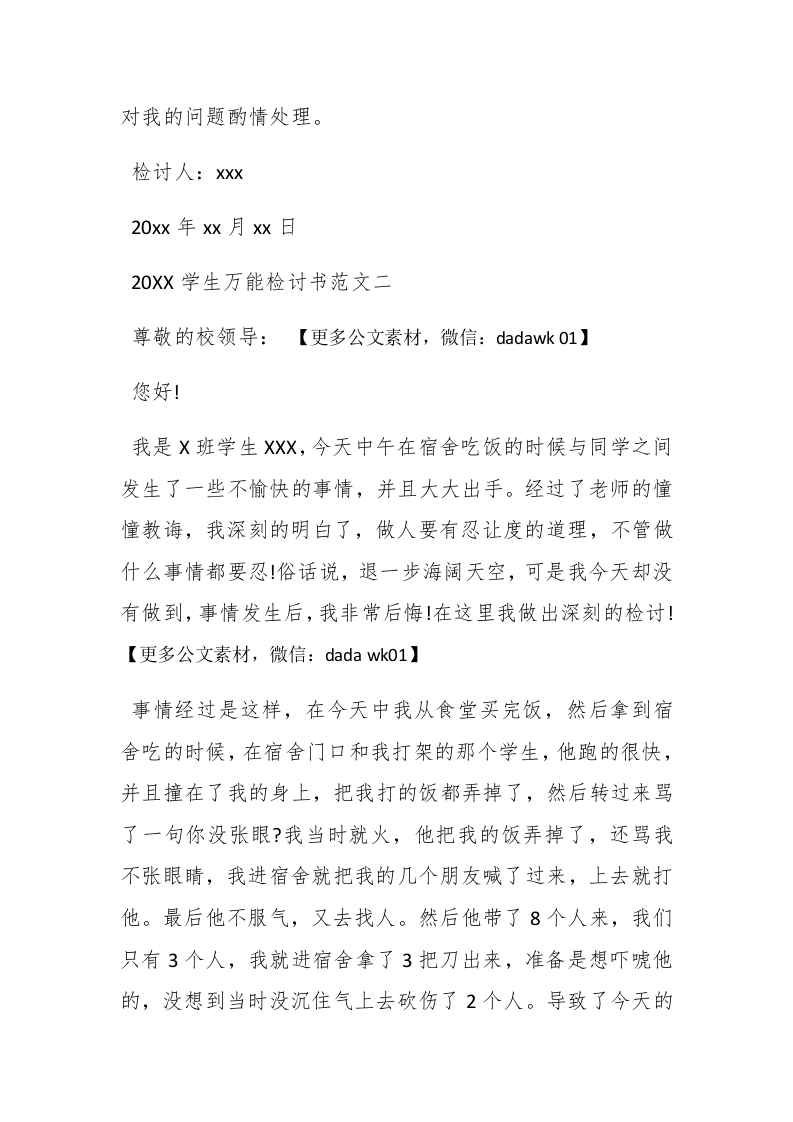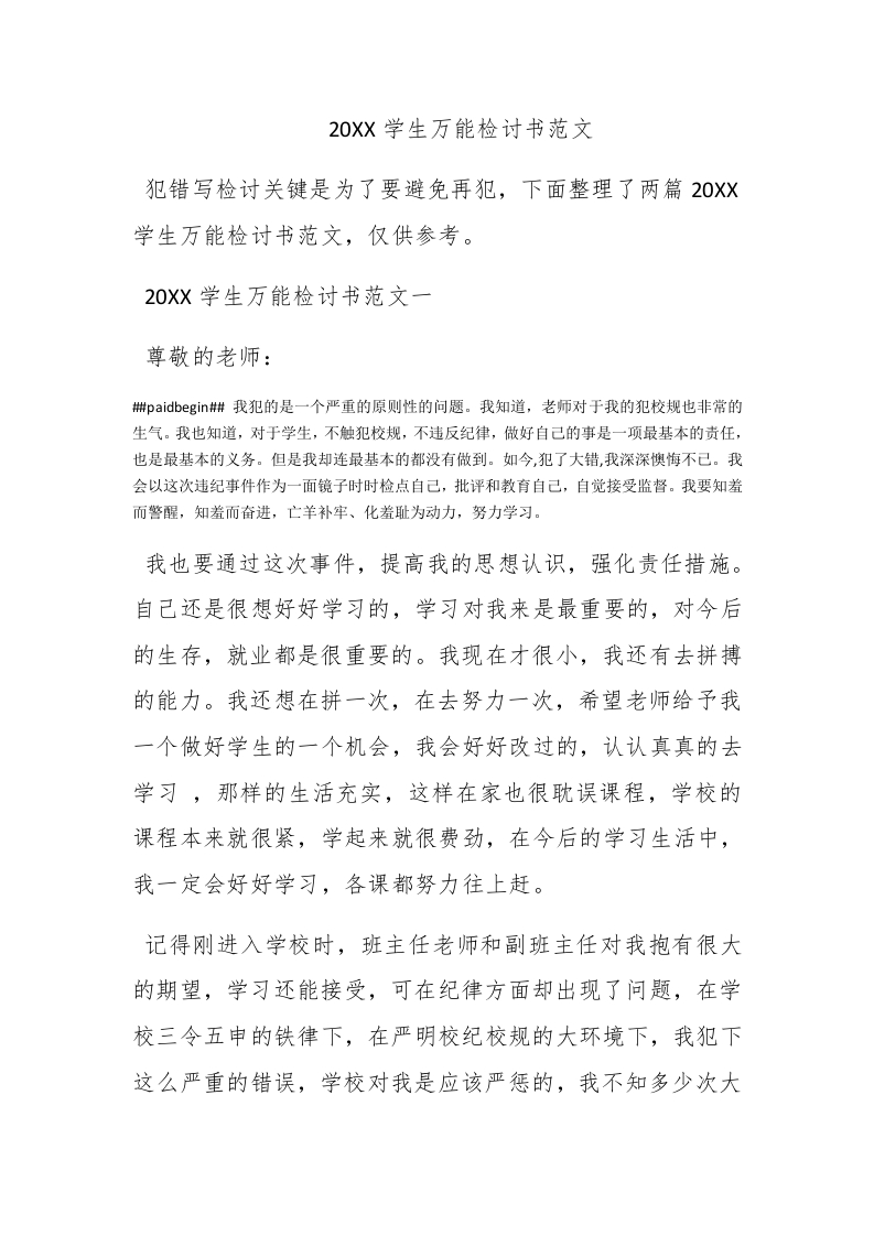 20Xx学生万能检讨书范文犯错写检讨关键是为了要避免再犯,下面整理了两篇20XX学生万能检讨书范文,仅供参考。20XX学生万能检讨书范文一尊敬的老师:排paidbegin#我犯的是一个严重的原则性的问题。我知道,老师对于我的犯校规也非常的生气。我也知道,对于学生,不触犯校规,不违反纪律,做好自己的事是一项最基本的责任,也是最基本的义务。但是我却连最基本的都没有做到。如今,犯了大错,我深深懊悔不己。我会以这次违纪事件作为一面镜子时时检点自己,批评和教育自己,自觉接受监督。我要知羞而警醒,知羞而奋进,亡羊补牢、化羞耻为动力,努力学习。我也要通过这次事件,提高我的思想认识,强化责任措施。自己还是很想好好学习的,学习对我来是最重要的,对今后的生存,就业都是很重要的。我现在才很小,我还有去拼搏的能力。我还想在拼一次,在去努力一次,希望老师给予我一个做好学生的一个机会,我会好好改过的,认认真真的去学习,那样的生活充实,这样在家也很耽误课程,学校的课程本来就很紧,学起来就很费劲,在今后的学习生活中,我一定会好好学习,各课都努力往上赶。记得刚进入学校时,班主任老师和副班主任对我抱有很大的期望,学习还能接受,可在纪律方面却出现了问题,在学校三令五申的铁律下,在严明校纪校规的大环境下,我犯下这么严重的错误,学校对我是应该严惩的,我不知多少次大