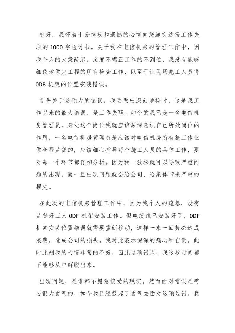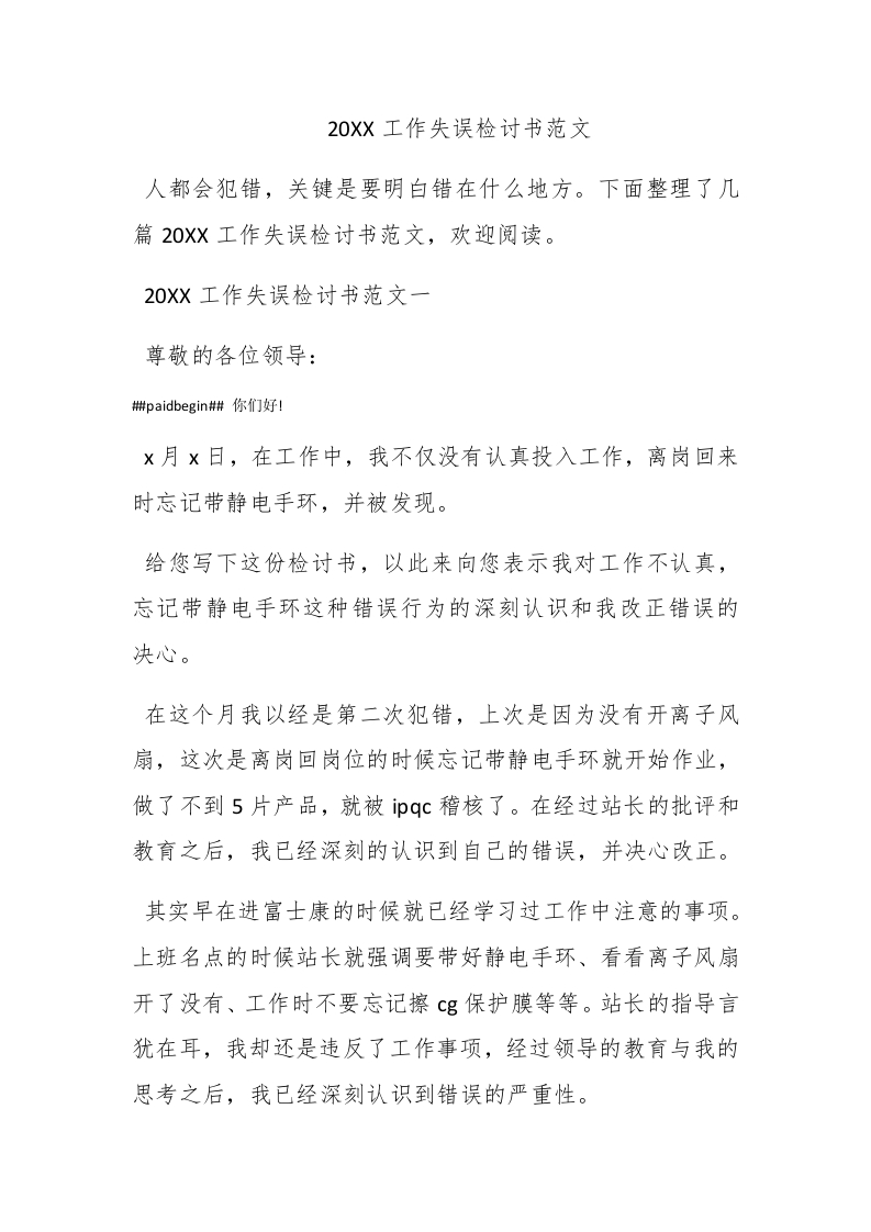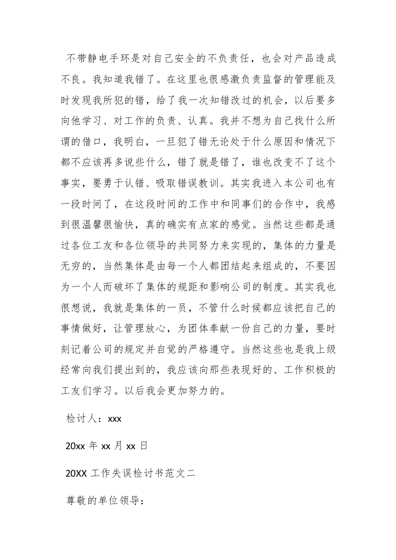 20Xx工作失误检讨书范文人都会犯错,关键是要明白错在什么地方。下面整理了几篇20XX工作失误检讨书范文,欢迎阅读。20XX工作失误检讨书范文一尊敬的各位领导:#paidbegin#你们好Ix月x日,在工作中,我不仅没有认真投入工作,离岗回来时忘记带静电手环,并被发现。给您写下这份检讨书,以此来向您表示我对工作不认真,忘记带静电手环这种错误行为的深刻认识和我改正错误的决心。在这个月我以经是第二次犯错,上次是因为没有开离子风扇,这次是离岗回岗位的时候忘记带静电手环就开始作业,做了不到5片产品,就被ipqc稽核了。在经过站长的批评和教育之后,我已经深刻的认识到自己的错误,并决心改正。其实早在进富士康的时候就已经学习过工作中注意的事项。上班名点的时候站长就强调要带好静电手环、看看离子风扇开了没有、工作时不要忘记擦Cg保护膜等等。站长的指导言犹在耳,我却还是违反了工作事项,经过领导的教育与我的思考之后,我已经深刻认识到错误的严重性。
