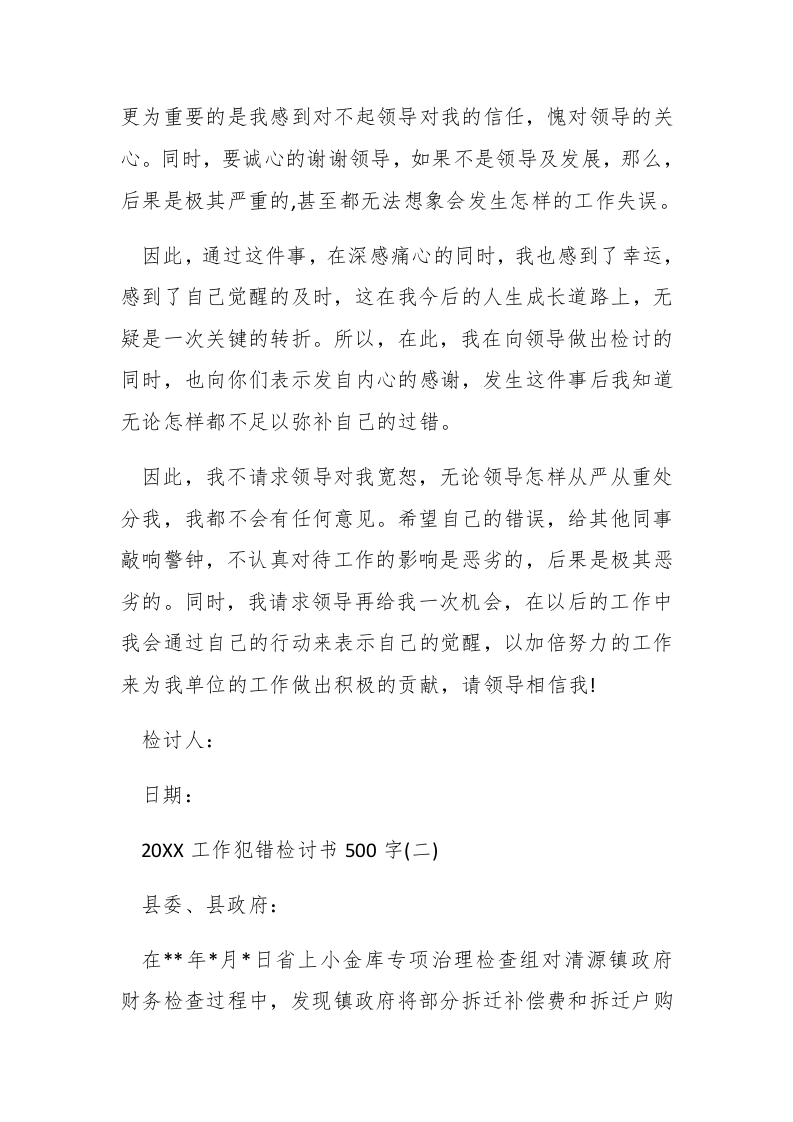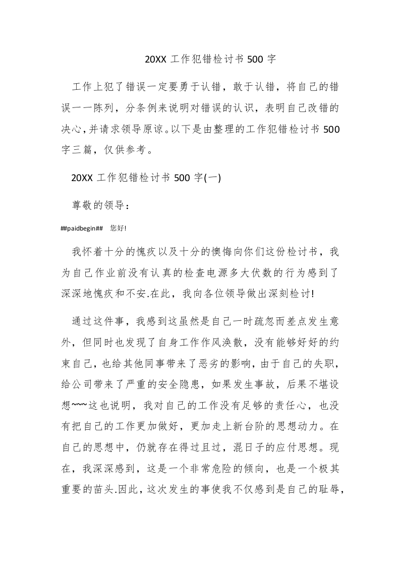 20XX工作犯错检讨书500字工作上犯了错误一定要勇于认错,敢于认错,将自己的错误一一陈列,分条例来说明对错误的认识,表明自己改错的决心,并请求领导原谅。以下是由整理的工作犯错检讨书500字三篇,仅供参考。20XX工作犯错检讨书500字(一)尊敬的领导:#paidbegin#您好!我怀着十分的愧疚以及十分的懊悔向你们这份检讨书,我为自己作业前没有认真的检查电源多大伏数的行为感到了深深地愧疚和不安.在此,我向各位领导做出深刻检讨!通过这件事,我感到这虽然是自己一时疏忽而差点发生意外,但同时也发现了自身工作作风涣散,没有能够好好的约束自己,也给其他同事带来了恶劣的影响,由于自己的失职,给公司带来了严重的安全隐患,如果发生事故,后果不堪设想这也说明,我对自己的工作没有足够的责任心,也没有把自己的工作更加做好,更加走上新台阶的思想动力。在自己的思想中,仍就存在得过且过,混日子的应付思想。现在,我深深感到,这是一个非常危险的倾向,也是一个极其重要的苗头.因此,这次发生的事使我不仅感到是自己的耻辱,