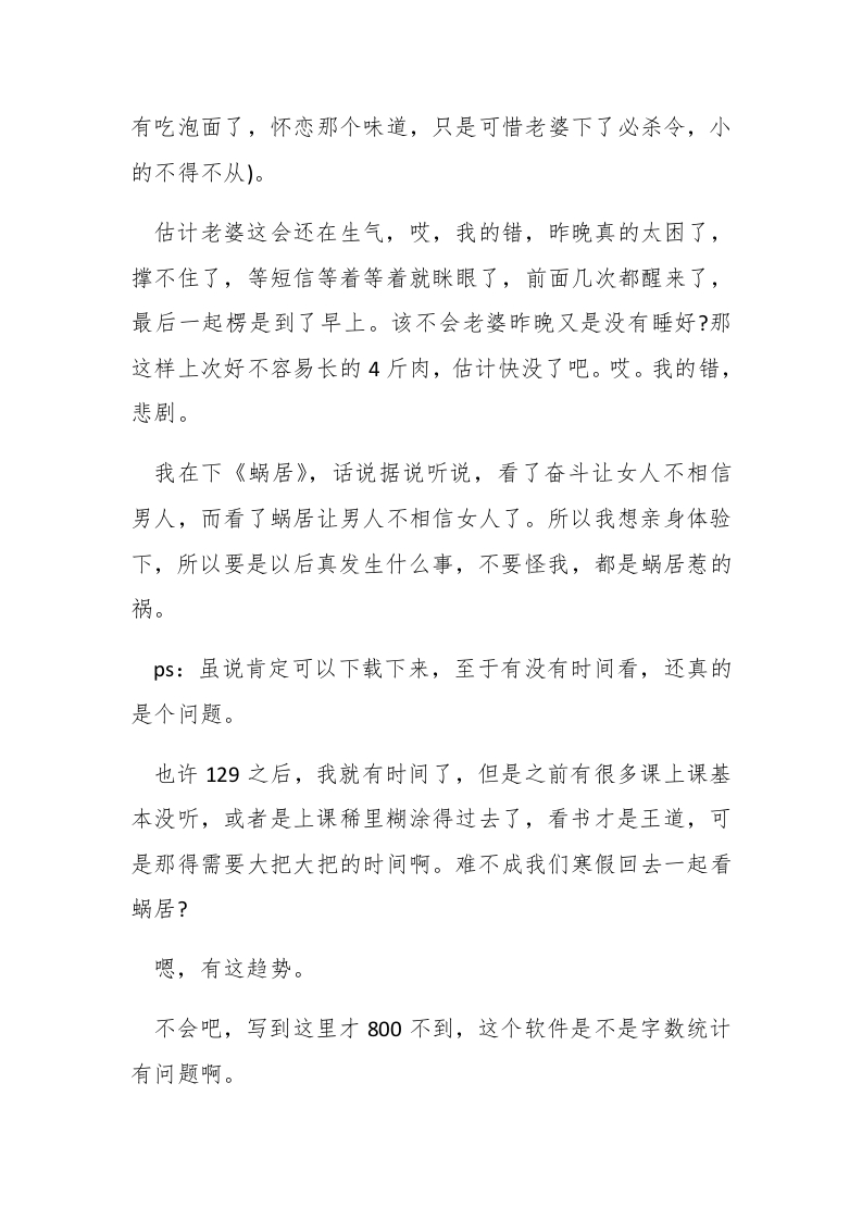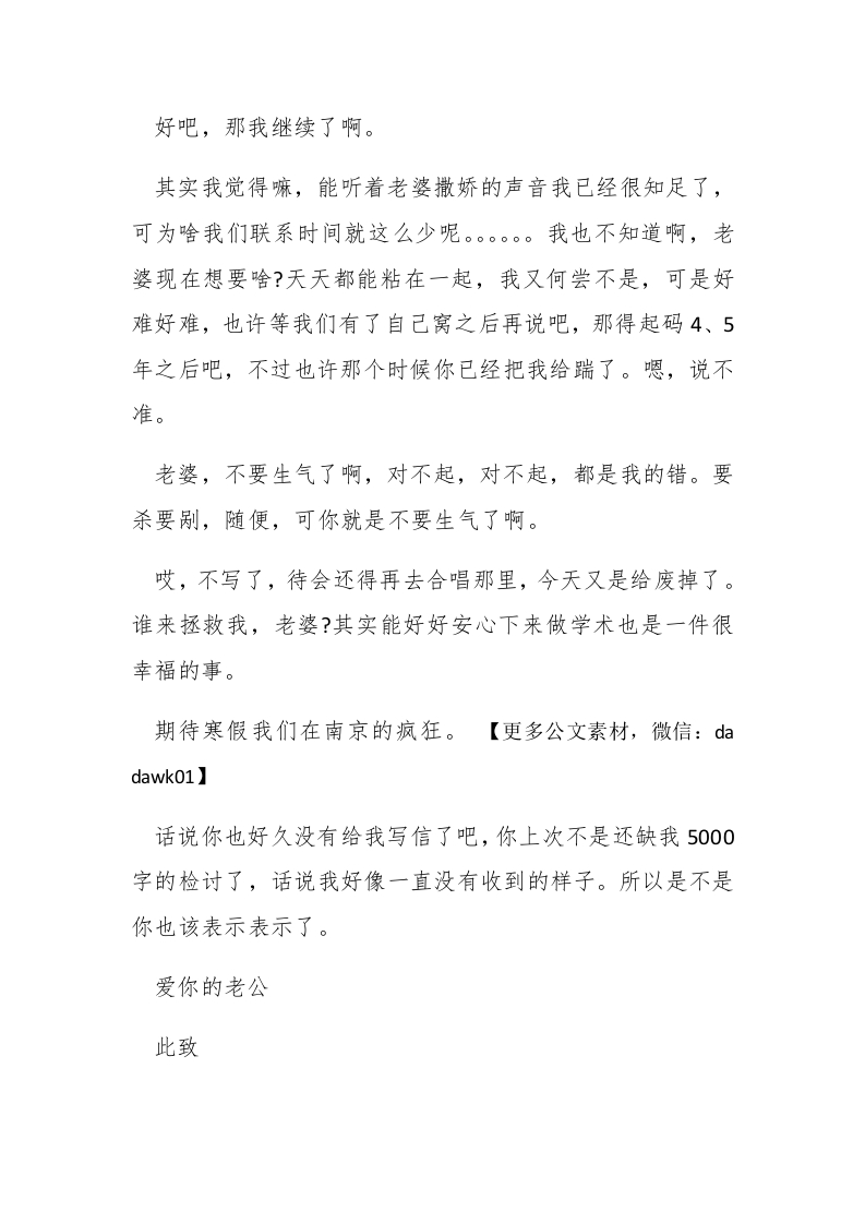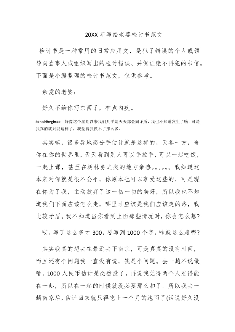 20XX年写给老婆检讨书范文检讨书是一种常用的日常应用文,是犯了错误的个人或领导向当事人或组织写出的检讨错误、并保证绝不再犯的书信。下面是小编整理的检讨书范文,仅供参考。亲爱的老婆:好久不给你写东西了,有点内疚。#paidbegin#好像这个星期以来我们几乎是天天都会闹矛盾,我也不知道发生了啥,可是我真的就只能这样了,我觉得我做不了那么多。其实嘛,很多异地恋分手估计就是这样的,天各一方,当你在你的世界里,天天看到别人可以手拉手,可以一起吃饭,一起上课,甚至在树林旁之类的地方亲热。。。。我知道这本来对你就是很不公平,你原本也可以享受这些的,可是现在你为了我,主动放弃了这一切一切的美好,所以我也不知道我们下面应该怎么走,哪里才应该是我们应该走的路,我比较矛盾。我不知道当你看到上面那些情况时,你会怎么想?哎,写了这么多才300,要写到1000个字,咋就这么难呢?其实我真的想去在最近去下南京,可是真真的没有时间,而且还有个问题我一直没有说,钱是个问题。去一趟不说做啥,1000人民币估计是必然没了。再说我觉得两个人难得能在一起,所以在一起的时候就没必要那么扣了。所以我去一趟南京后,估计回来就只得吃上一个月的泡面了(话说好久没
