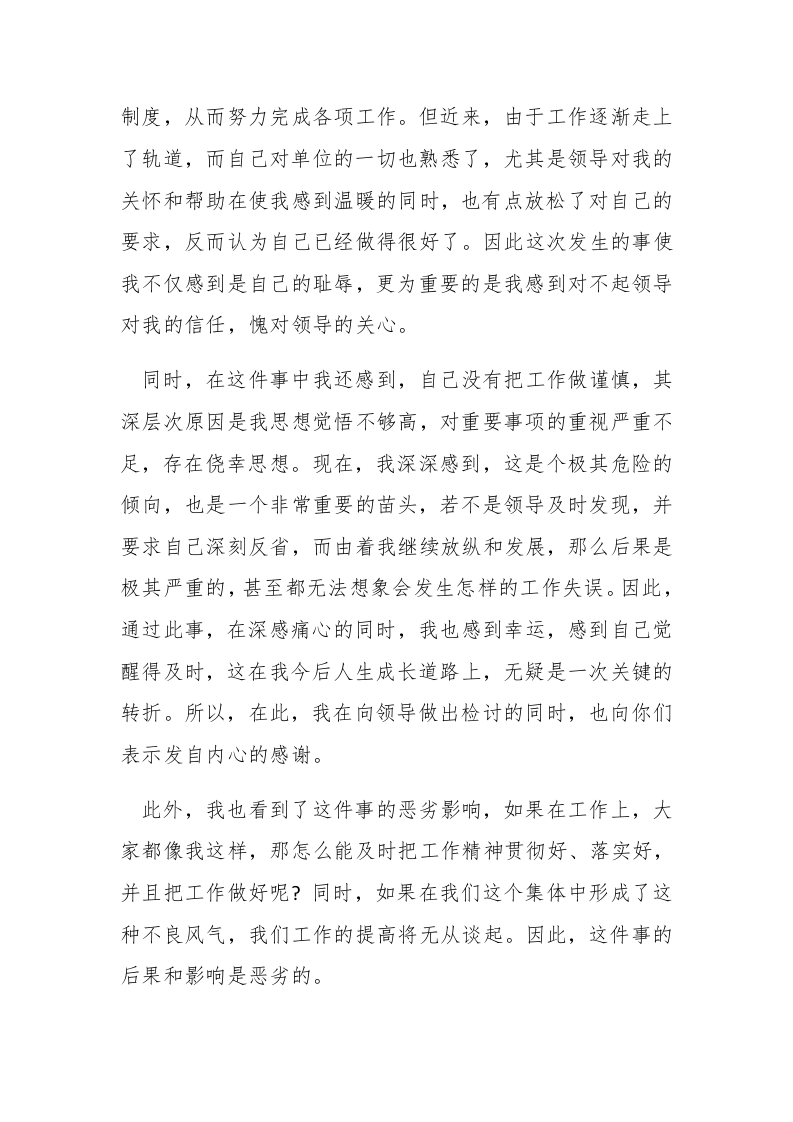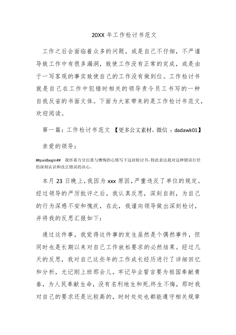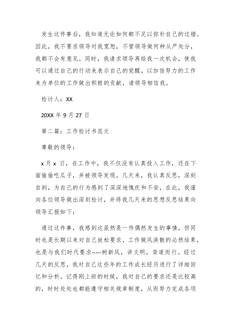 20XX年工作检讨书范文工作之后会面临着众多的问题,或是自己不仔细,不严谨导致工作中有很多漏洞,致使工作没有正常的完成,或是由于一写客观的事实致使自己的工作没有做到位。工作检讨书就是自己在工作中犯错时相关的领导责令员工书写的一种自我反省的书面文体。下面为大家带来的是工作检讨书范文,欢迎阅读。第一篇:工作检讨书范文【更多公文素材,微信:dadawk01】亲爱的领导:郴paidbegin#我怀着万分沉重与懊悔的心情写下这封检讨书,特此表达我对这种错误行径的深刻认识和改正错误的决心。本月23日晚上,我因为xx原因,严重违反了单位的规定。经过领导的严厉批评之后,我认真反思,深刻自剖,为自己的行为深感不安和愧疚,在此,我谨向领导做出深刻检讨,并将我的反思汇报如下:通过这件事,我觉得这件事的发生虽然是个偶然事件,但同时也是长期以来对自己工作放松要求的必然结果。经过几天的反思,我对自己这些年的工作成长经历进行了详细回忆和分析,尤记刚上班那会儿,牢记毕业誓言要为祖国奉献青春,为人民奉献生命,没有名利地生和死.终生不悔,那时我对自己的要求还是比较高的,时时处处也都能遵守相关规章