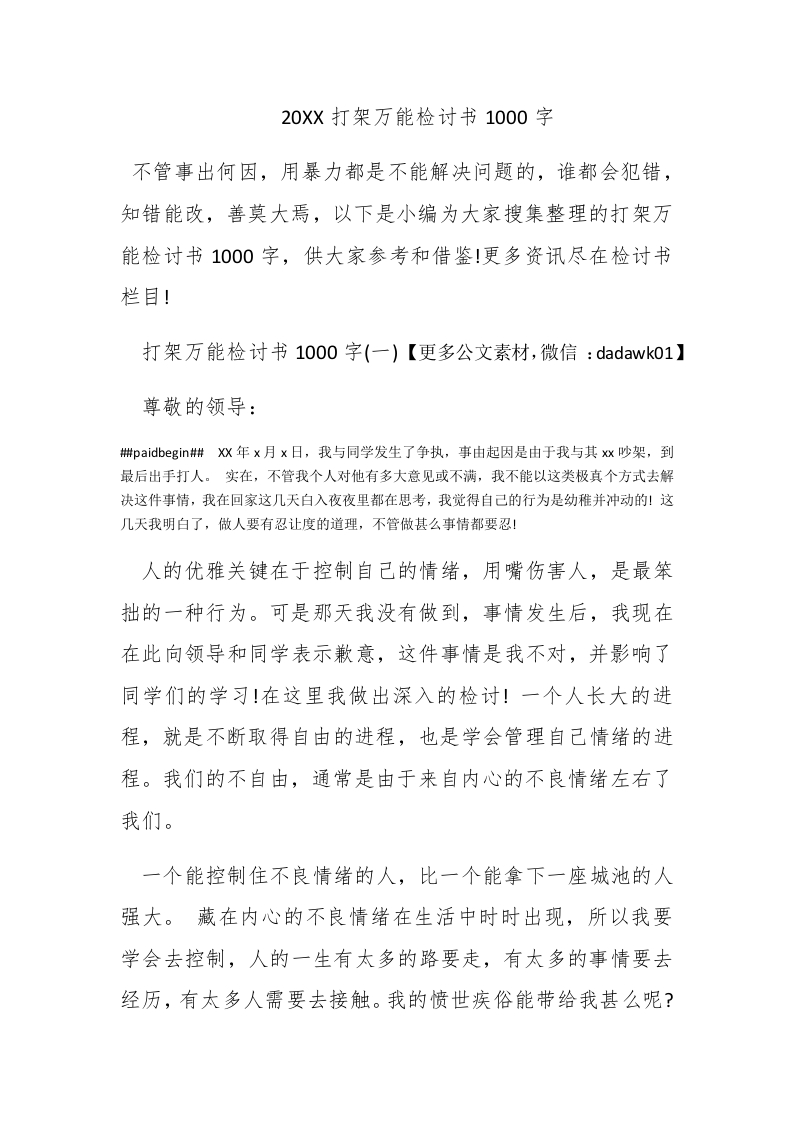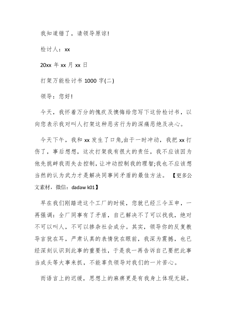 20Xx打架万能检讨书1000字不管事出何因,用暴力都是不能解决问题的,谁都会犯错,知错能改,善莫大焉,以下是小编为大家搜集整理的打架万能检讨书1000字,供大家参考和借鉴!更多资讯尽在检讨书栏目!打架万能检讨书1000字(一)【更多公文素材,微信:dadawk(01】尊敬的领导:排paidbegin#x年×月x日,我与同学发生了争执,事由起因是由于我与其x吵架,到最后出手打人。实在,不管我个人对他有多大意见或不满,我不能以这类极真个方式去解决这件事情,我在回家这几天白入夜夜里都在思考,我觉得自己的行为是幼稚并冲动的!这几天我明白了,做人要有忍让度的道理,不管做甚么事情都要忍!人的优雅关键在于控制自己的情绪,用嘴伤害人,是最笨拙的一种行为。可是那天我没有做到,事情发生后,我现在在此向领导和同学表示歉意,这件事情是我不对,并影响了同学们的学习!在这里我做出深入的检讨!一个人长大的进程,就是不断取得自由的进程,也是学会管理自己情绪的进程。我们的不自由,通常是由于来自内心的不良情绪左右了我们。一个能控制住不良情绪的人,比一个能拿下一座城池的人强大。藏在内心的不良情绪在生活中时时出现,所以我要学会去控制,人的一生有太多的路要走,有太多的事情要去经历,有太多人需要去接触。我的愤世疾俗能带给我甚么呢?