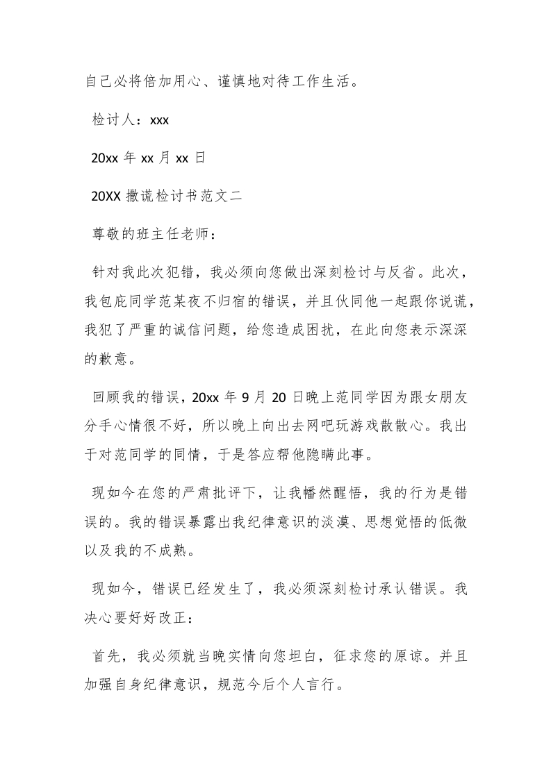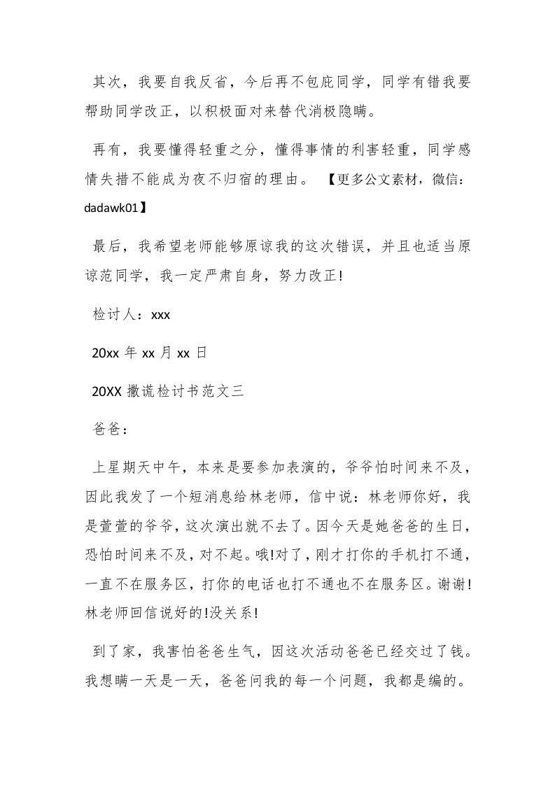 20XX撒谎检讨书范文我们一生中必定都撒过这样那样的谎,但发现错了我们依然是需要改正的,下面整理了几篇学生撒谎检讨书范文,欢迎阅读。20XX撒谎检讨书范文一【更多公文素材,微信:dad awk01】尊敬的单位领导:郴paidbegin#您好,作为公司的员工,为我没有遵守诚信,这是一个很严重的事情,这个错误是很大的,我痛心疾首,我对自己的错误进行了深刻的反省。此次,工作期间外出,领导问起,我却帮助班长编出种种借口隐瞒实情。我这样的行为是严重地违反工作纪律,也是对领导的欺骗,是对领导的不尊重。我的错误,充分暴露出我工作纪律意识不强,(打架检讨书)做事做人不够稳妥,处事经验还不足够。面对错误,我真的悔不当初。为此,我深刻总结经验教训,决心竭力悔改:第一,我要正视自己的工作纪律问题,再次认真学习相关工作条例、规章纪律。从今往后自己不做有违工作规章的事,也绝不再帮助其他人欺骗领导。第二,针对我办事不够稳妥的情况,我在吸取本次错误经验教训之后,必将重新审视自身,努力办事不稳妥的缺点,