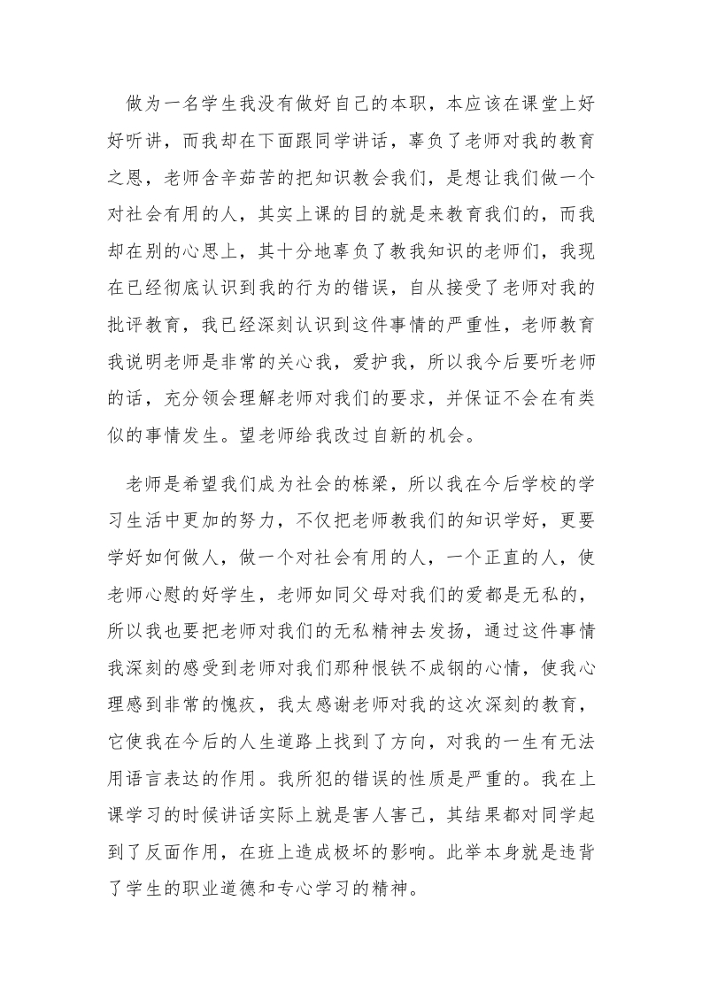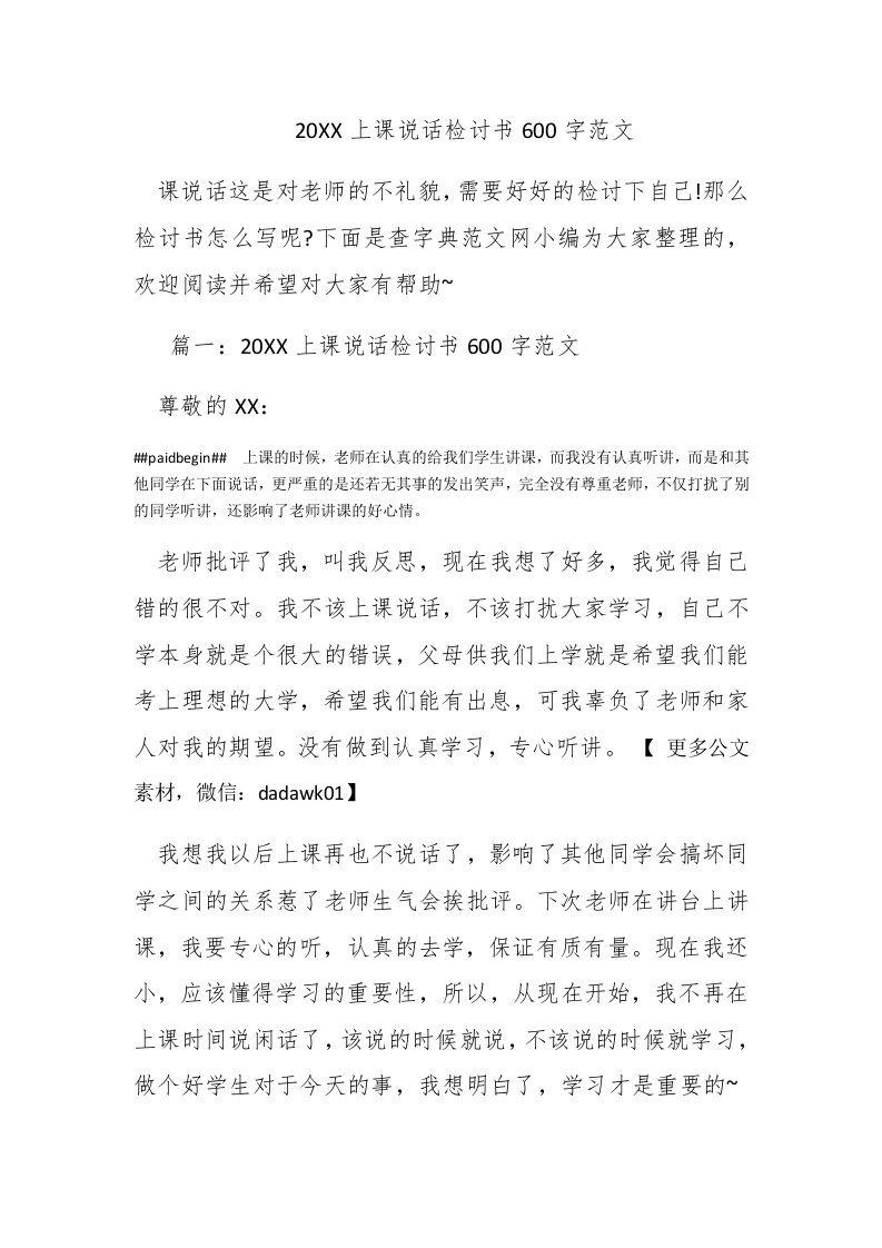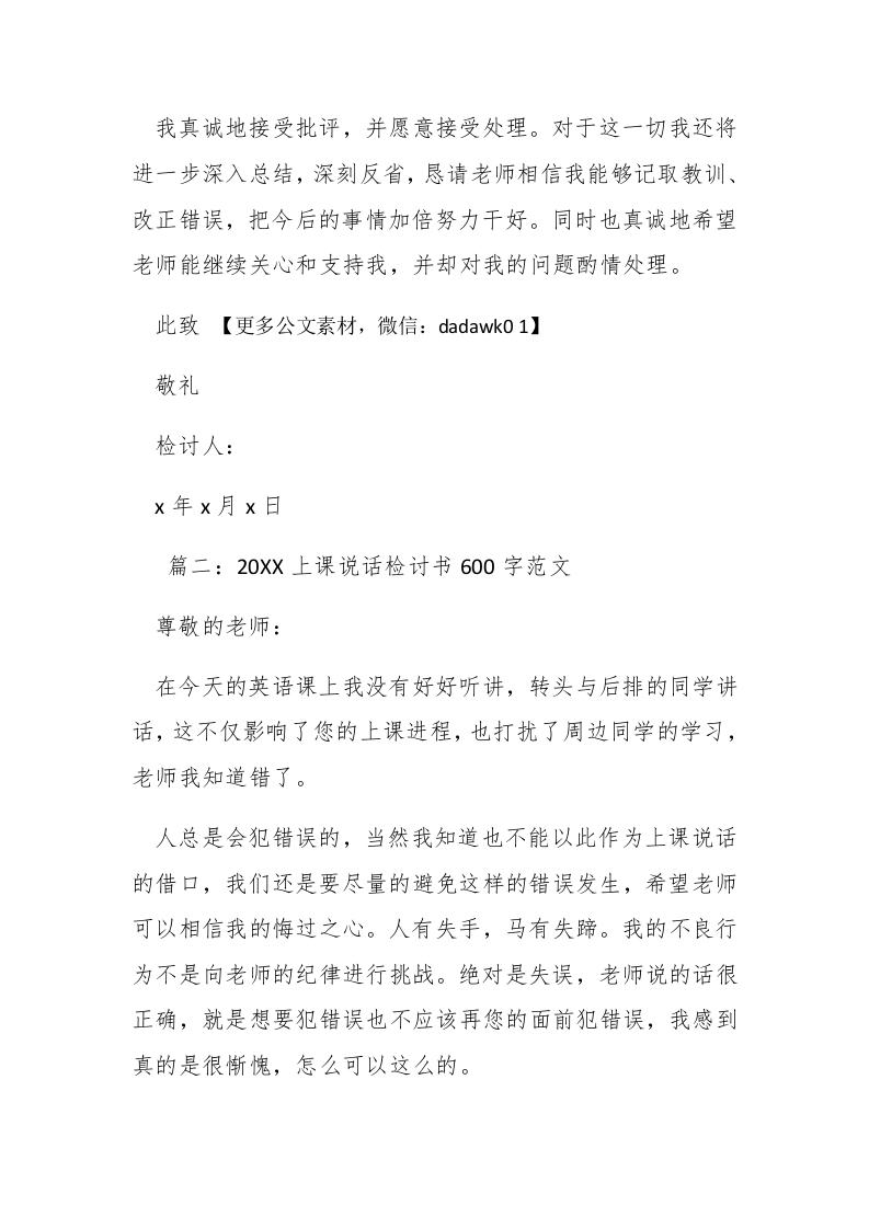 20XX上课说话检讨书600字范文课说话这是对老师的不礼貌,需要好好的检讨下自己!那么检讨书怎么写呢?下面是查字典范文网小编为大家整理的,欢迎阅读并希望对大家有帮助~篇一:20XX上课说话检讨书600字范文尊敬的XX:郴paidbegin#上课的时候,老师在认真的给我们学生讲课,而我没有认真听讲,而是和其他同学在下面说话,更严重的是还若无其事的发出笑声,完全没有尊重老师,不仅打扰了别的同学听讲,还影响了老师讲课的好心情。老师批评了我,叫我反思,现在我想了好多,我觉得自己错的很不对。我不该上课说话,不该打扰大家学习,自己不学本身就是个很大的错误,父母供我们上学就是希望我们能考上理想的大学,希望我们能有出息,可我辜负了老师和家人对我的期望。没有做到认真学习,专心听讲。【更多公文素材,微信:dadawk0:1】我想我以后上课再也不说话了,影响了其他同学会搞坏同学之间的关系惹了老师生气会挨批评。下次老师在讲台上讲课,我要专心的听,认真的去学,保证有质有量。现在我还小,应该懂得学习的重要性,所以,从现在开始,我不再在上课时间说闲话了,该说的时候就说,不该说的时候就学习,做个好学生对于今天的事,我想明白了,学习才是重要的