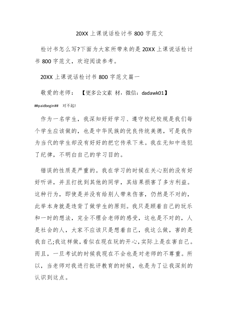 20XX上课说话检讨书800字范文检讨书怎么写?下面为大家所带来的是20XX上课说话检讨书800字范文,欢迎阅读参考。20XX上课说话检讨书800字范文篇一敬爱的老师:【更多公文素材,微信:dadawk01】#paidbegin#对不起I作为一名学生,我深知好好学习、遵守校纪校规是我们每个学生应该做的,也是中华民族的优良传统美德,可是我作为当代的学生却没有好好的把它传承下来。我在无知中违犯了纪律,不明白自己的学习目的。错误的性质是严重的。我在学习的时候在关心别的没有好好听讲,并且打扰到其他的同学,其结果损害了多方利益。这种行为,即使是并没有给别人带来伤害,仍然是不对的,此举本身就是违背了做学生的原则。我只是顾着自己的玩乐和一时的想法,完全不理会老师的感受,这也是不对的,人是社会的人,大家不应该只是想着自己,我这么做,害的是我自己;我这样做,看似在现在玩的开心,实际上是在害自己。而且,一旦考试的时候我现在不会也是对老师的不尊重。所以,当老师对我进行批评教育的时候,也是为了让我深刻的认识到这点。