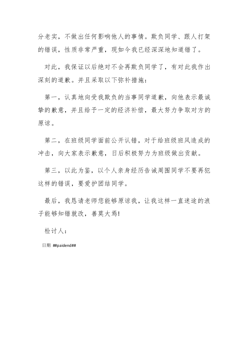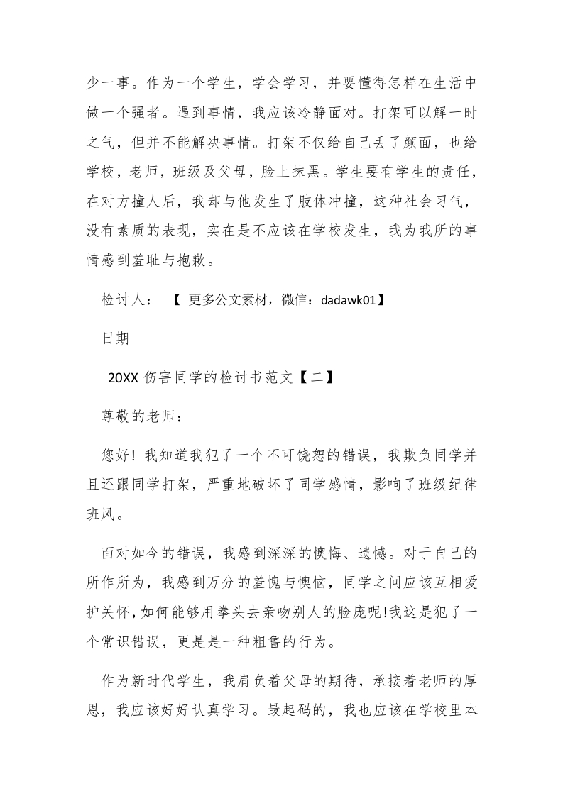 20XX伤害同学的检讨书范文作为一名学生,就要有学生的样子,团结,友爱,是我们的本分。冲动不能解决任何事情,相反会弄巧成拙,破坏同学关系,失去老师信任。以下是小编为大家整理的20XX伤害同学的检讨书范文,文章内容仅供参考,想要知道更多的资讯,请多多留意查字典范文网!20XX伤害同学的检讨书范文【一】尊敬的老师:#paidbegin#您好l我是xx班的xx,我怀着十二万分的愧疚以及十二万分的懊悔写下这份检讨书,以向您表示我对打架这种恶劣行为的深痛恶绝及打死也不再违纪的决心。回想起昨天发生的打架事情,让我后悔不已。作为一名在校学生,打架斗殴实属不对。作为一名学生,就要有学生的样子,团结,友爱,是我们的本分。冲动不能解决任何事情,相反会弄巧成拙,破坏同学关系,失去老师信任。我对我的做法感到愧疚。在此,写此书以示悔过。【更多公文素材,微信:dadawk01】事情经过是这样的,(说一大堆经过)虽然事情的起因并不在我,但我动手打人,就是我的错。不管发生什么事情,心平气和的讲明白,就可以大事化小,小事化了。多一事不如