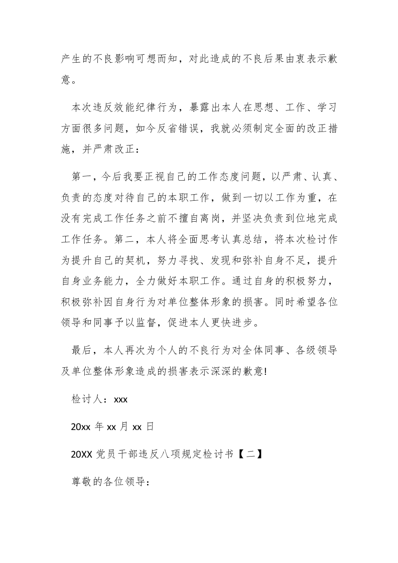 20Xx党员干部违反八项规定检讨书为大家整理了20Xx党员干部违反八项规定检讨书范文,欢迎阅读参考。20XX党员干部违反八项规定检讨书【一】尊敬的领导、各位同事:郴paidbegin#今天,我满怀愧疚和懊悔写下这份检讨书,以表达我对违反机关管理制度的忏悔之心。对因我个人行为给单位领导和同事造成的困扰,深感抱歉。【更多公文素材,微信:dada wk01】首先,本次违反效能纪律的行为根源于自身思想浮躁、作风浮躁、纪律意识淡薄,未能真正树立责任意识、集体意识、群众观点,未能恪守机关管理制度和工作纪律。由于平时疏于对效能建设相关文件学习,思想上对机关效能建设未能认识到位,直接导致行动上不能跟进,以至于虽然自身在日常工作中已有违反效能建设要求和工作纪律的行为,却没有发现和认识到事情的严重性,最终导致在此次集体活动中出现大问题。这与本人效能建设思想认识不到位以及疏于效能知识学习有密不可分的关系,本人将认真补习相关知识,提升思想认识,恪守工作纪律,杜绝类似行为的出现。【更多公文素材,微信:dadawk01】其次,本次违反效能纪律的行为反映出本人个人自制力较