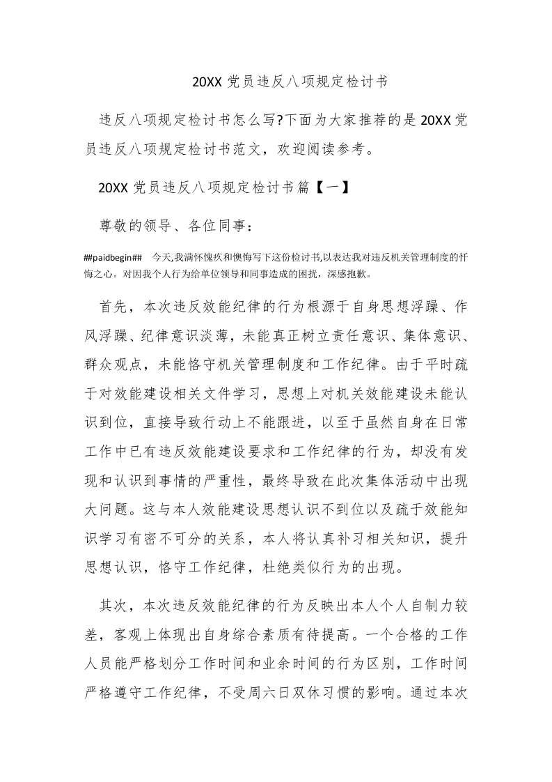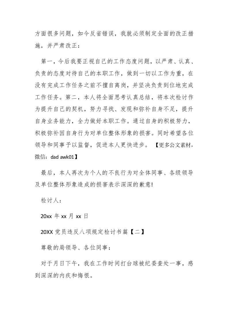 20XX党员违反八项规定检讨书违反八项规定检讨书怎么写?下面为大家推荐的是20XX党员违反八项规定检讨书范文,欢迎阅读参考。20Xx党员违反八项规定检讨书篇【一】尊敬的领导、各位同事:郴paidbegin#今天,我满怀愧疚和懊悔写下这份检讨书,以表达我对违反机关管理制度的忏悔之心。对因我个人行为给单位领导和同事造成的困扰,深感抱歉。首先,本次违反效能纪律的行为根源于自身思想浮躁、作风浮躁、纪律意识淡薄,未能真正树立责任意识、集体意识、群众观点,未能恪守机关管理制度和工作纪律。由于平时疏于对效能建设相关文件学习,思想上对机关效能建设未能认识到位,直接导致行动上不能跟进,以至于虽然自身在日常工作中已有违反效能建设要求和工作纪律的行为,却没有发现和认识到事情的严重性,最终导致在此次集体活动中出现大问题。这与本人效能建设思想认识不到位以及疏于效能知识学习有密不可分的关系,本人将认真补习相关知识,提升思想认识,恪守工作纪律,杜绝类似行为的出现。其次,本次违反效能纪律的行为反映出本人个人自制力较差,客观上体现出自身综合素质有待提高。一个合格的工作人员能严格划分工作时间和业余时间的行为区别,工作时间严格遵守工作纪律,不受周六日双休习惯的影响。通过本次