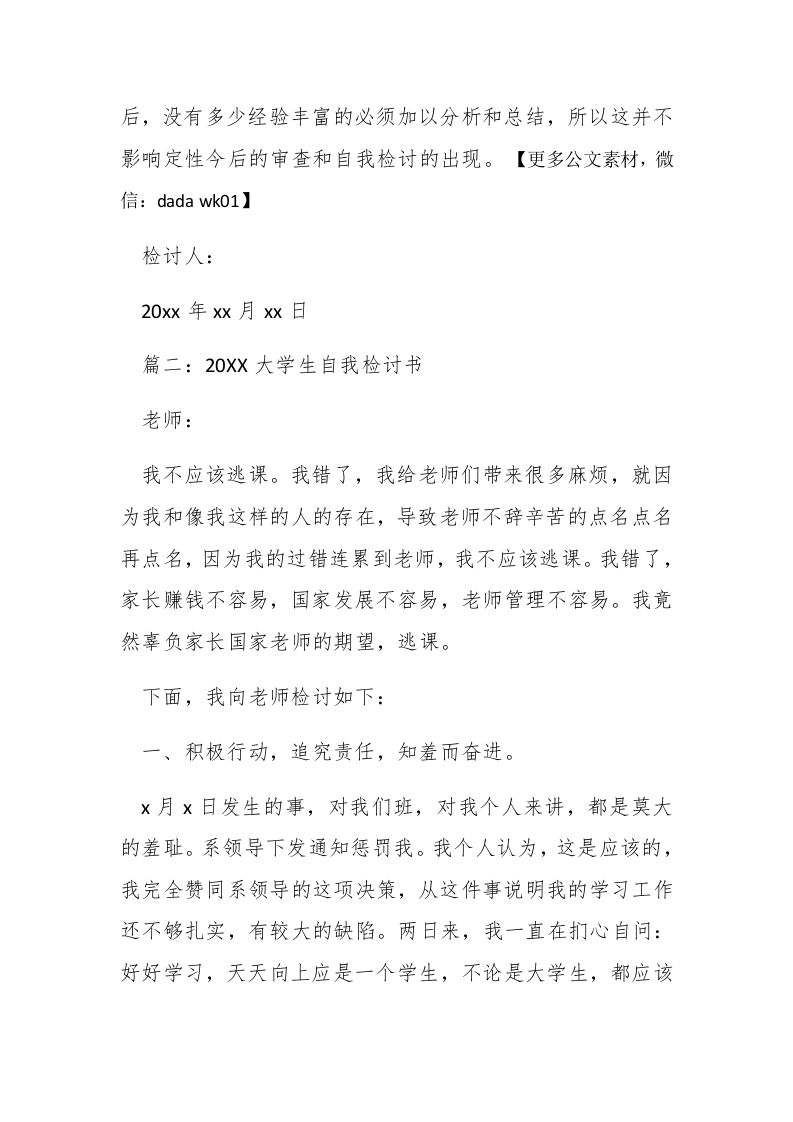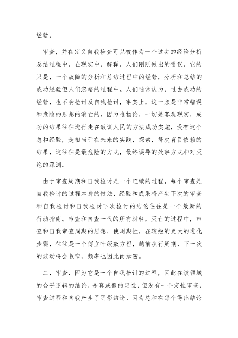 20Xx大学生自我检讨书只有通过自我检讨,我们才能更好发现自己,提升自己。下面为大家带来的是20XX大学生自我检讨书,欢迎参考。篇一:20XX大学生自我检讨书亲爱的老师:#paidbegin#您好随着21世纪时期的的到来,许多历史的痕迹将逐渐淡出,但只有与流通以来思维的产物,离开年的对象的思想。已审查和自我检讨,以提高自己的人作为一个必要的方式的的质量。通常人们快节奏的世界欺骗自己的内脏感觉外层层面纱,它是仅保留审查和自查,以创造的幻觉的面纱将被解除,是能够体现真正的本质,并避免幻觉的人得出错误的结果。所以,这里有必要审查的自我检讨。审查和自我检讨是一个循环的过程。所有与逻辑思维能力和自学考试,通过审查并得到进化或进步的对象,在动物研究中的动物王国的生存技能和自我检讨的过程审查。审查和自学考试必须首先生成一个实体的过往的分析结果的实体,然后来的结论,然后总结出的优化和改善的具体问题,并最终数字,正确的方法找到真正的结果。由于这些概念,往往是自我检查的事先审查并采取行动,然后得到的解决方案或