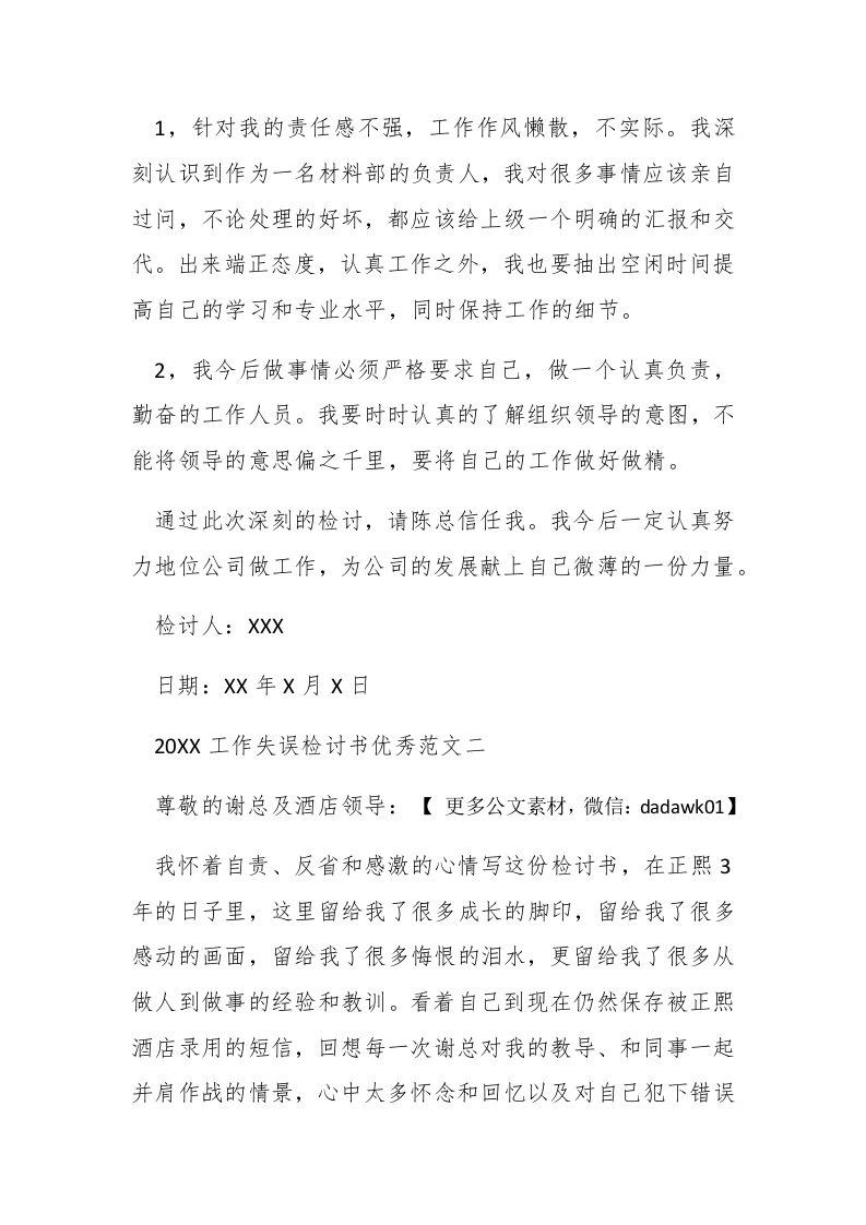 20XX工作失误检讨书优秀范文俗话说:人有失手马有失蹄,但是我们要吸取教训,写一份检讨书,给领导留下一个好印象,为大家带来的是20XX工作失误检讨书优秀范文,欢迎阅读参考。20XX工作失误检讨书优秀范文一尊敬的领导同志:郴paidbegin特#您好,我怀着无比愧疚和遗憾的心情向您递交这份工作失职的检讨书。关于在杭州下沙物美超市的综合楼建设项目的监督工作中,因我个人的疏忽,我没有能够充分地对工程全部材料的样本可实品做样品检查。没有认真核查账本,也没有在检查之后向您如实汇报。我可以说是犯了一个最低级,最原则性的错误。我有罪啊,连这么基础的工作都没有做好,没有根据您的要求,把项目的进展情况着实地向了领导汇报。给公司造成了很大的负面影响,也导致了一些损失,同时也愧疚陈总对我的信任和关照。但此次我通过自我反省,必须找出我工作失误的根本原因,我反思了一下。我犯错的根本原因在于,我自身这个马虎的性格,做事半心半意,敷衍了事。我知道这样的工作作风是极度危险的,这样的作风持续下去。很可能在未来造成更多更严重的错误。针对我的错误,我反省了如下几点改正措施: